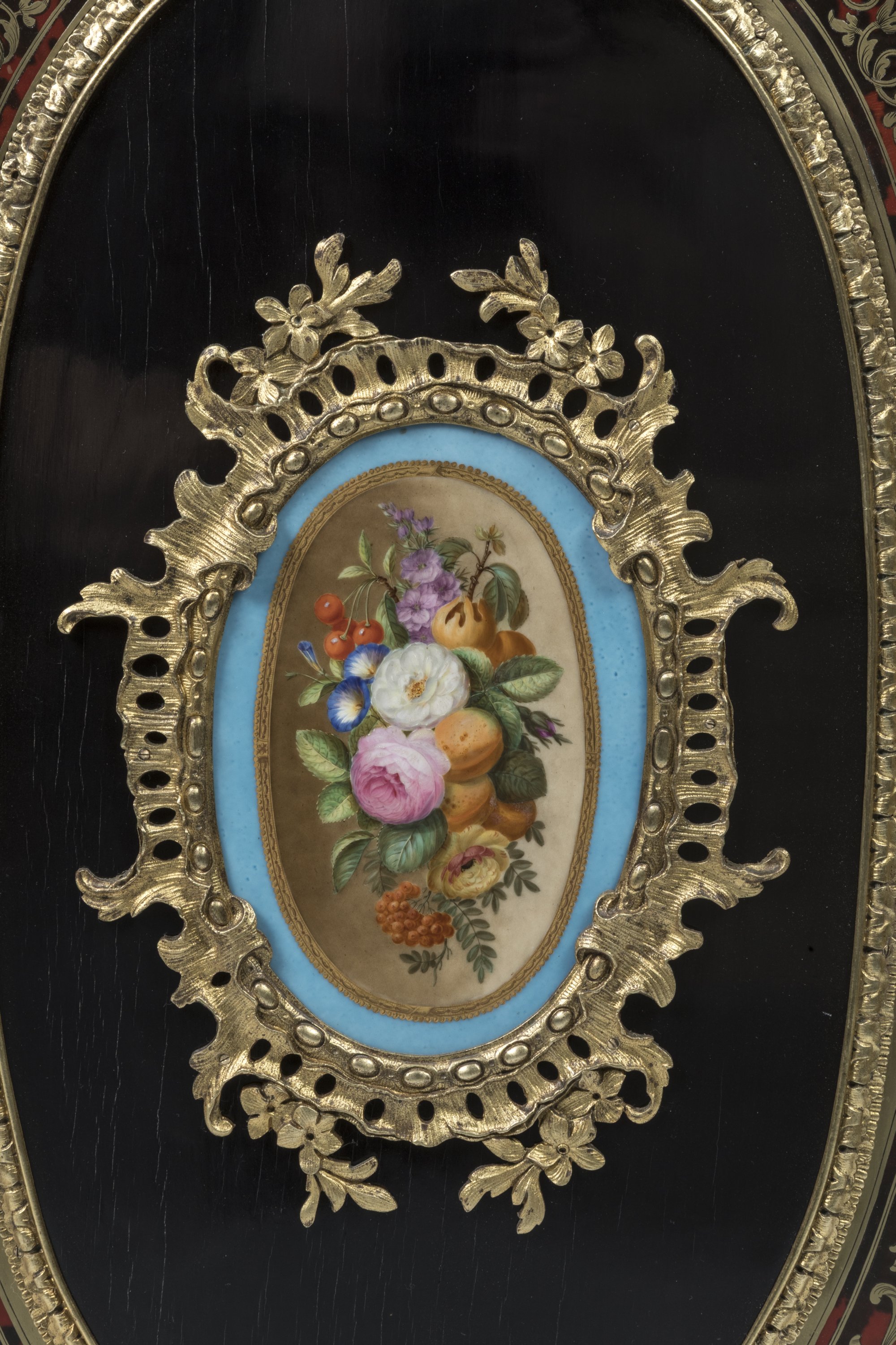 Poirier noirci et marqueterie dite "Boulle" en première partie de laiton sur fond d'écaille. Il ouvre par deux portes foncées d'un décor "à la Bérain" et plaques de porcelaine dans des médaillons figurant des bouquets de fruits et de fleurs dans des réserves.