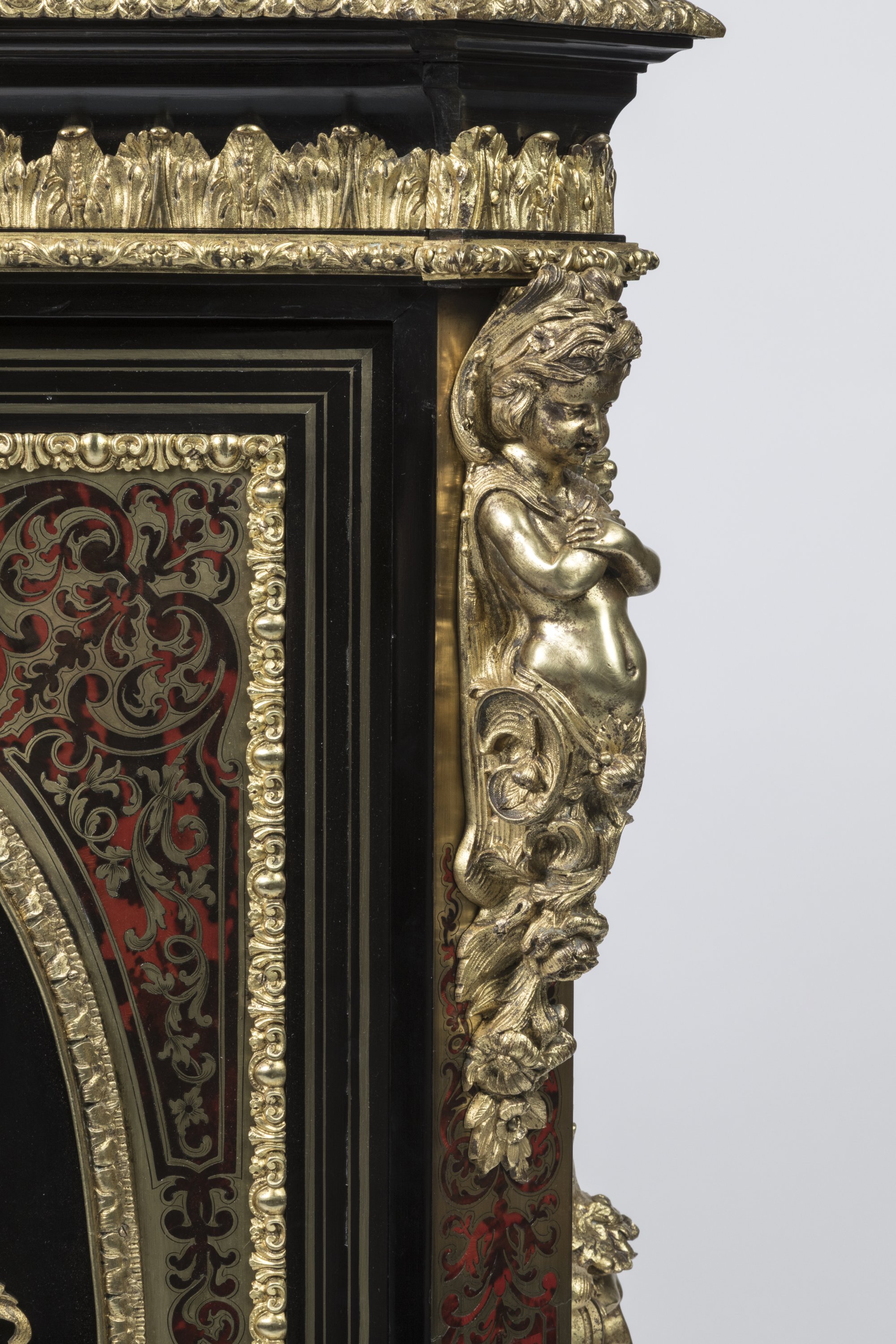 Riche ornementation en bronze doré aux arêtes, chutes d'angles aux chérubins, médaillons et mascarons et fleurs sur les côtés.
