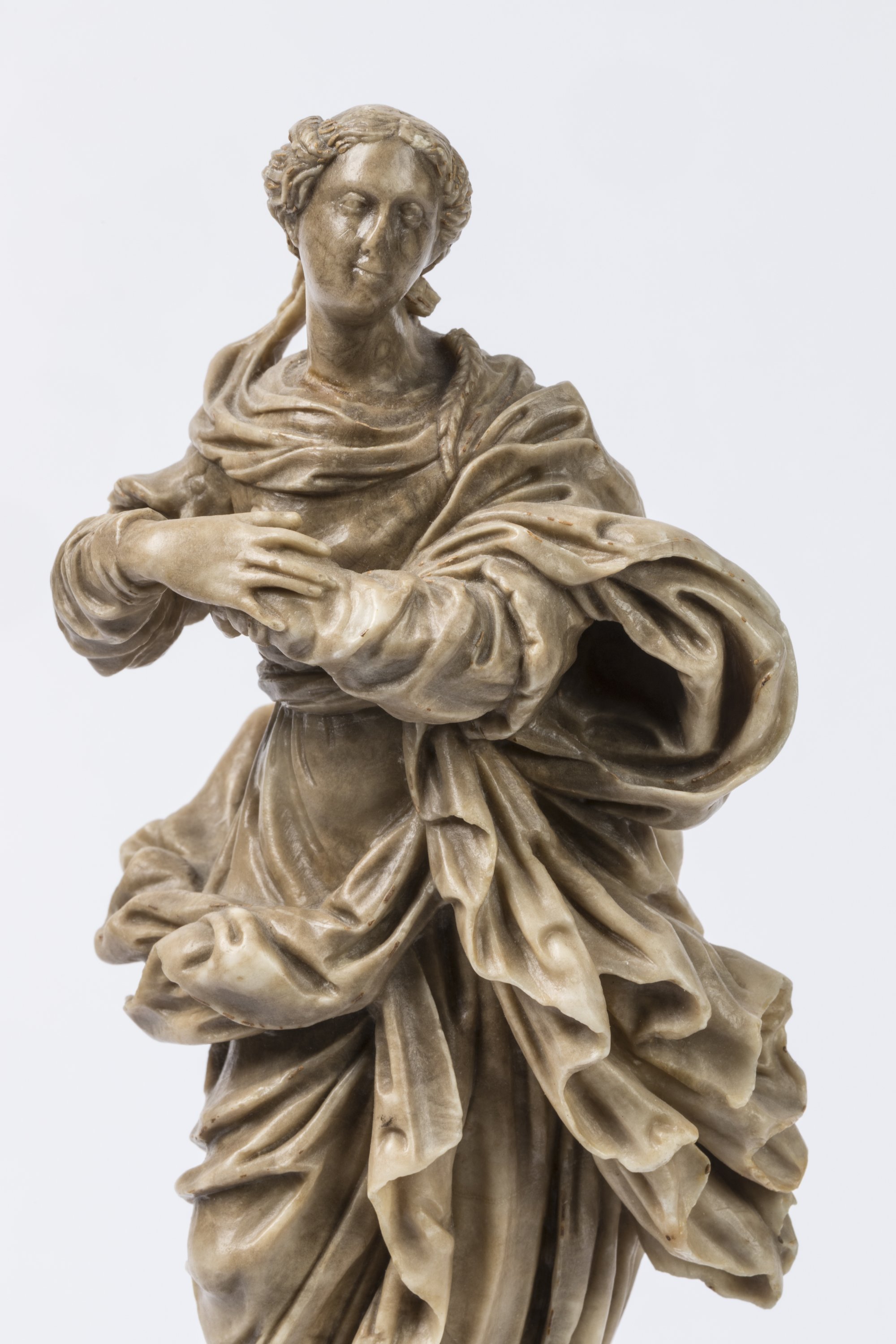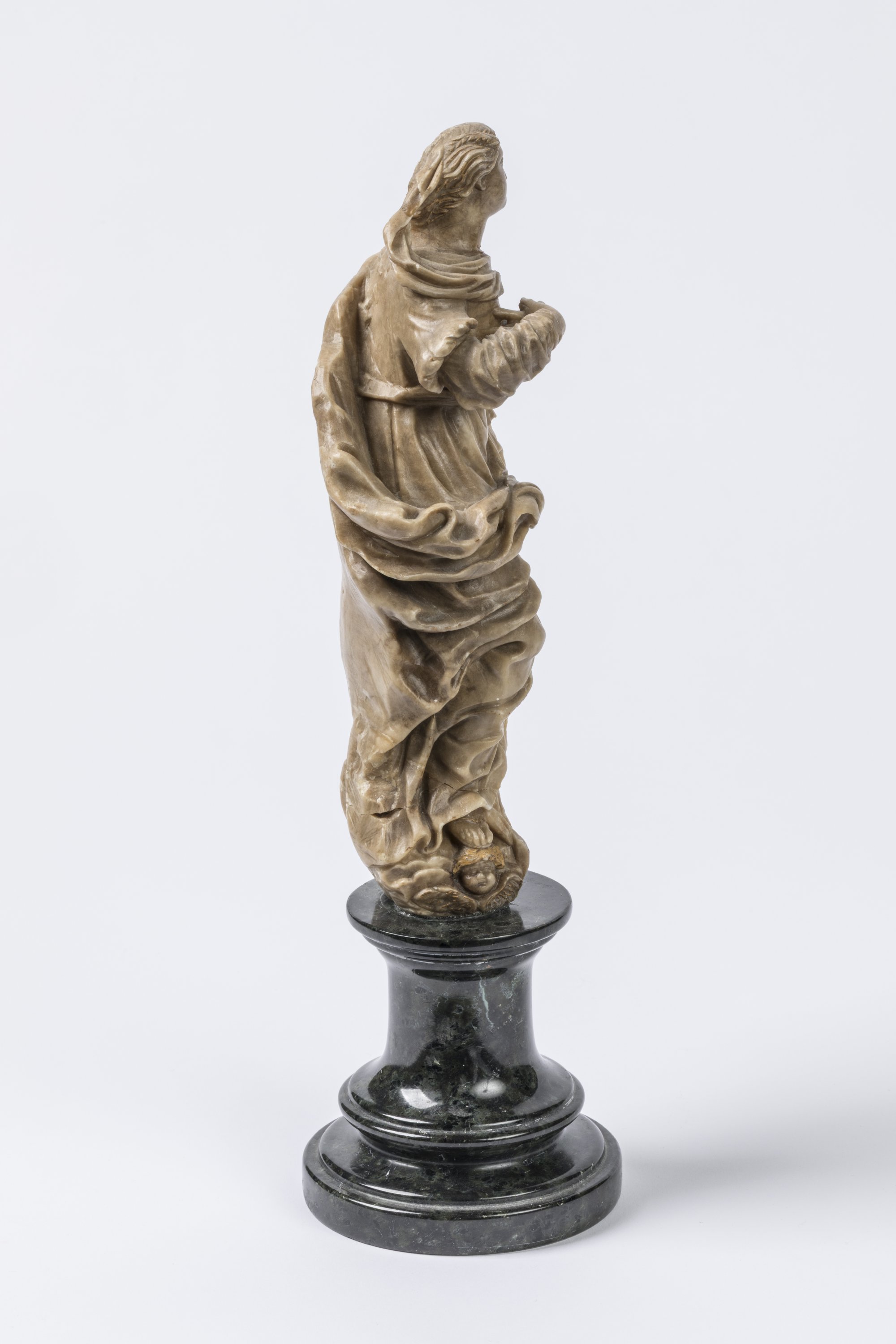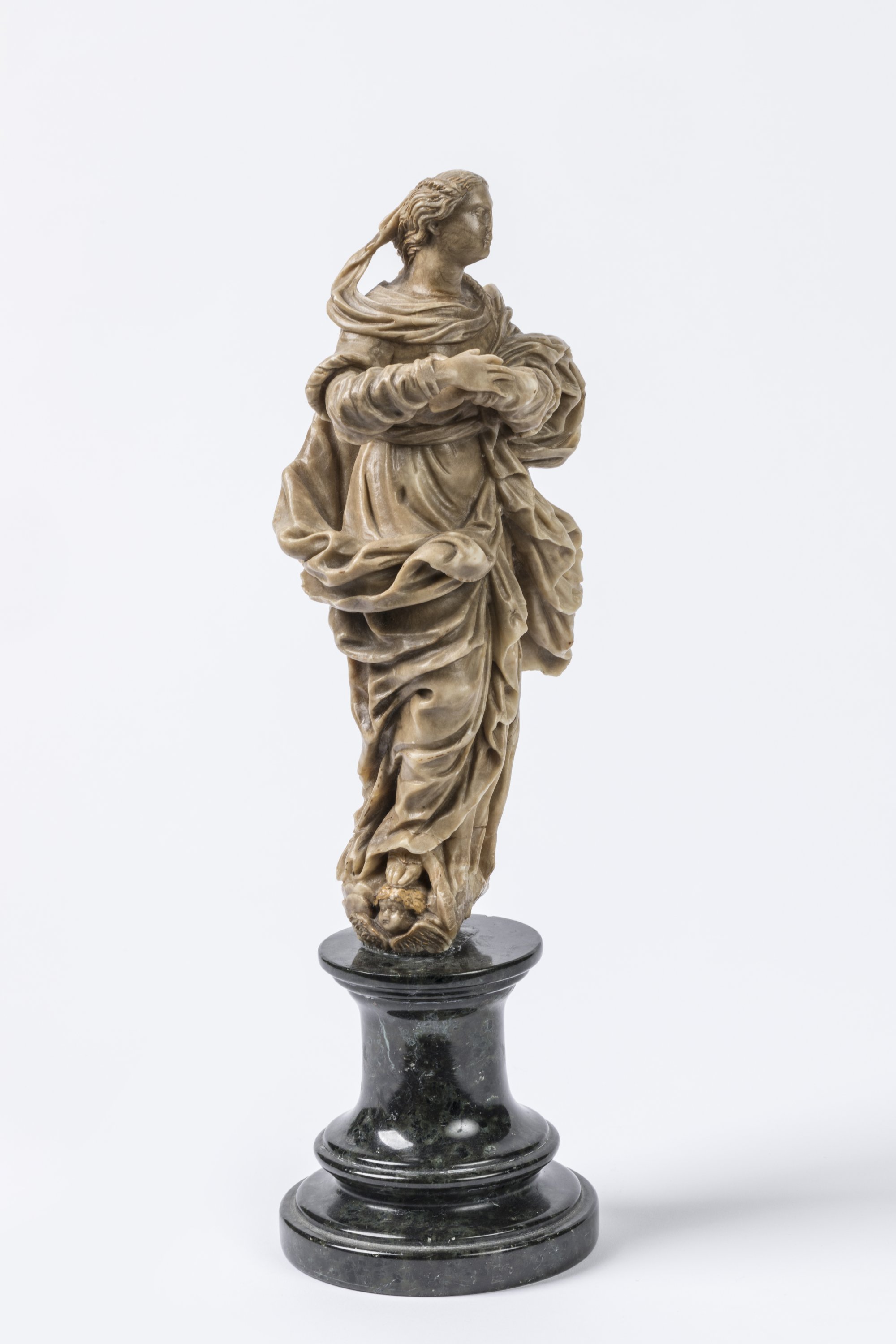 A ca. 1700 alabaster figure of the Virgin of the Assumption. On a grey marble base. Italian School.