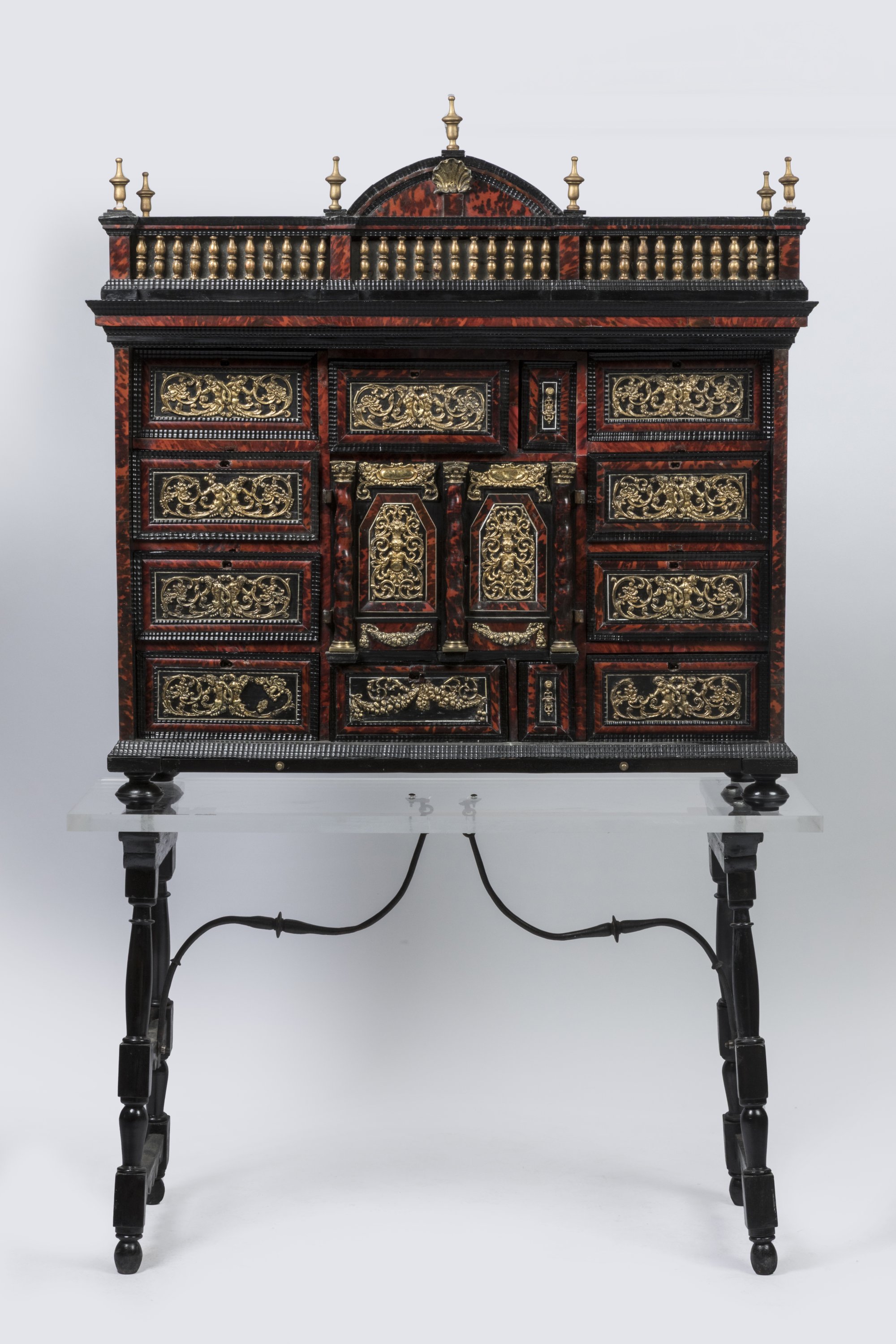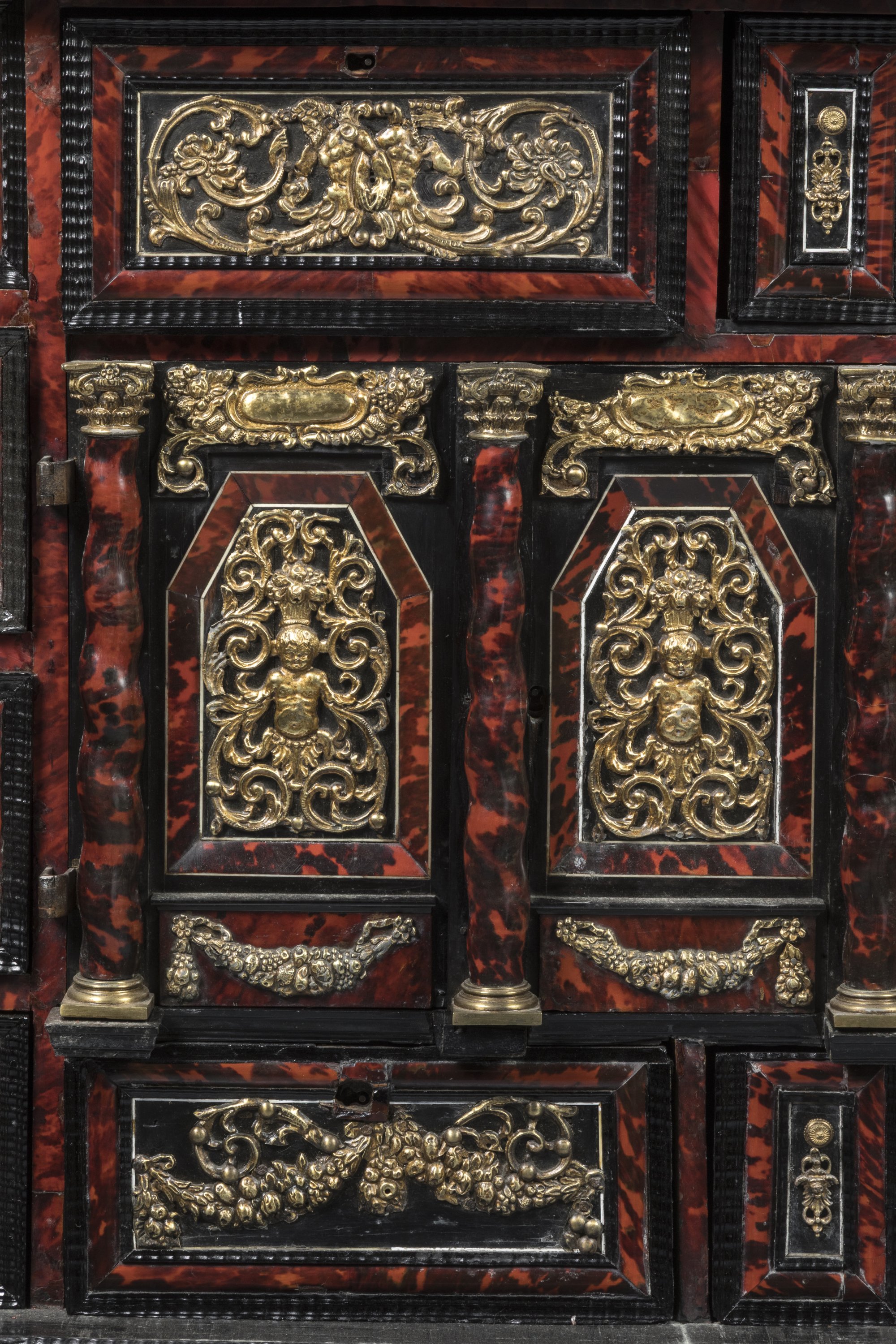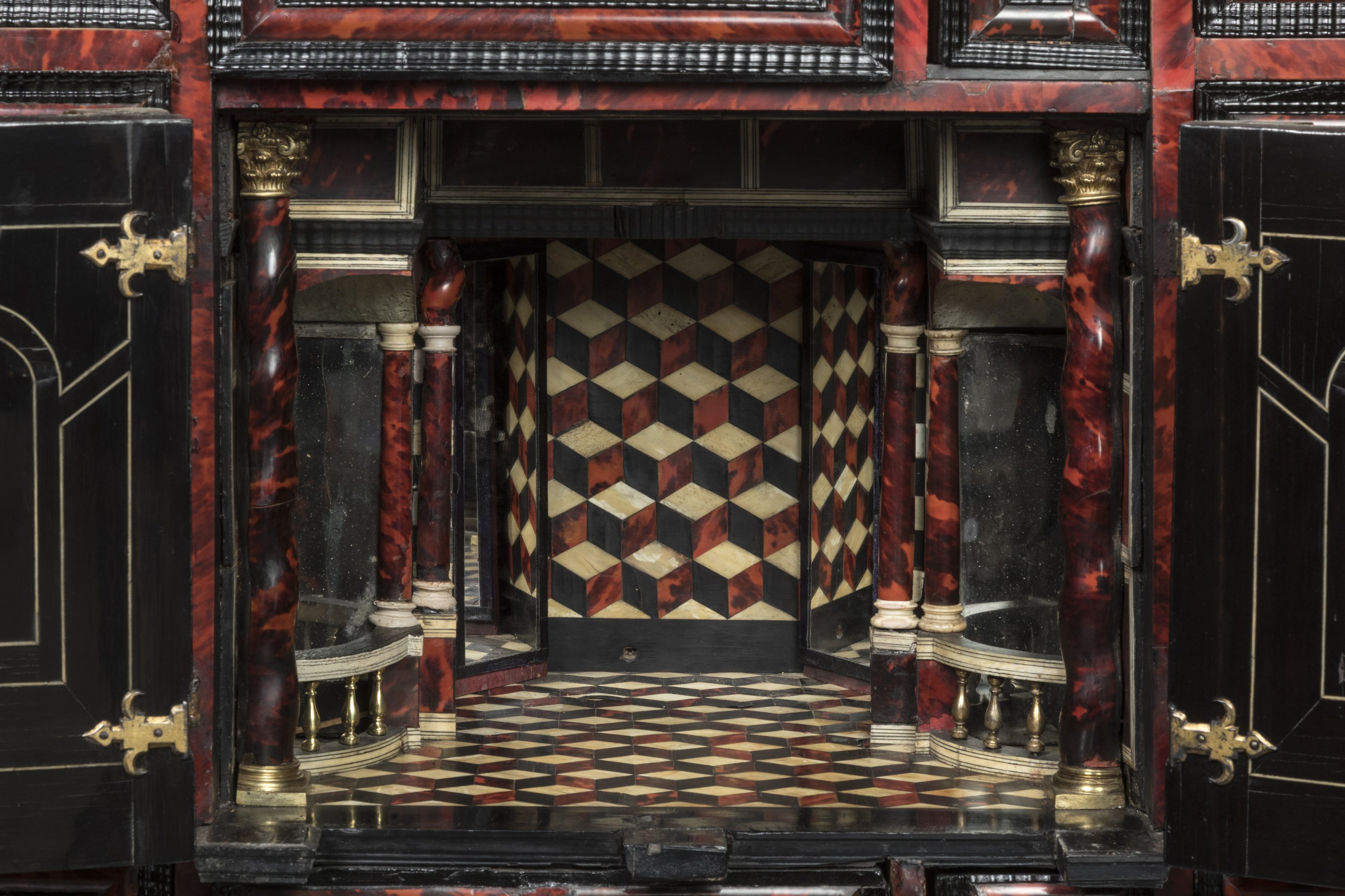 Si le cabinet est à l'origine un meuble utilitaire accompagnant son propriétaire au gré de ses voyages, il devient au XVIIe siècle un objet de prestige. Les Flandres se présentent comme l'une des régions les plus prolifiques dans sa création à base d'ébène et d'écaille. Les matériaux employés sont le reflet des interactions commerciales de la première mondialisation qui se met en place. Les formes baroques sont quant à elles insufflées par les voyages des artistes, à commencer par Pierre-Paul Rubens. Revenu s'installer à Anvers en 1608, Rubens rapporte avec lui des croquis de formes nouvelles esquissés lors de ses séjours d'études et diplomatiques en Italie et en Espagne. "De fait, il introduisit dès lors les formes et idéals baroques dans le nord de l'Europe et eut une influence indirecte sur le cabinet, dont les proportions devinrent plus généreuses, le décor plus audacieux et l'exécution plus homogène" explique Monique Riccardi-Cubitt ("Un art européen. Le cabinet de la Renaissance à l'époque moderne", Paris, Les éditions de l'Amateur, 1993, p. 79).
