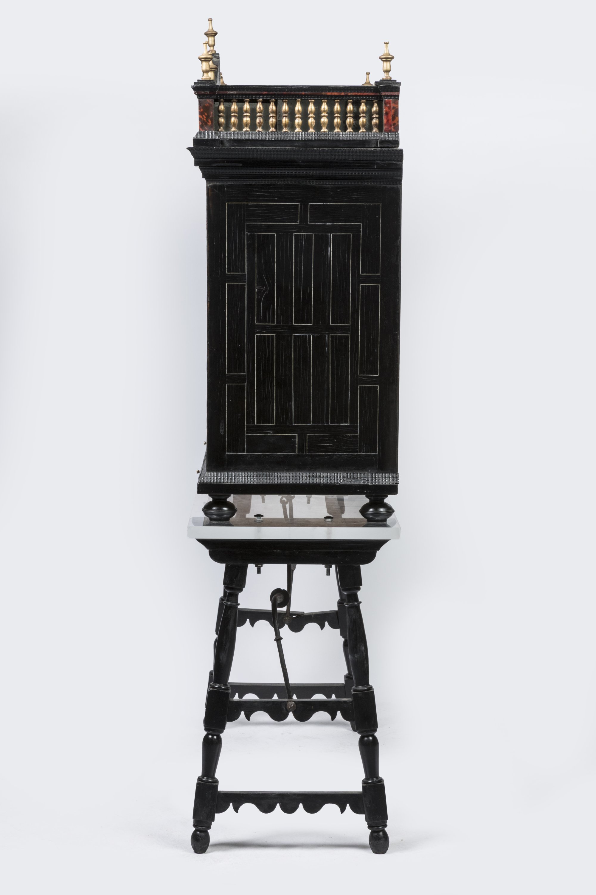 An ormolu-mounted ebony, tortoiseshell, bone, bronze, and giltwood display cabinet with mercury mirrors. On a modern base. Flanders, 17th century.