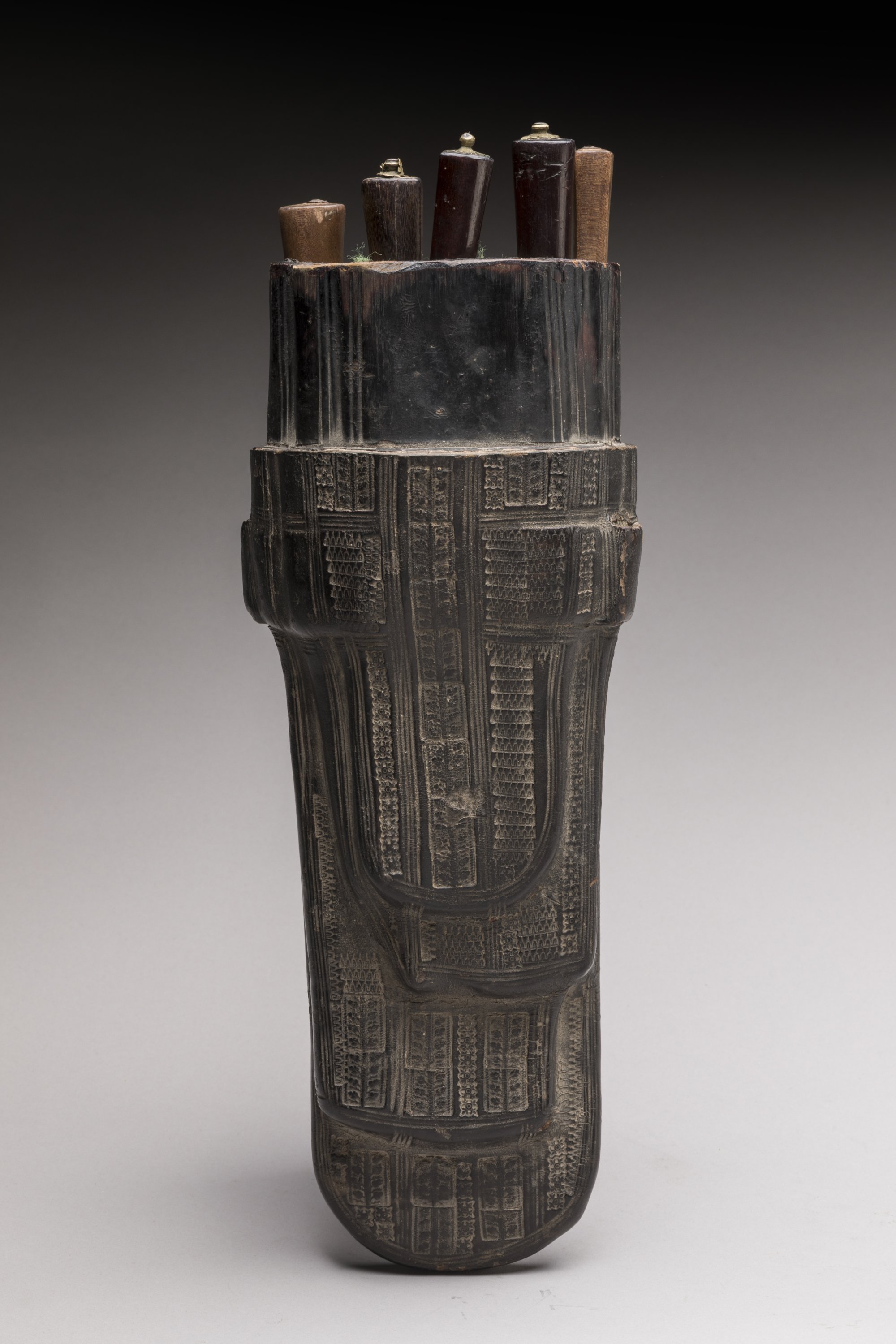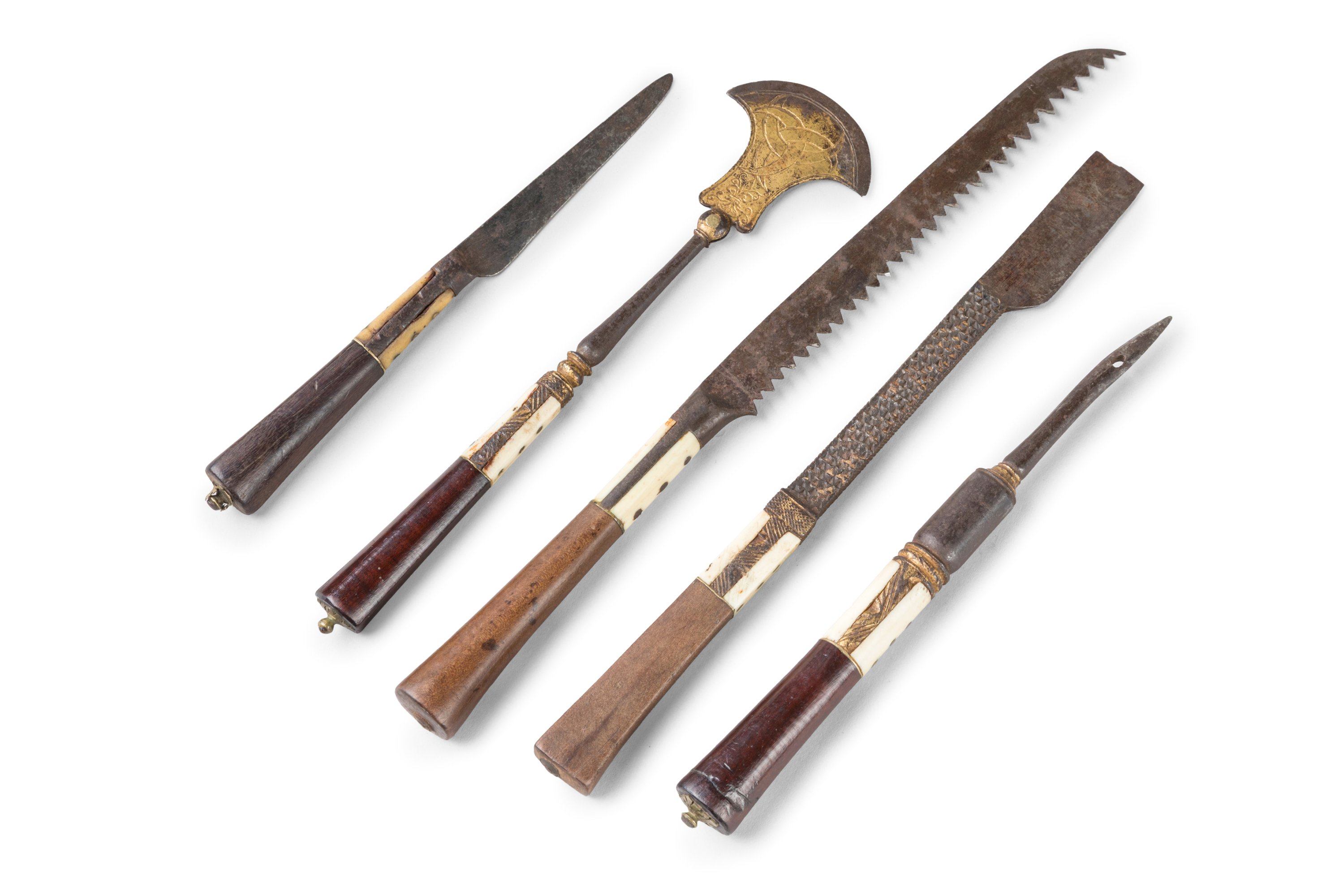 France, early 16th century. A rare squire leather bag holding a set of kitchen tools embossed with the cypher of Henri de Valois, future King Henri II of France.