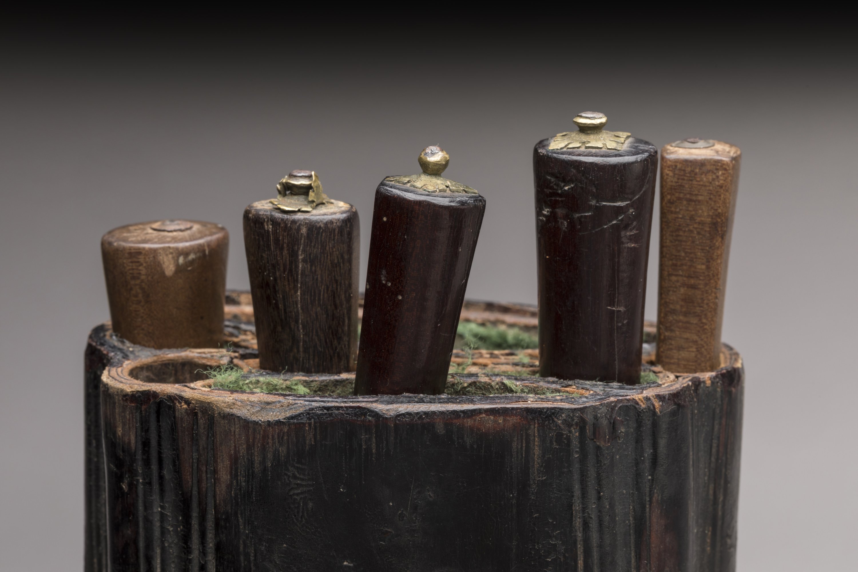 Trois rares trousses comportant le nécessaire à découper la viande sont identifiées dans les musées français et américains. Une trousse de chasse allemande du XVIe siècle se trouve dans les collections du musée du Louvre, en dépôt au musée de la Renaissance à Ecouen (OA 8948), tandis que deux trousses allemandes, l’une vers 1570 (04.3.153a, b .157), l’autre vers 1650 (68.141.247a g), sont conservées au Metropolitan Museum of Art à New York. Les principaux musées spécialisés sont quant à eux dépourvus de tels objets, ce qui souligne leur rareté. On n’en retrouve ainsi ni au musée de la chasse et de la nature à Paris, ni au musée de la chasse et de la pêche à Munich.
