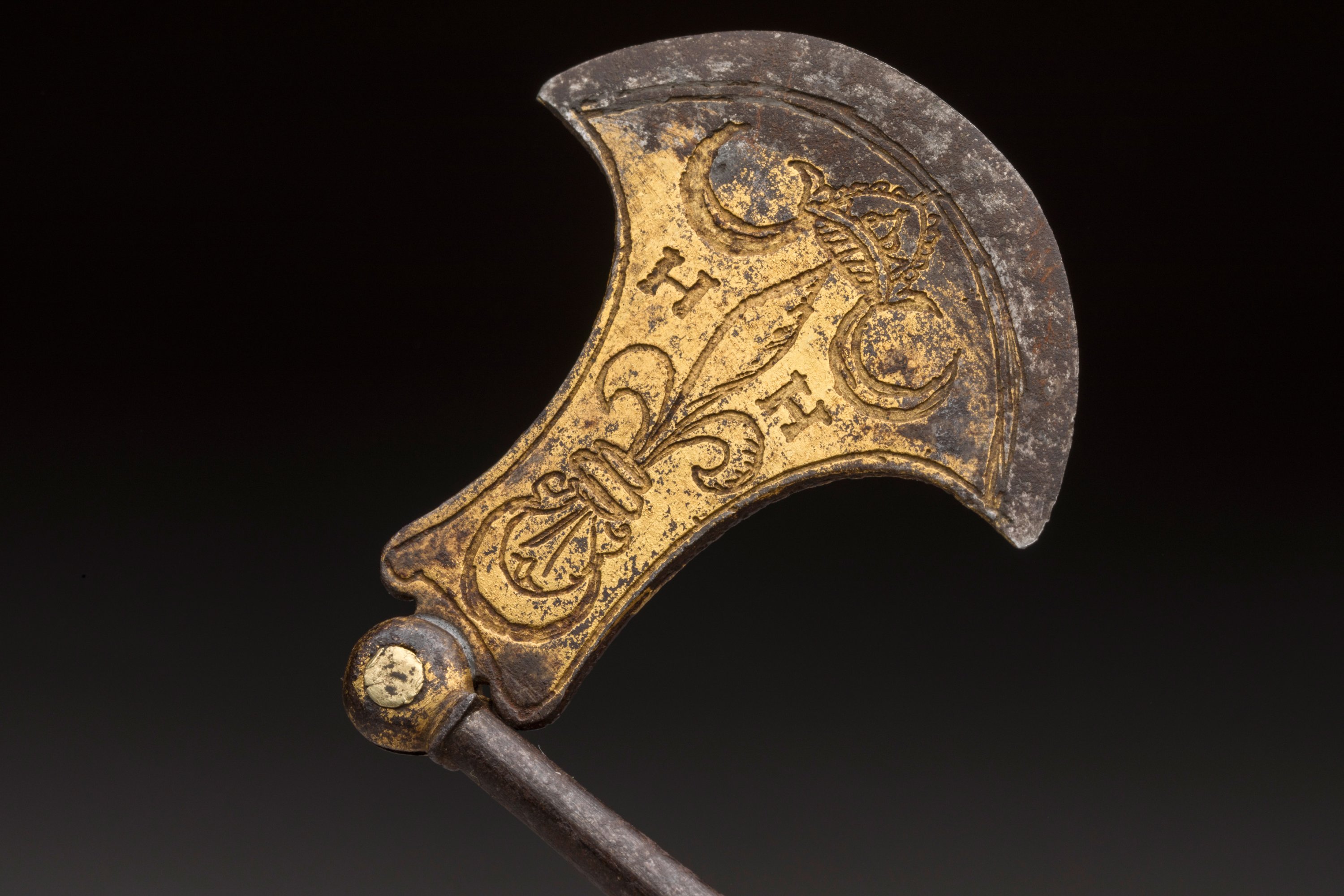 Elle comporte cinq outils à découper, sur huit au total (certains reconstitués), en fer forgé, gravés et dorés, avec des manches en os et en bois: une hachette articulée, un burin lime, un poinçon à sétons, un petit couteau à défaire, une scie à main. La hachette est gravée de part et d'autre de trois croissants de Lune, de fleurs de lys, du monogramme « HH » et de la couronne Delphinale. Poinçon à l'hermine en l'honneur du Duc de Bretagne sur la lame du couteau.