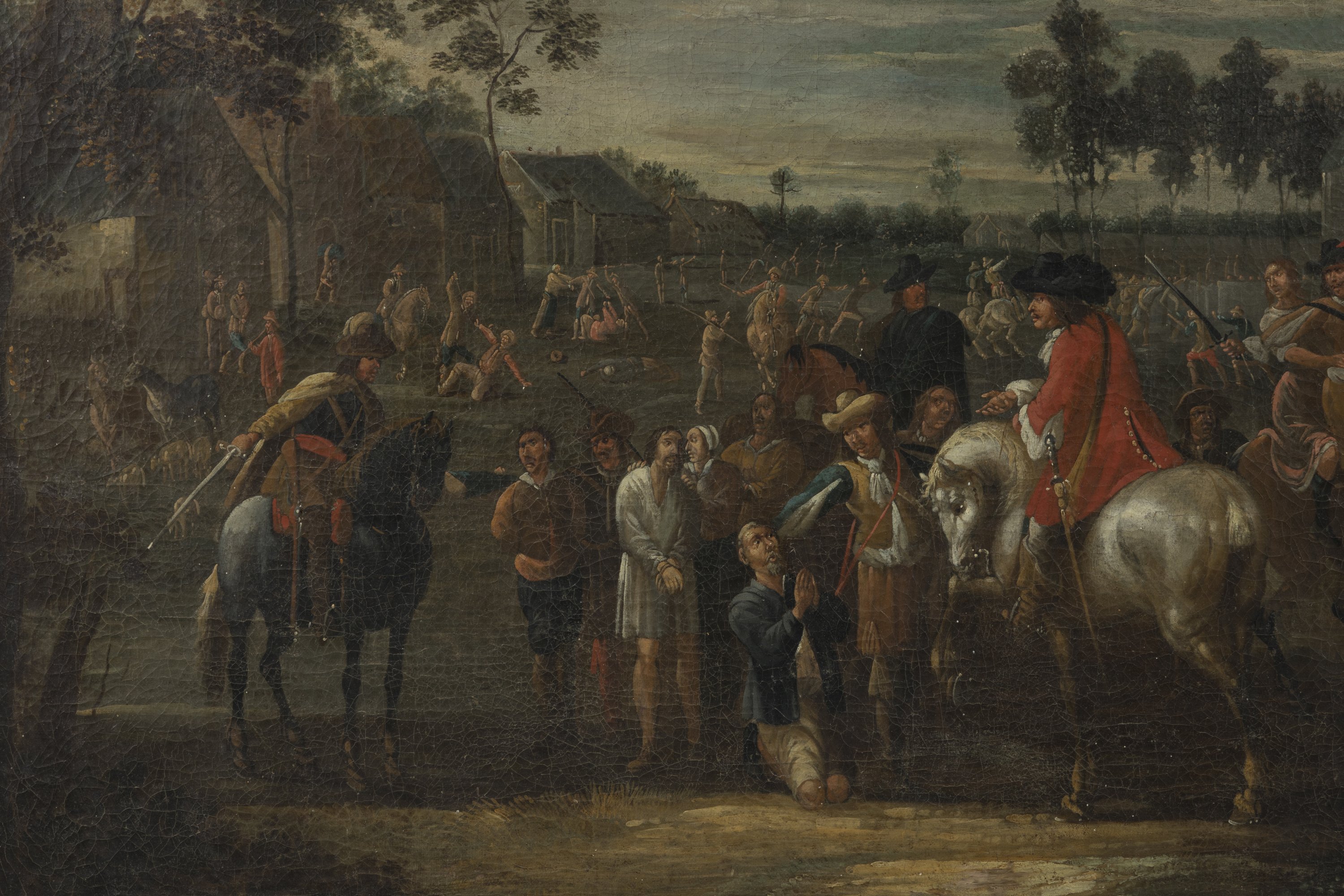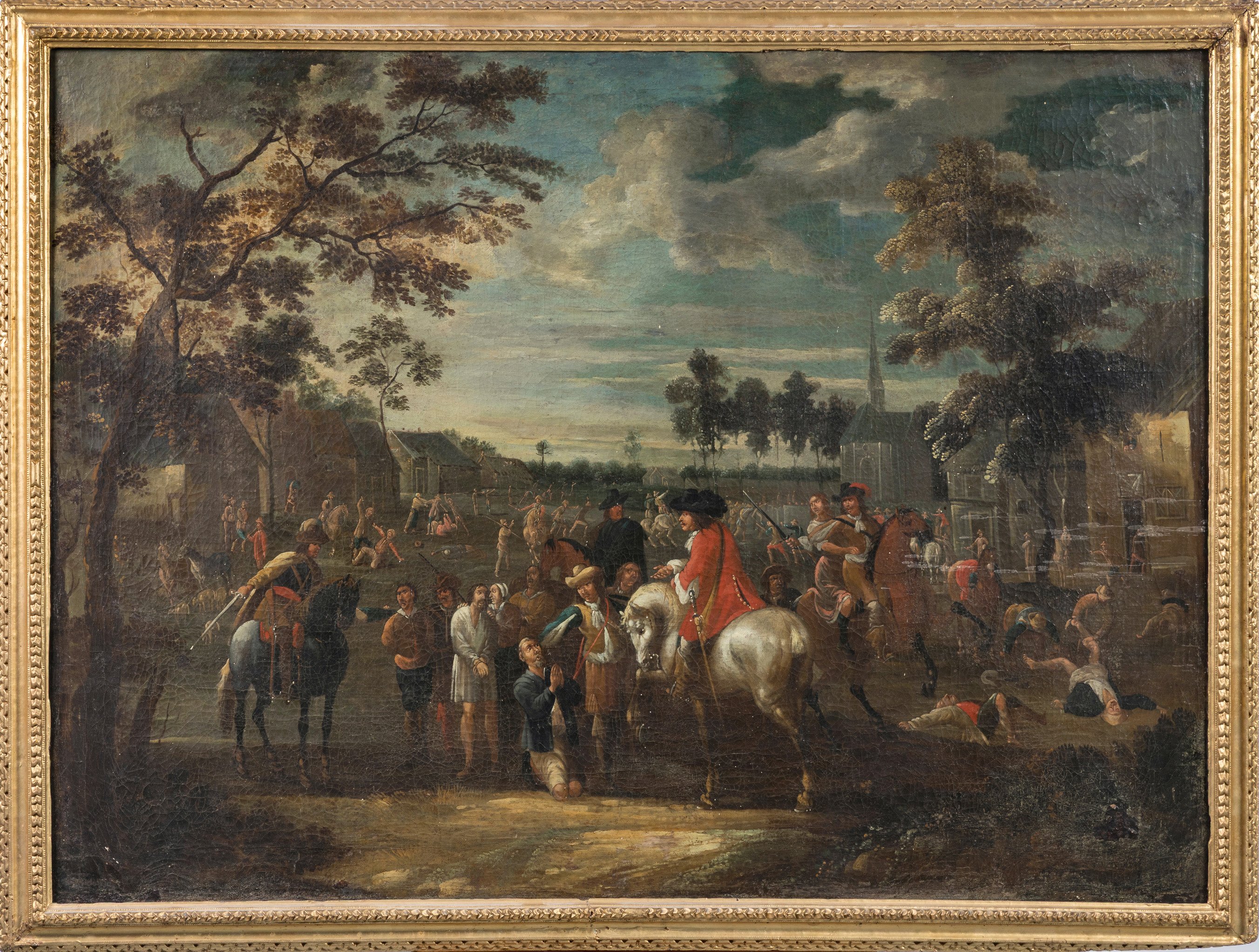 A painting featuring a horseman pardoning prisoners, by the entourage of Hendrick de Meijer. Oil on canvas. Flemish School, ca. 1690. In an 18th century giltwood frame.