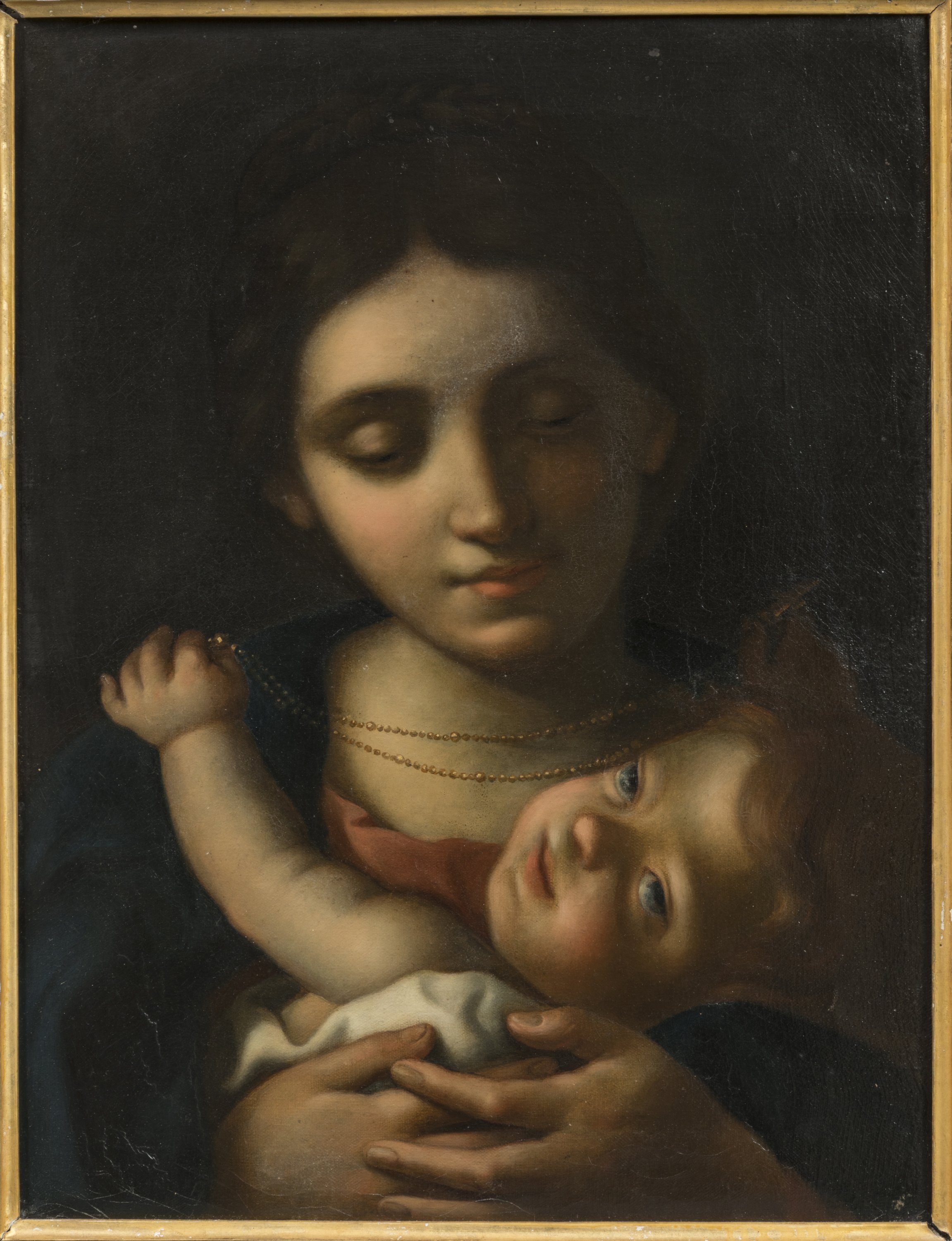 A painting featuring the Madonna with Child and a rosary by a follower of Carlo Cignani. Oil on canvas in a giltwood frame. Italian School, 19th century.