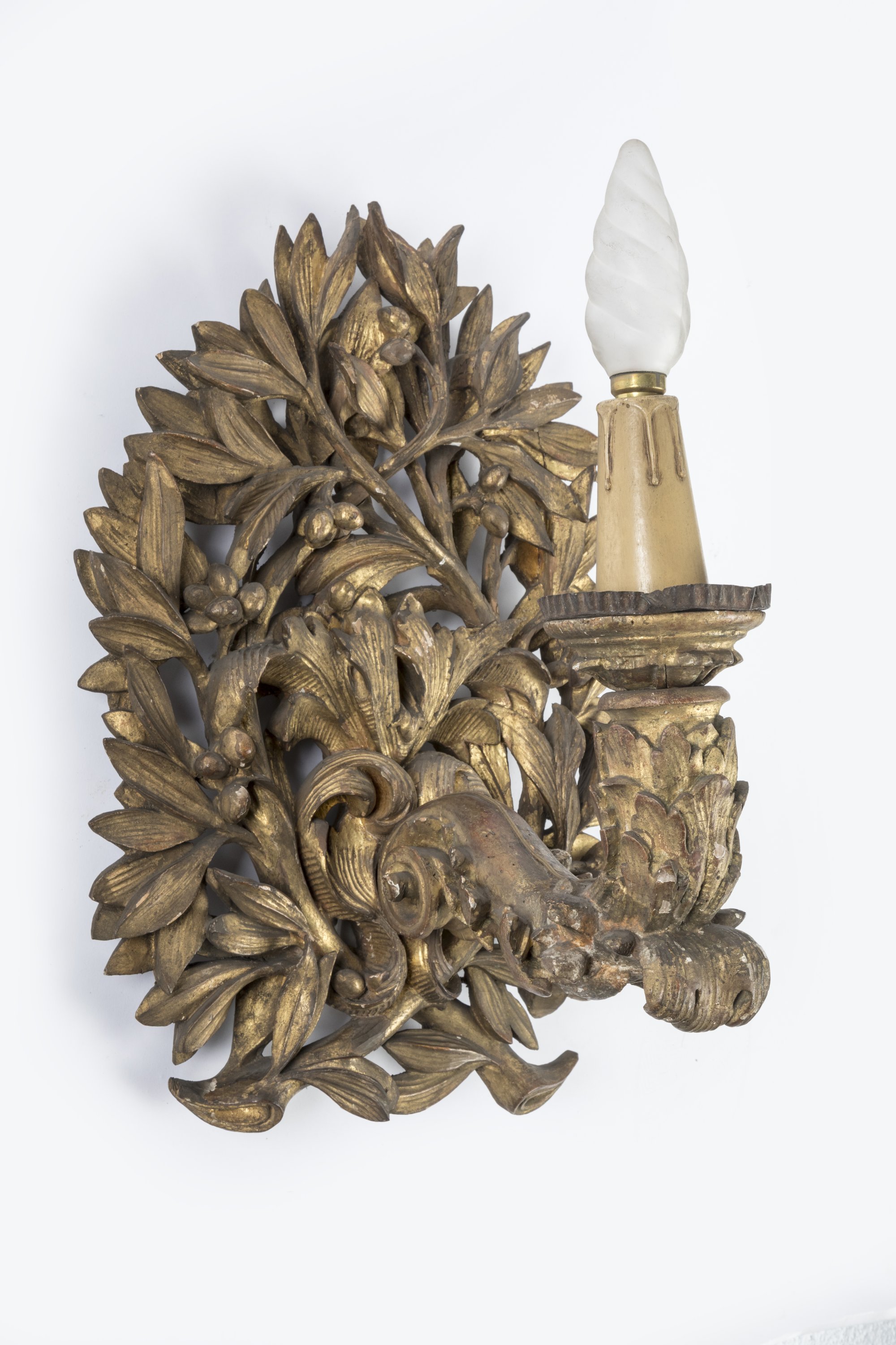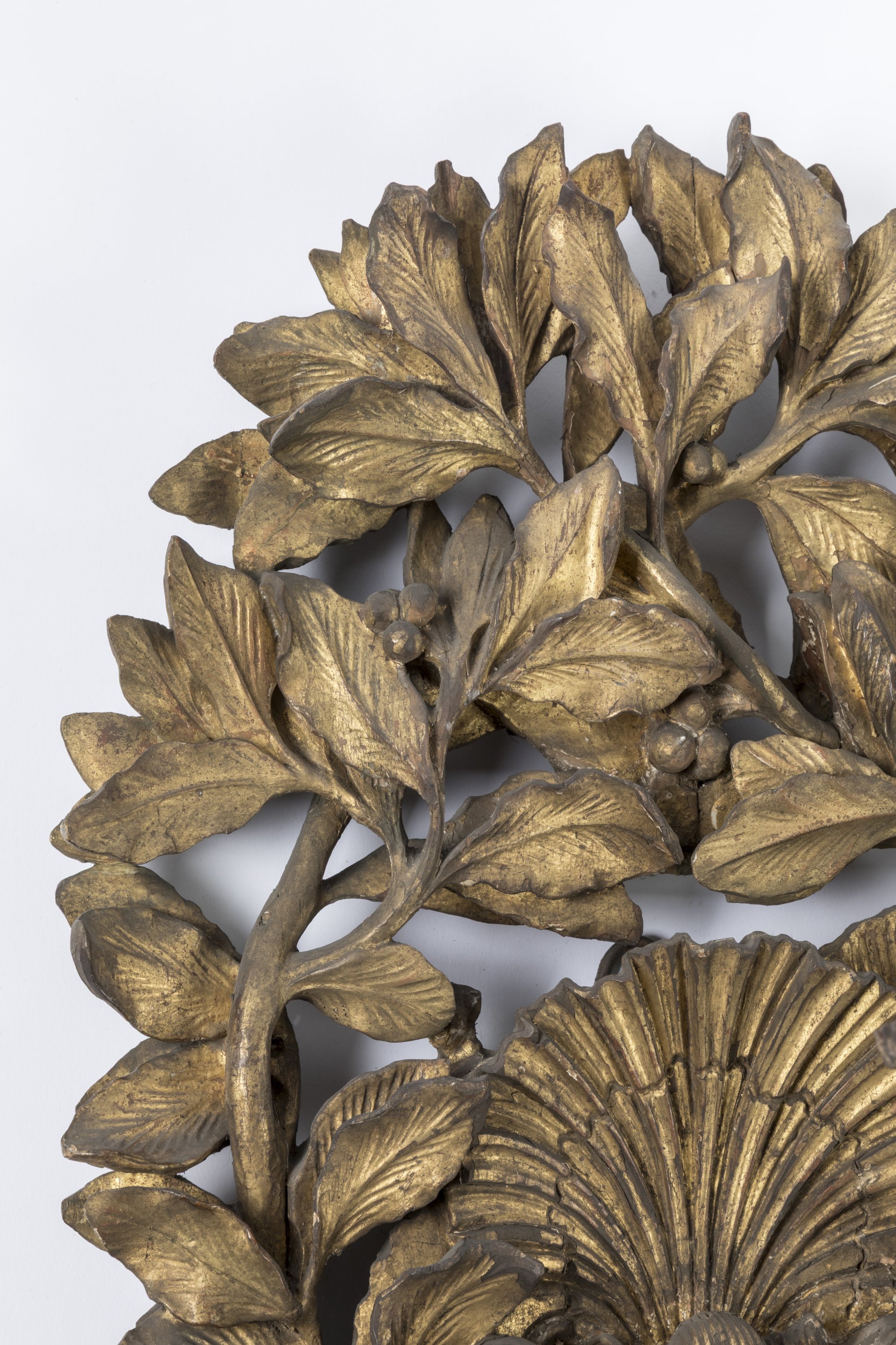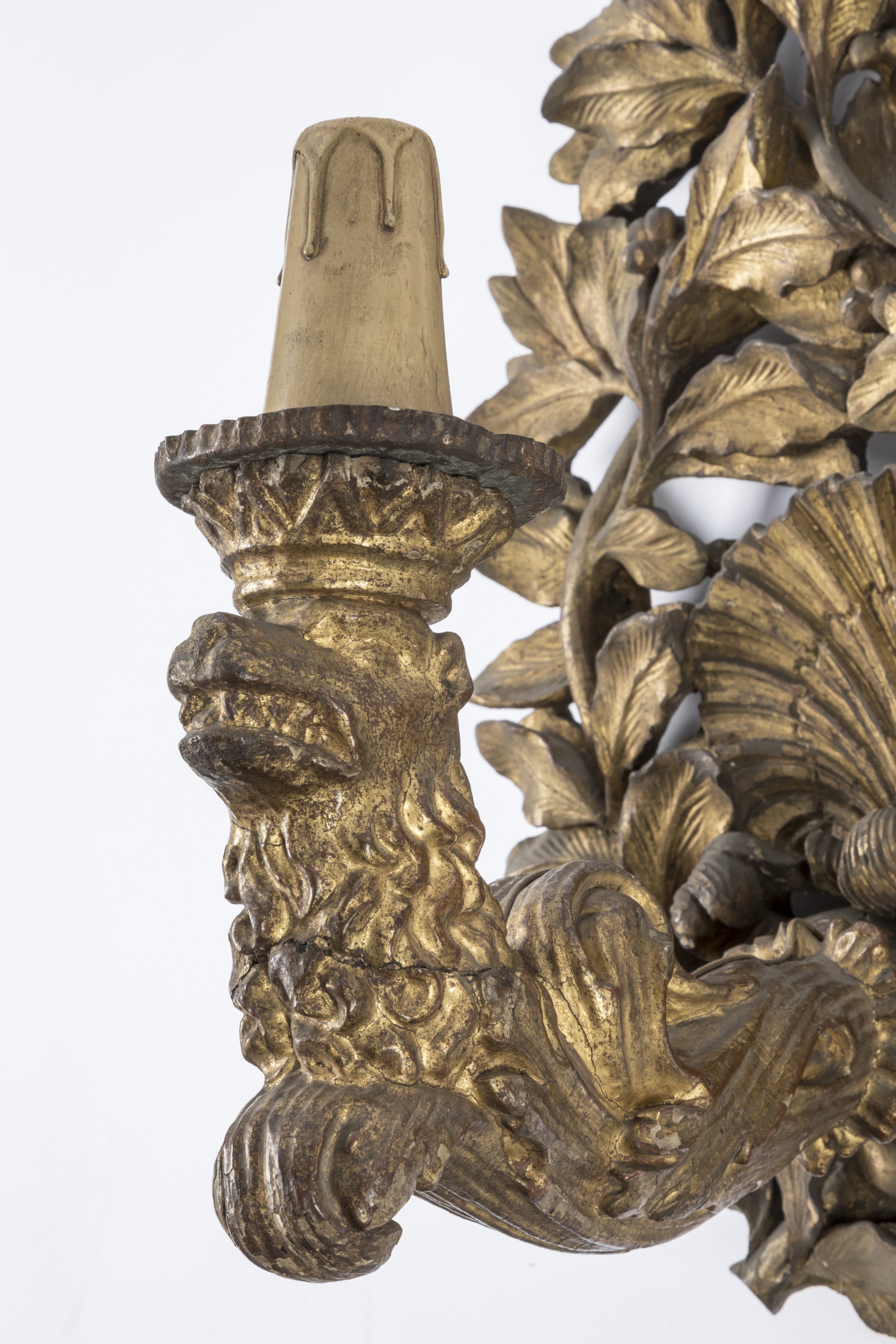 Un décor de coquille dans un entourage de feuilles de laurier reçoit le bras de lumière à feuilles d'acanthe terminé sur l'une par un protomée de lion, sur l'autre en bouquet de feuilles d'acanthe dans un entourage de laurier.