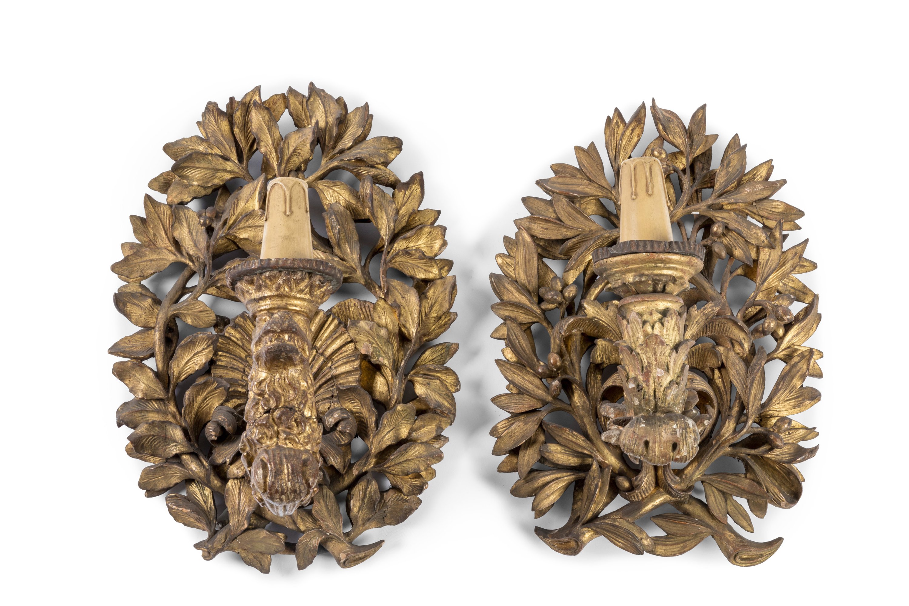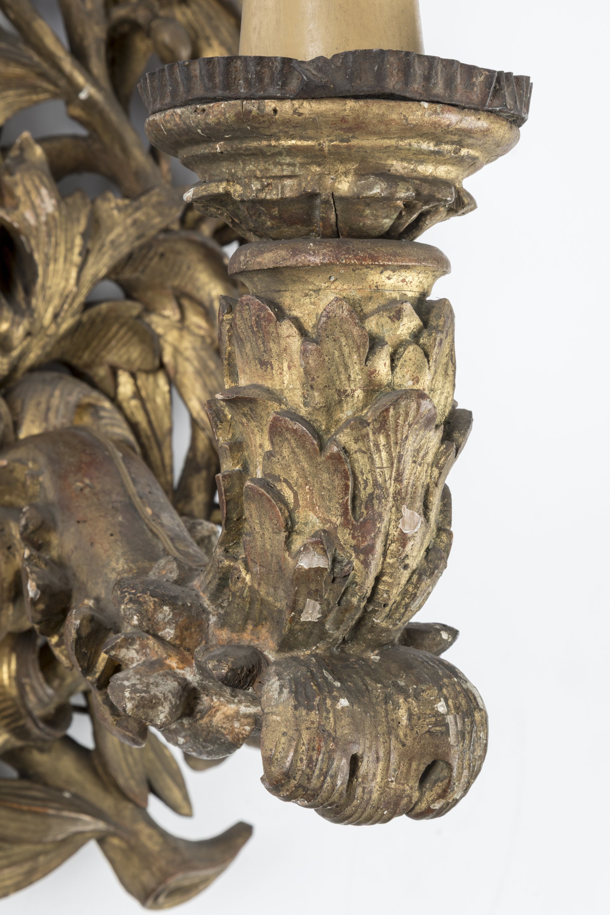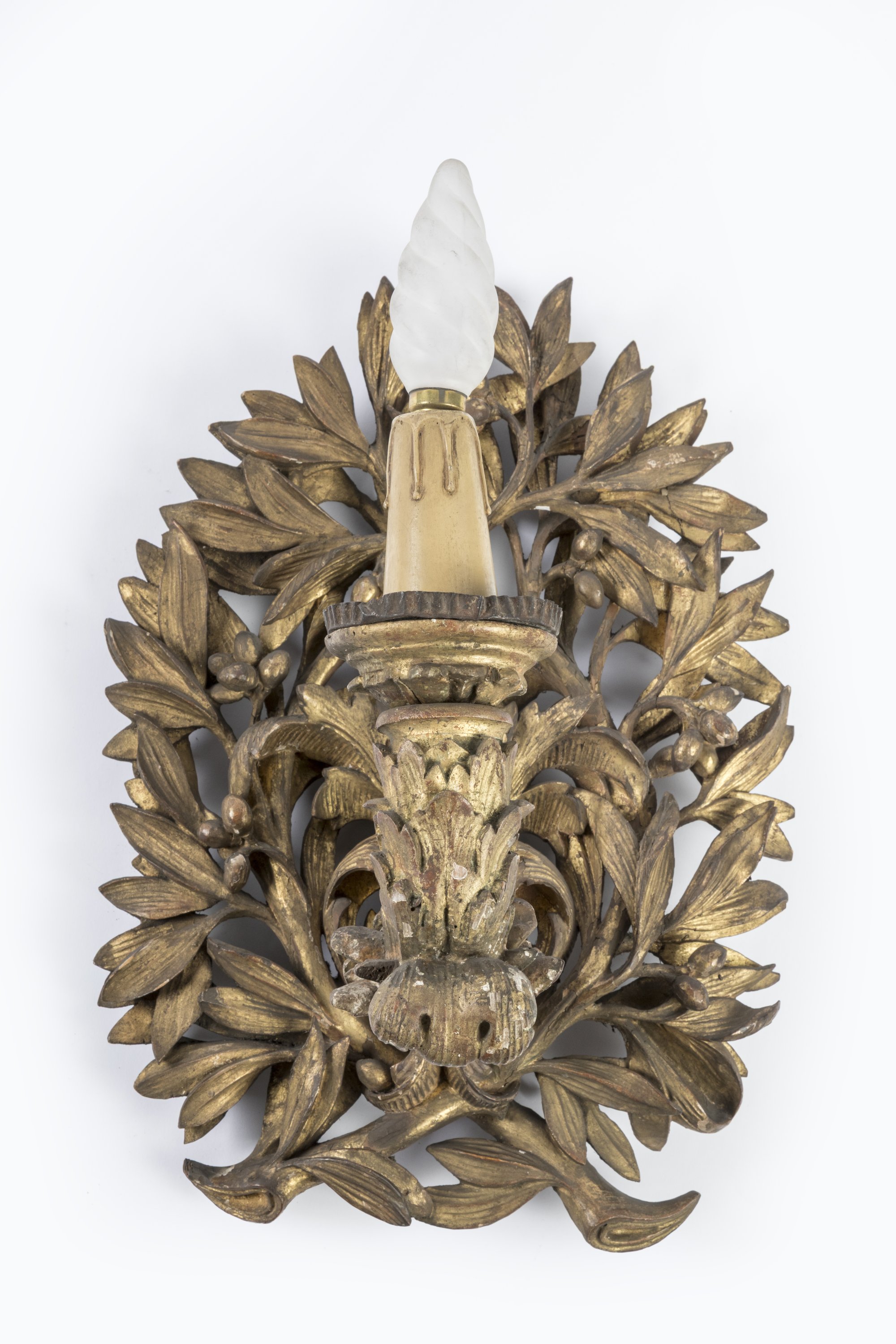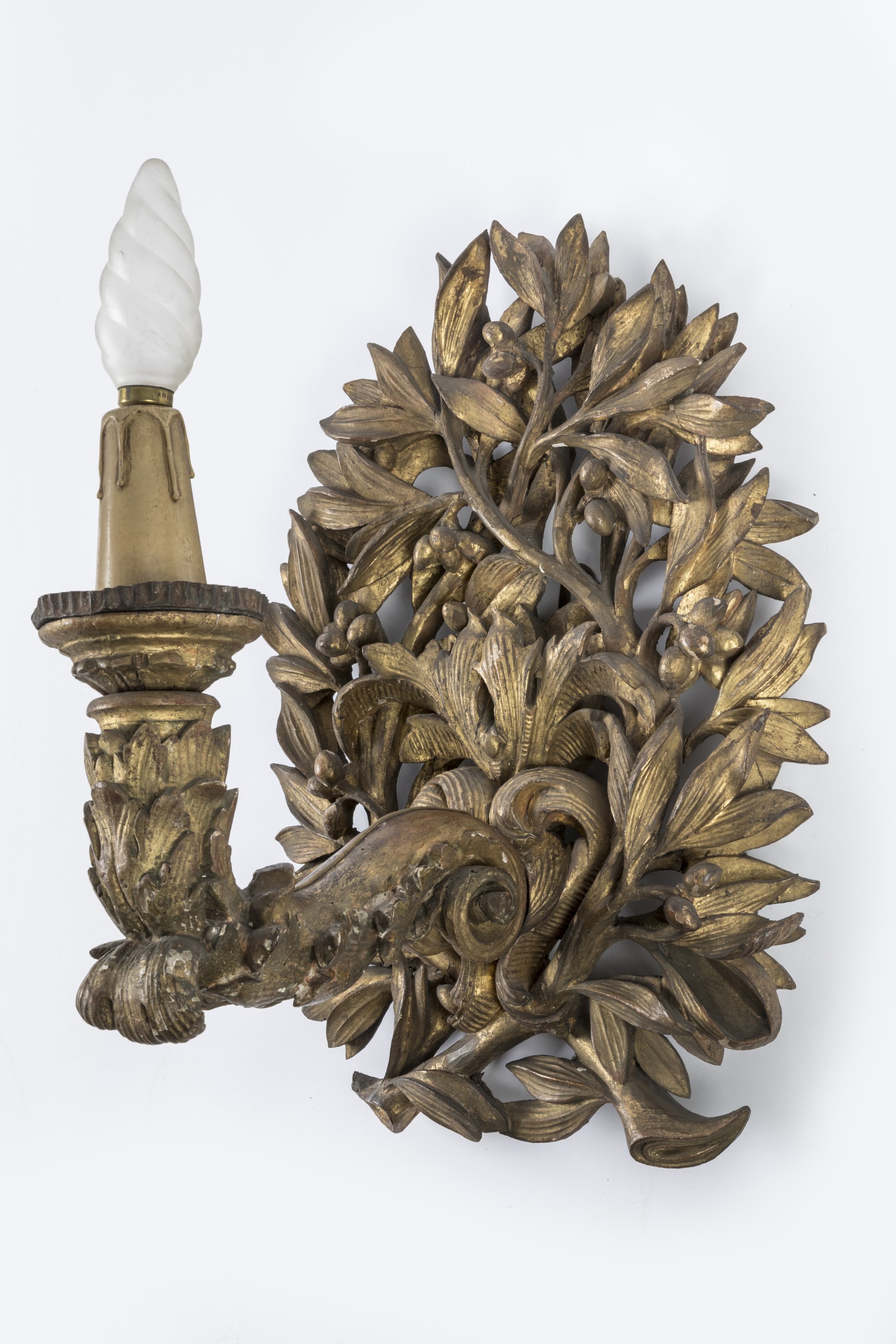 Un décor de coquille dans un entourage de feuilles de laurier reçoit le bras de lumière à feuilles d'acanthe terminé sur l'une par un protomée de lion, sur l'autre en bouquet de feuilles d'acanthe dans un entourage de laurier.