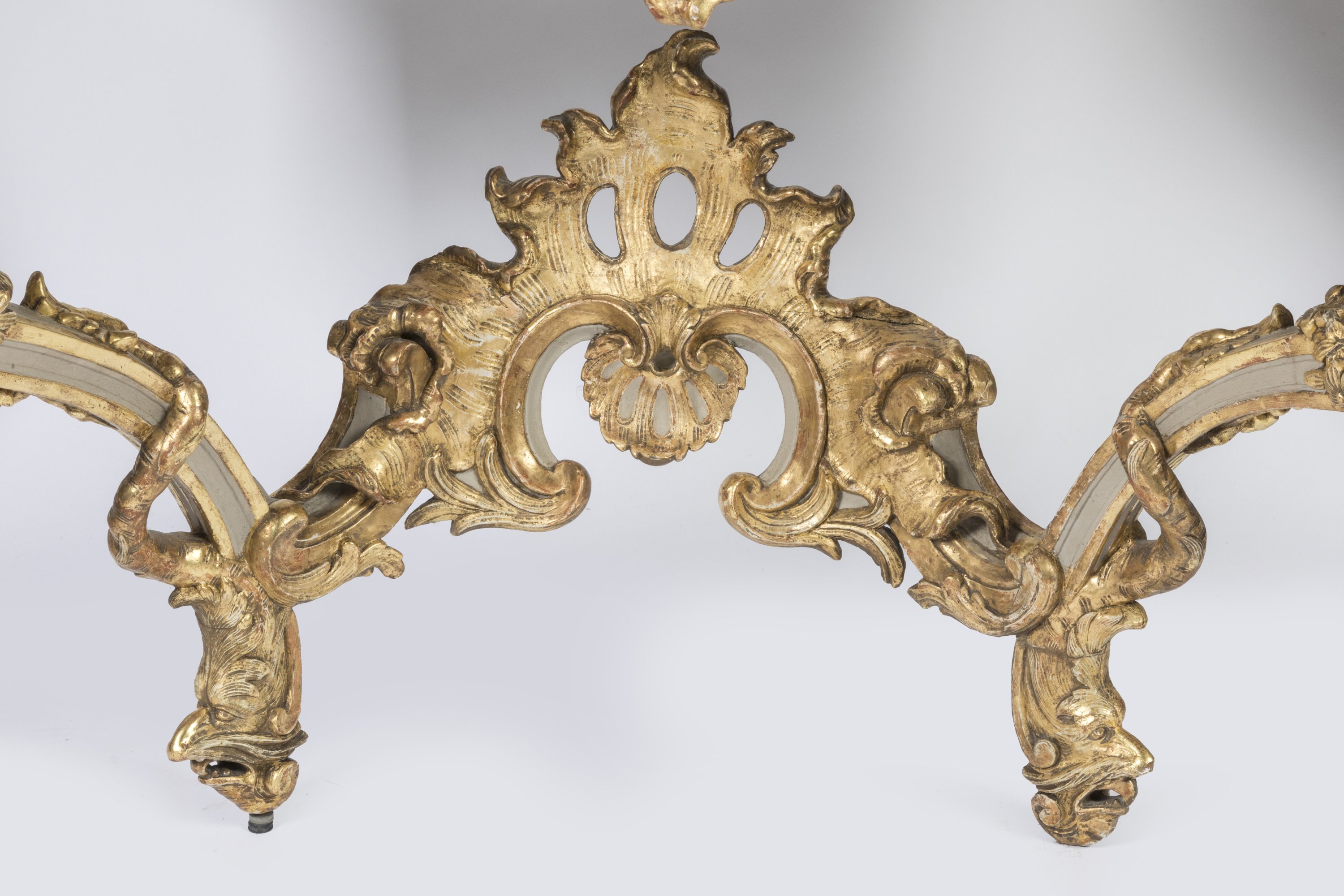 Riche décor ajouré de coquilles, rinceaux, volutes, frises de perles et feuilles d'acanthe, les deux pieds cambrés se rejoignent en une entretoise en forme de coquille dorée et pieds en forme de dauphin.