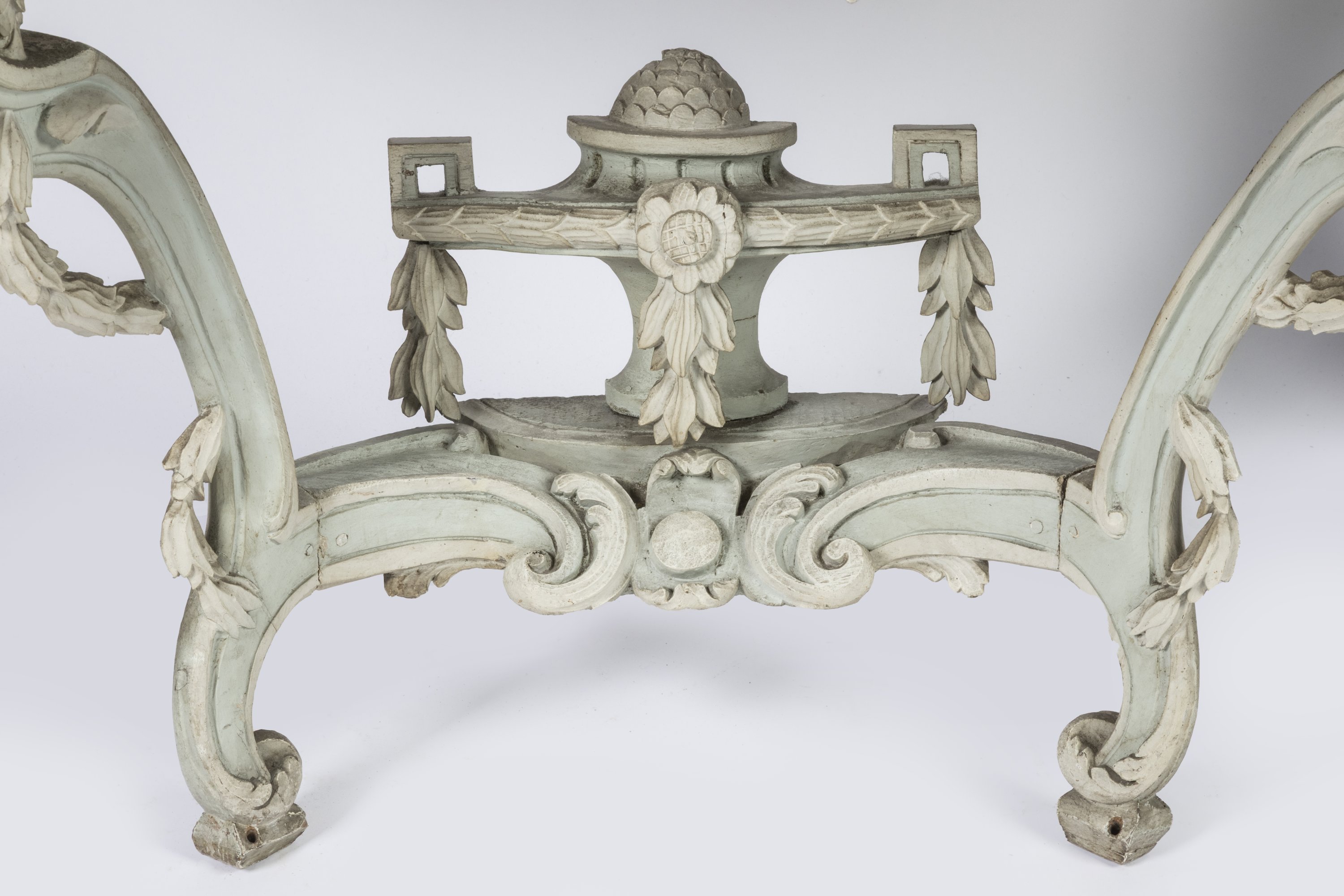 Décor rechampi blanc de tores de laurier, médaillons et rinceaux feuillagés. Les pieds cambrés réunis par une entretoise surmontée d'un pot à feu.