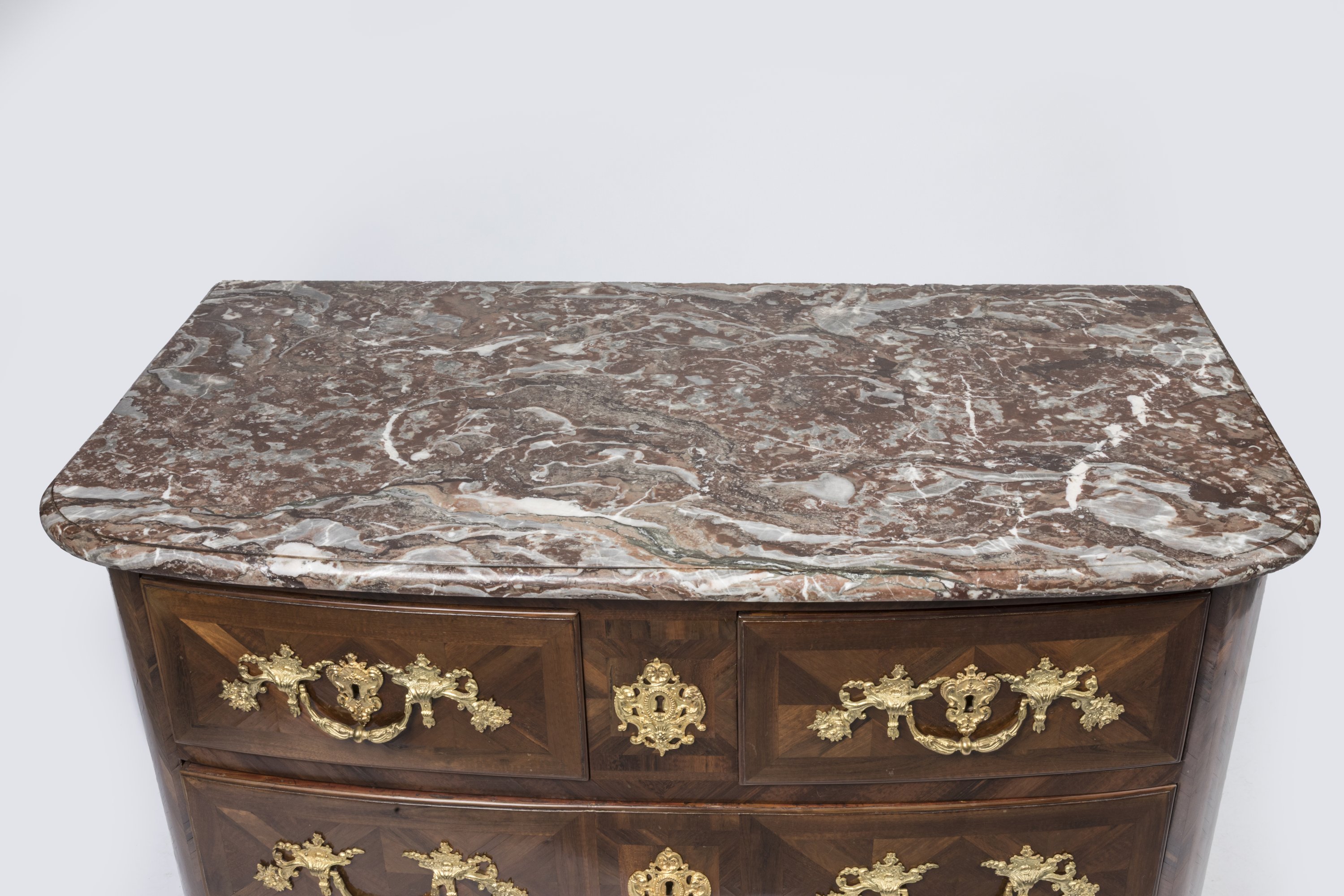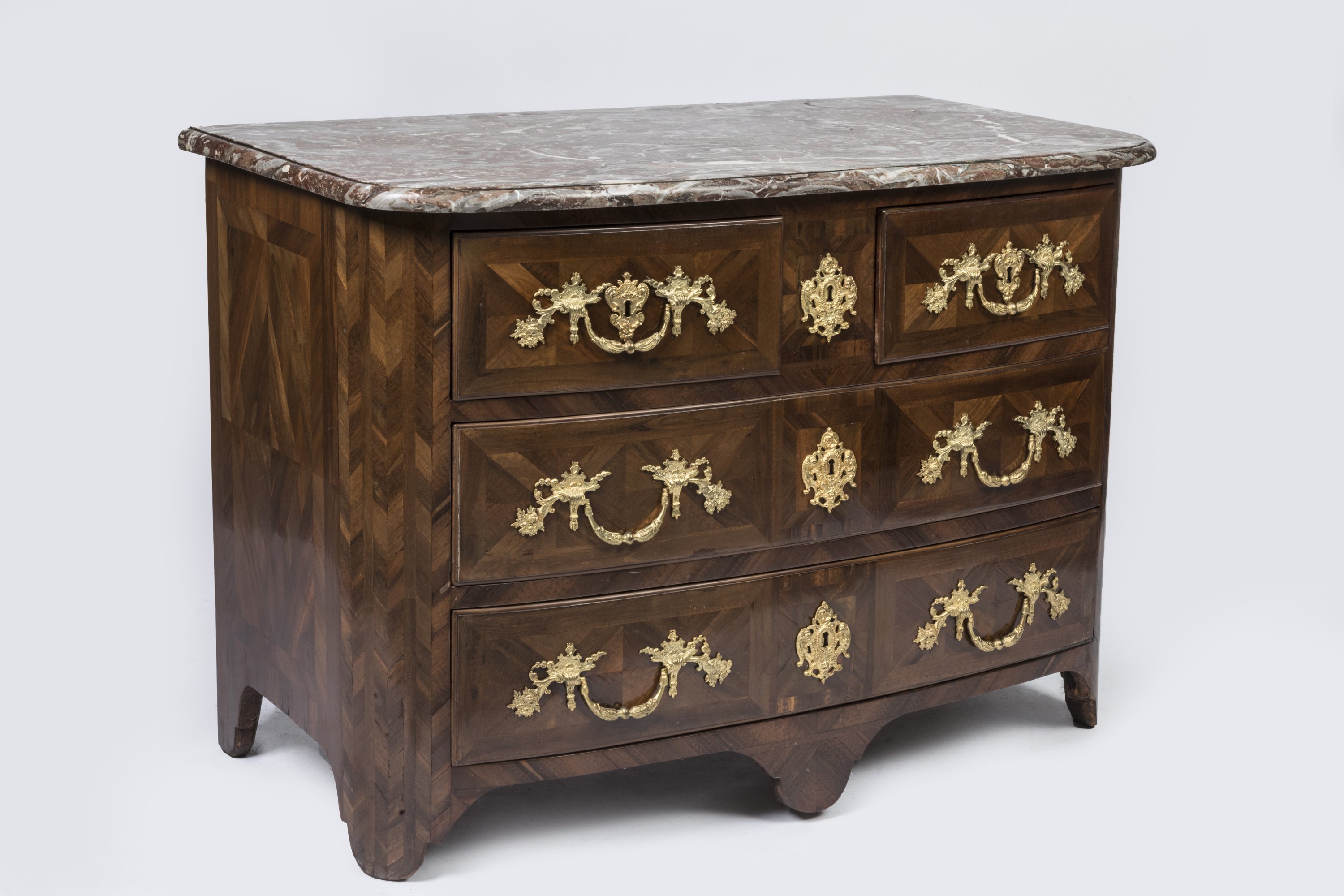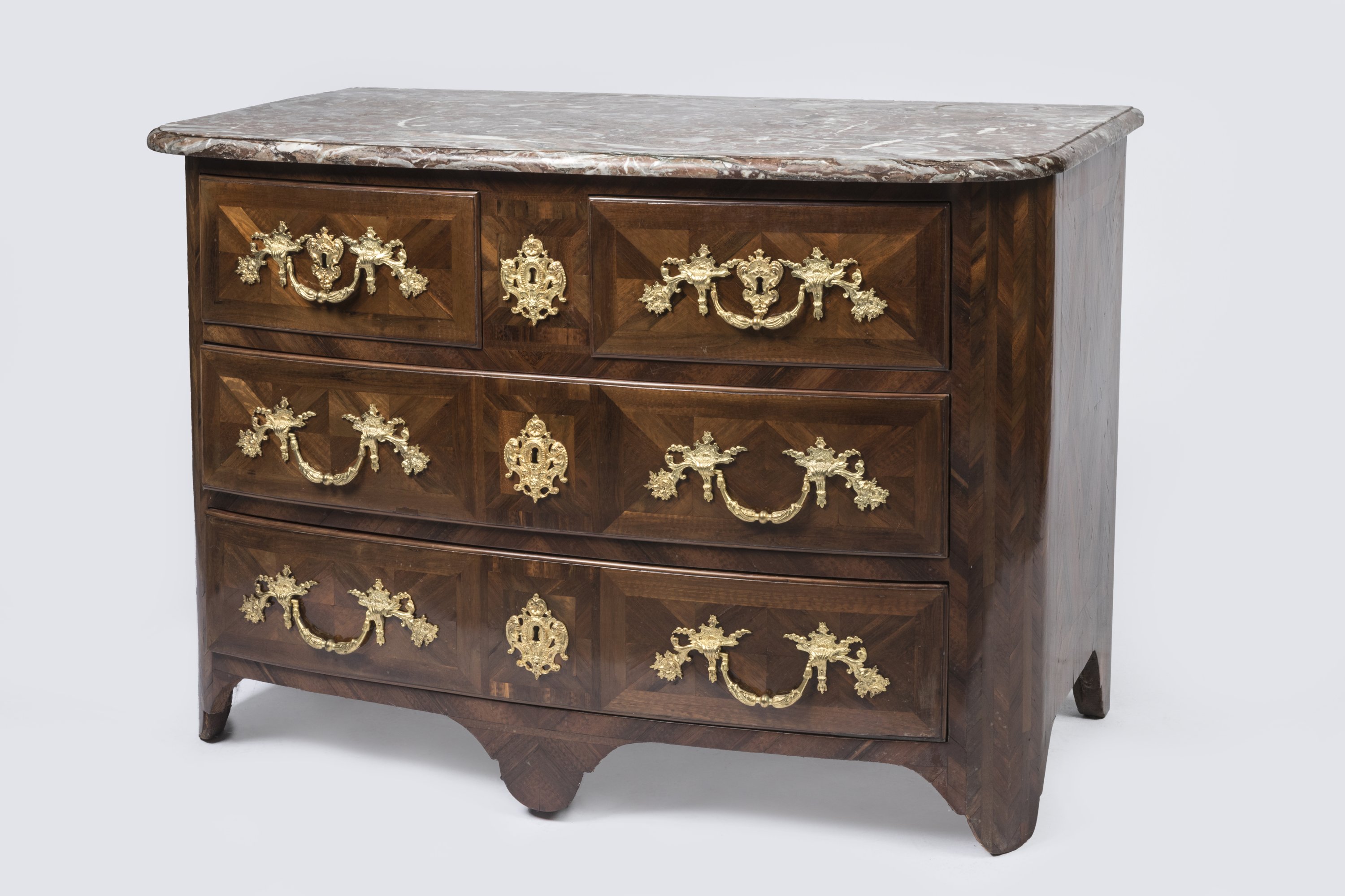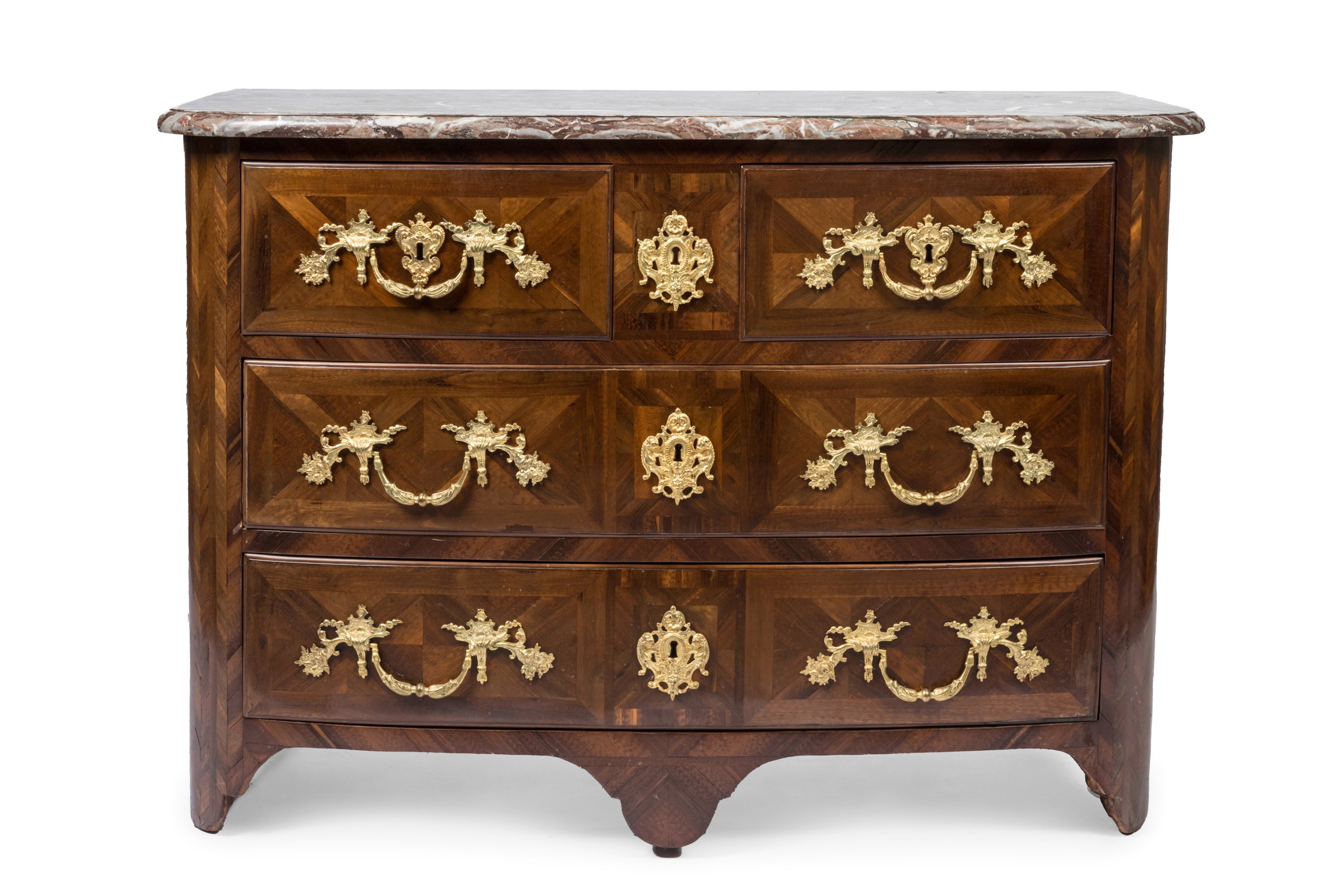 A violetwood veneer chest of drawers. Stamped. Louis XIV Period. Lavish ormolu ornaments and red marble top added at a later date.