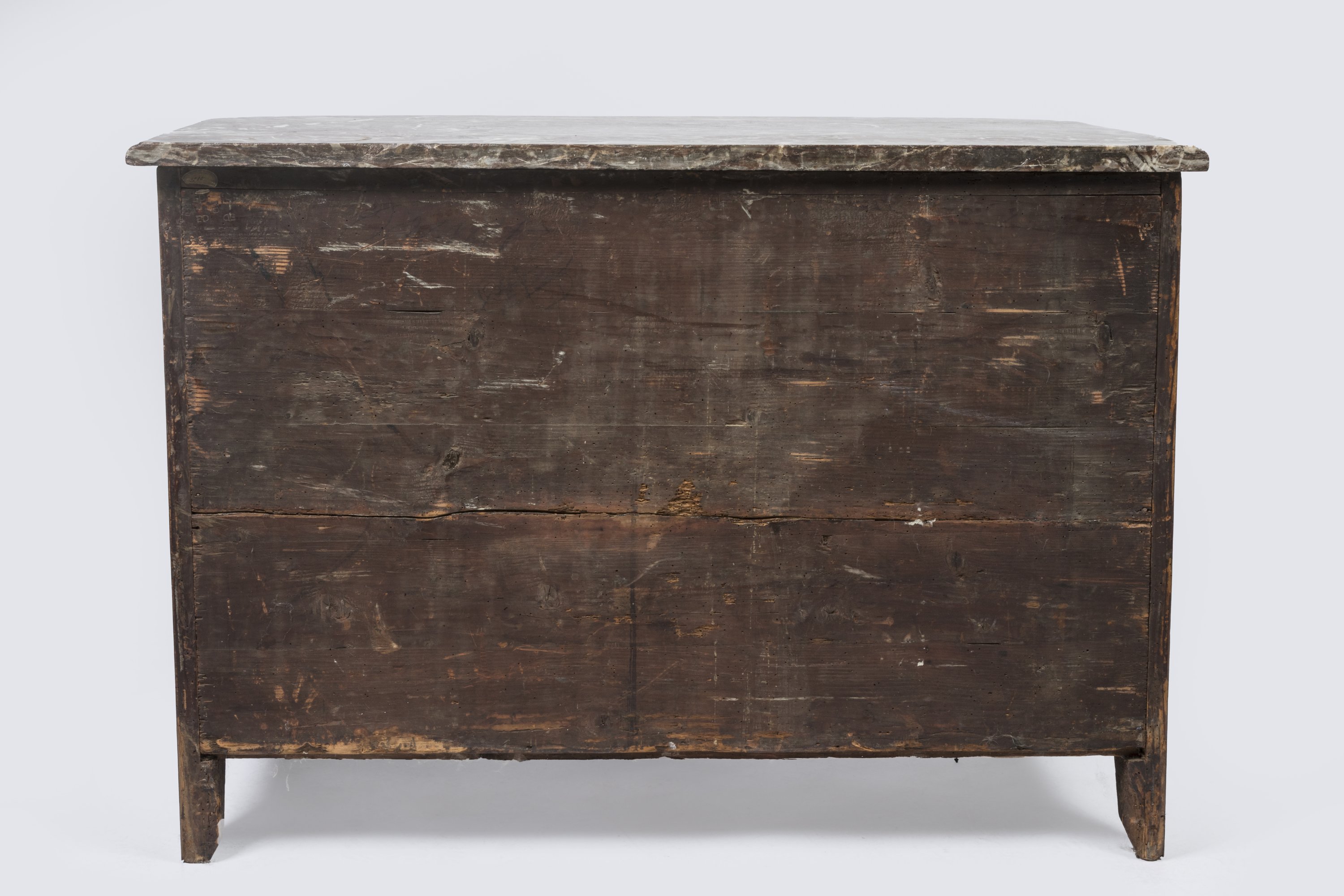 La façade légèrement bombée ouvre par cinq tiroirs sur trois rangs décorés de losanges dans des encadrements. Les montants arrondis présentent des cannelures simulées et les côtés plaqués de losange.