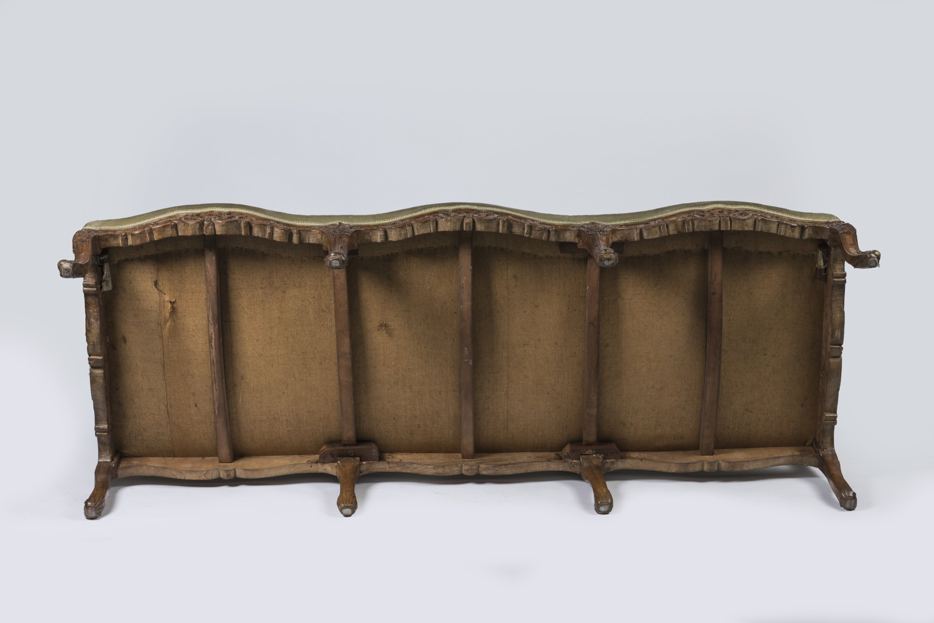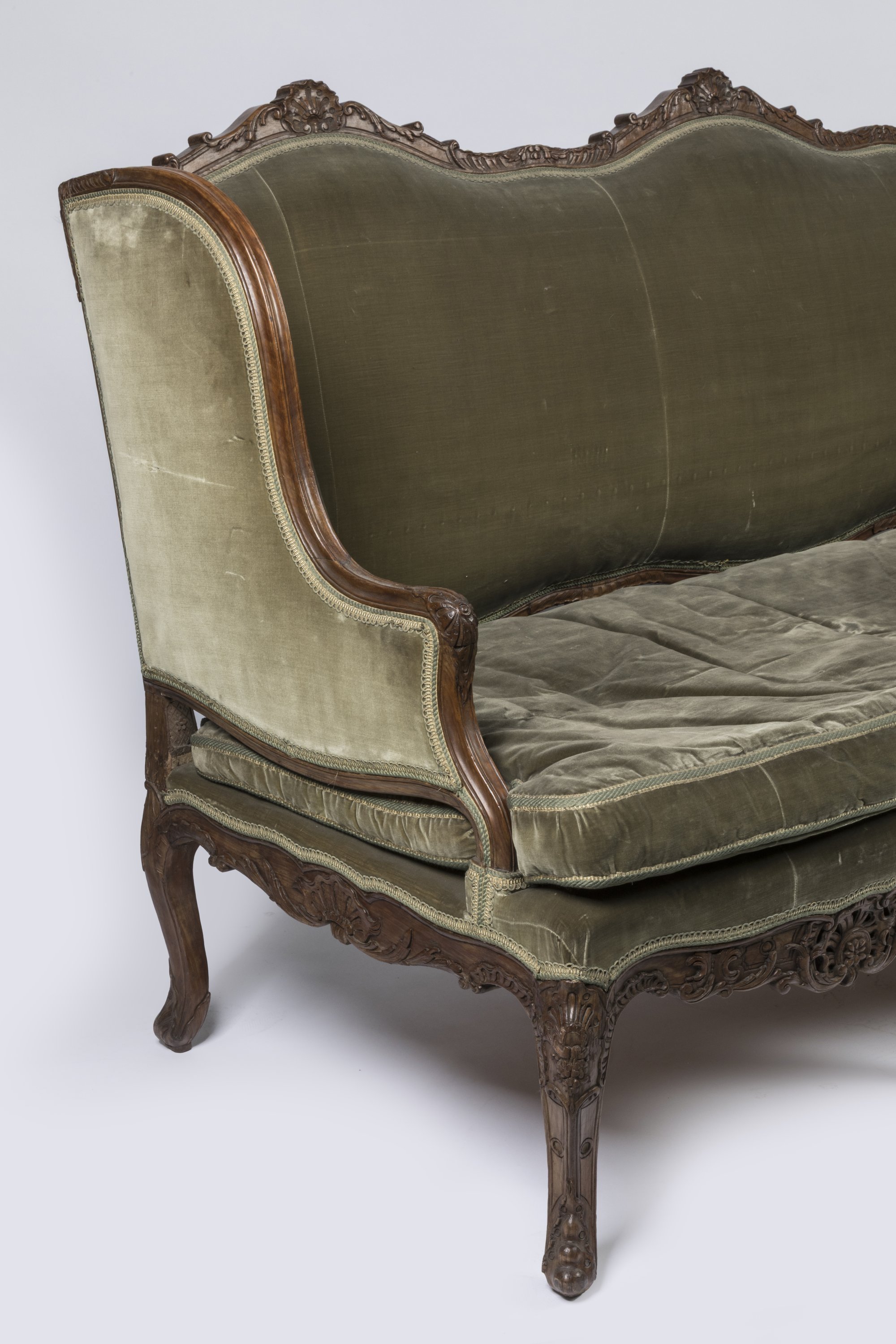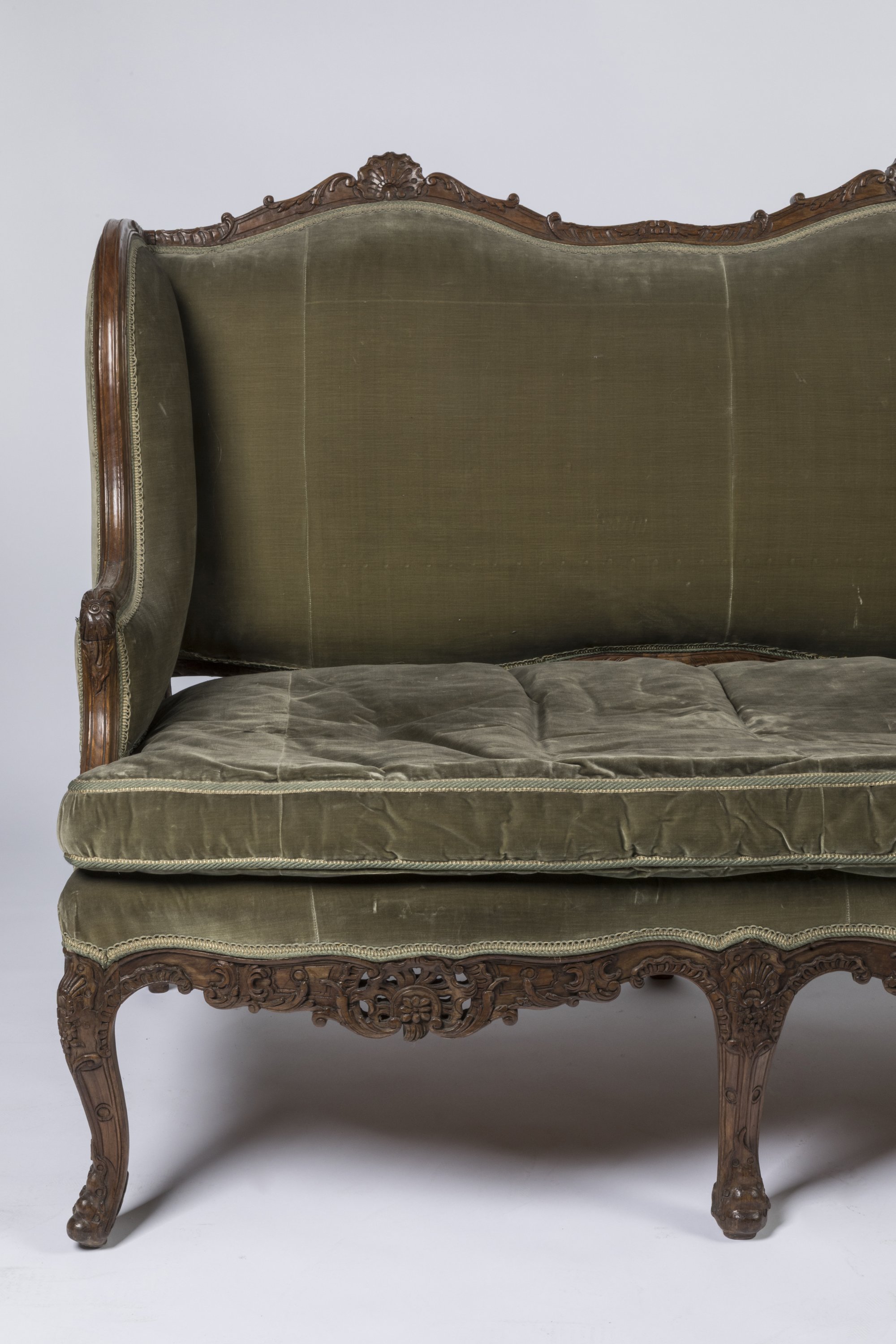 A moulded and carved walnut eared sofa upholstered in green velvet. Louis XV Period, presumably made in Lyon.
