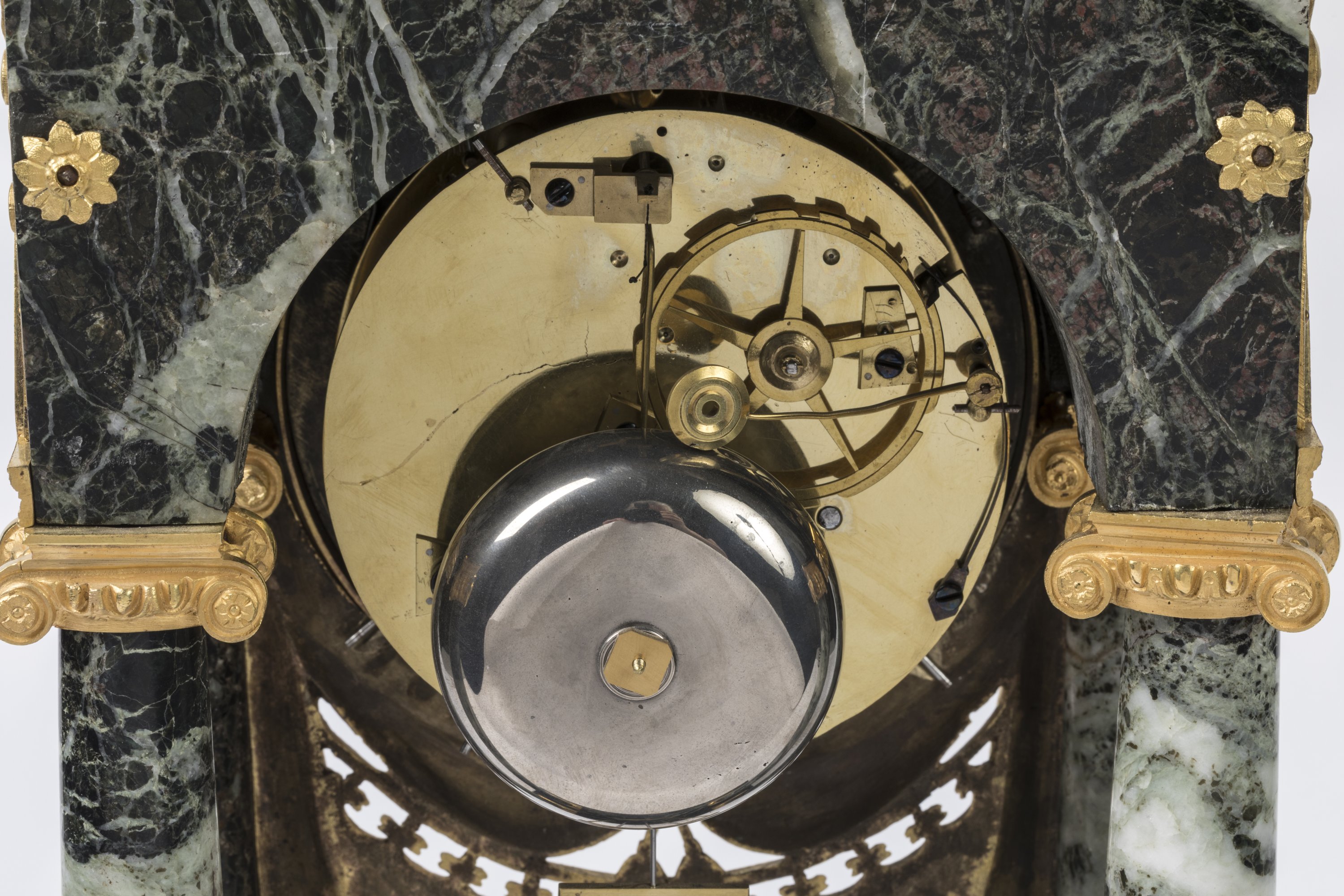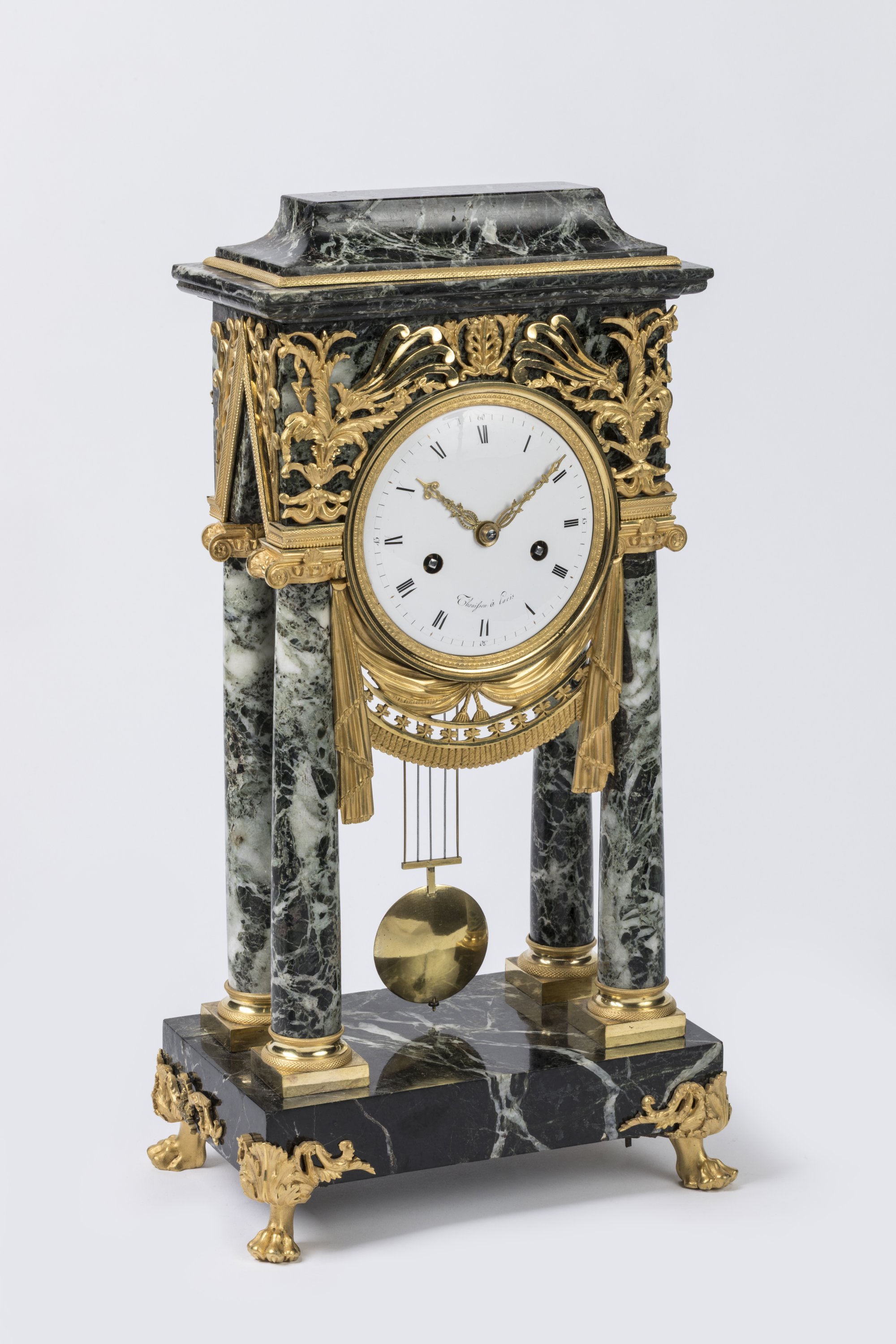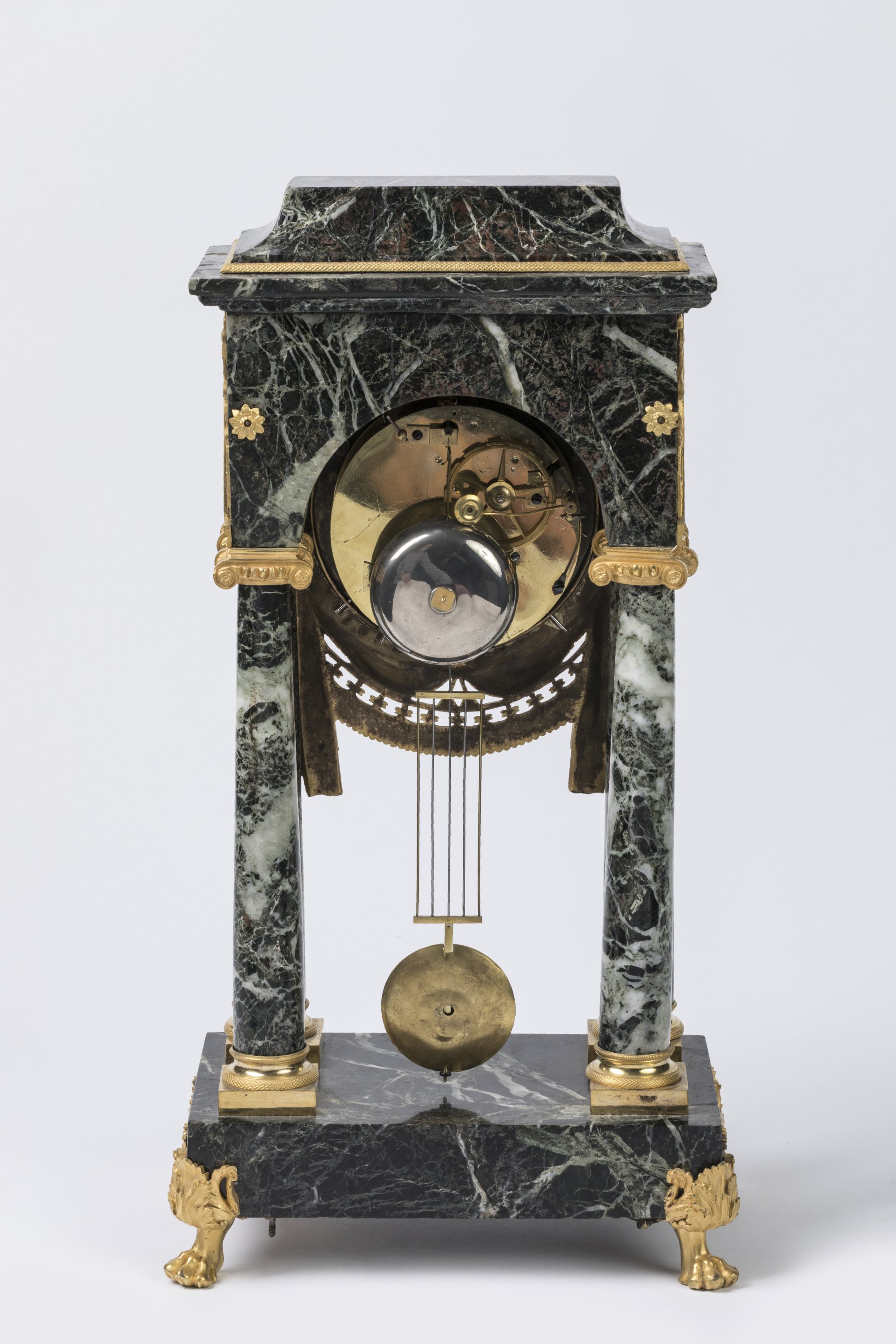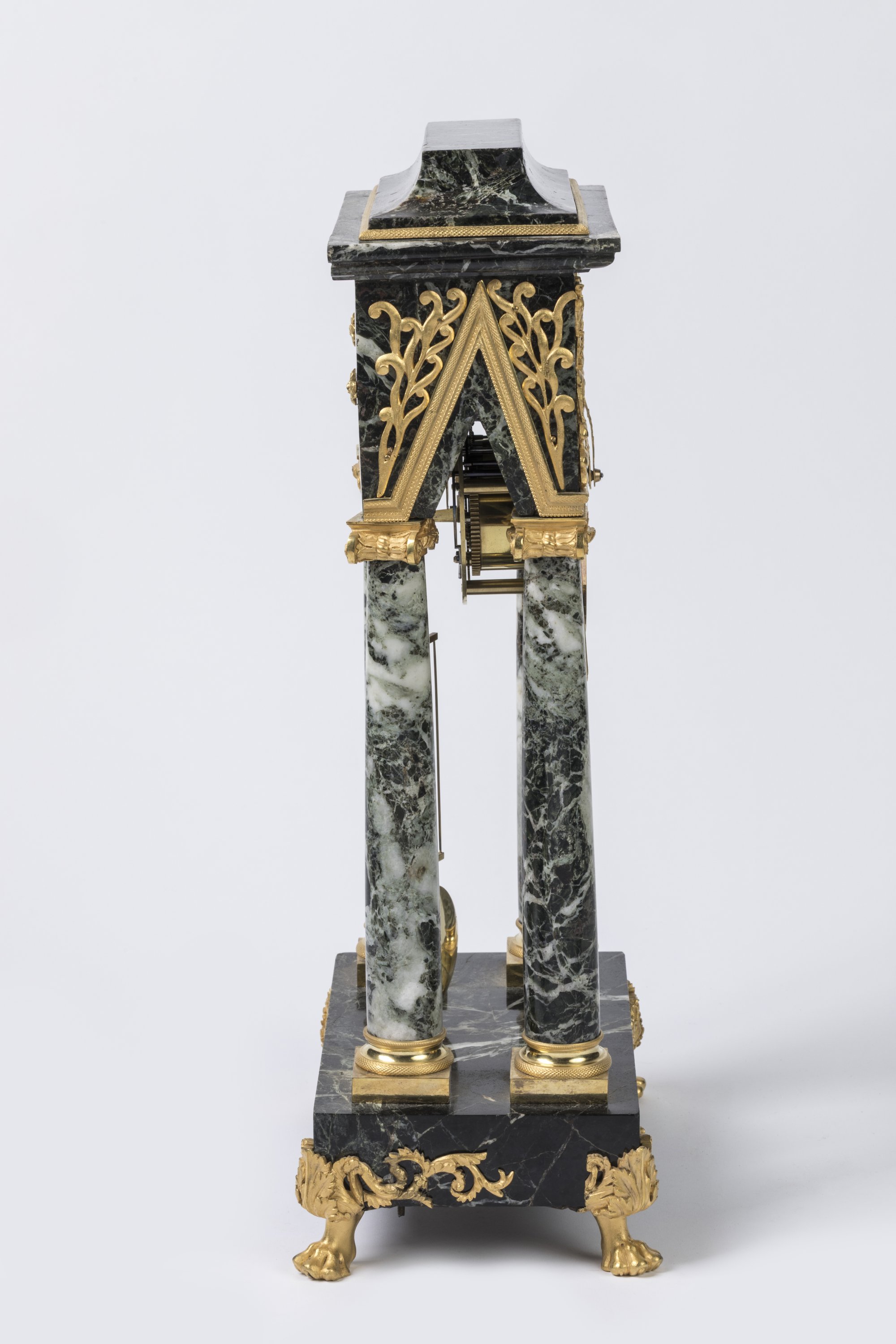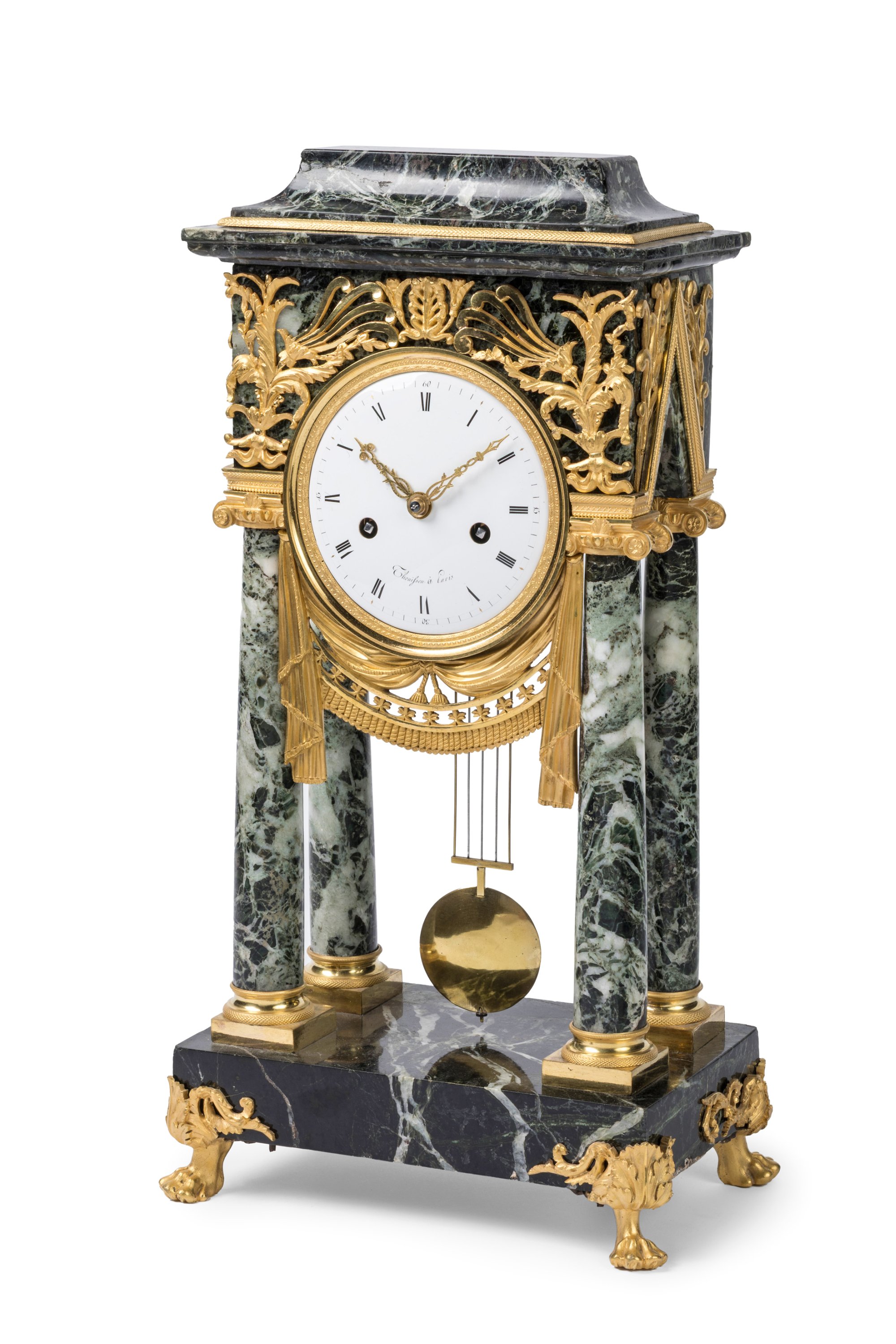An ormolu-mounted green marble portico clock. Signed on the enameled face. Empire Period.