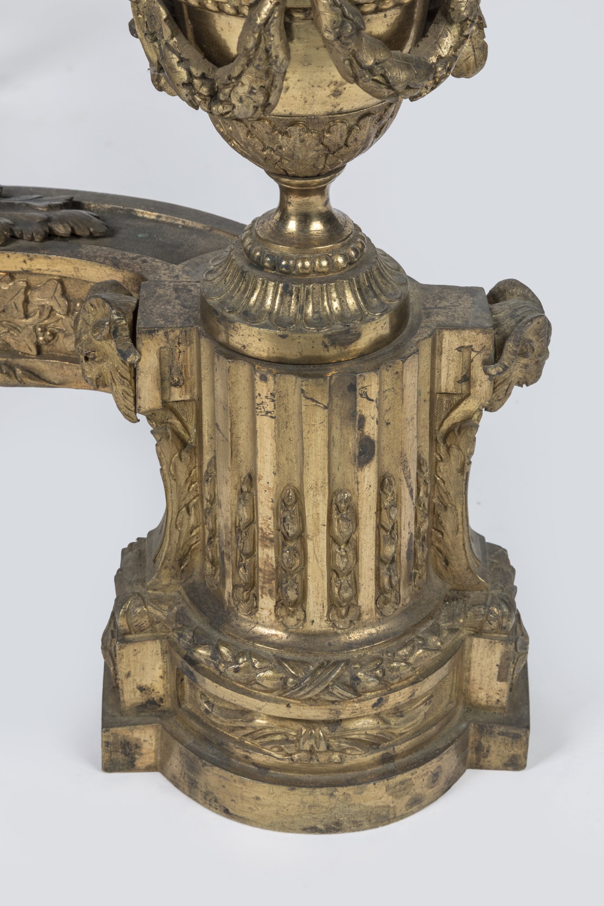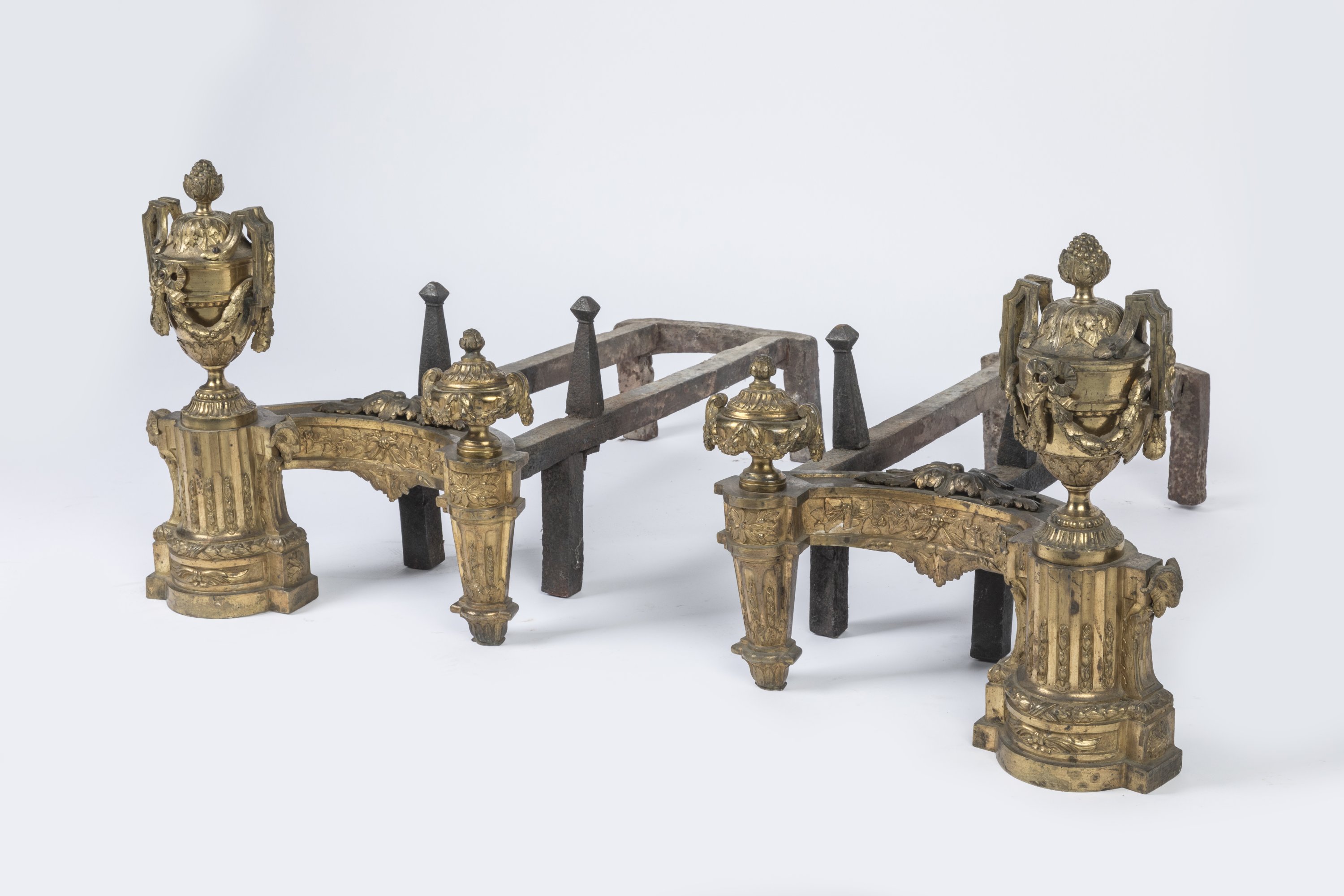 A pair of gilded and chiseled bronze andirons. Louis XVI style, 19th century.