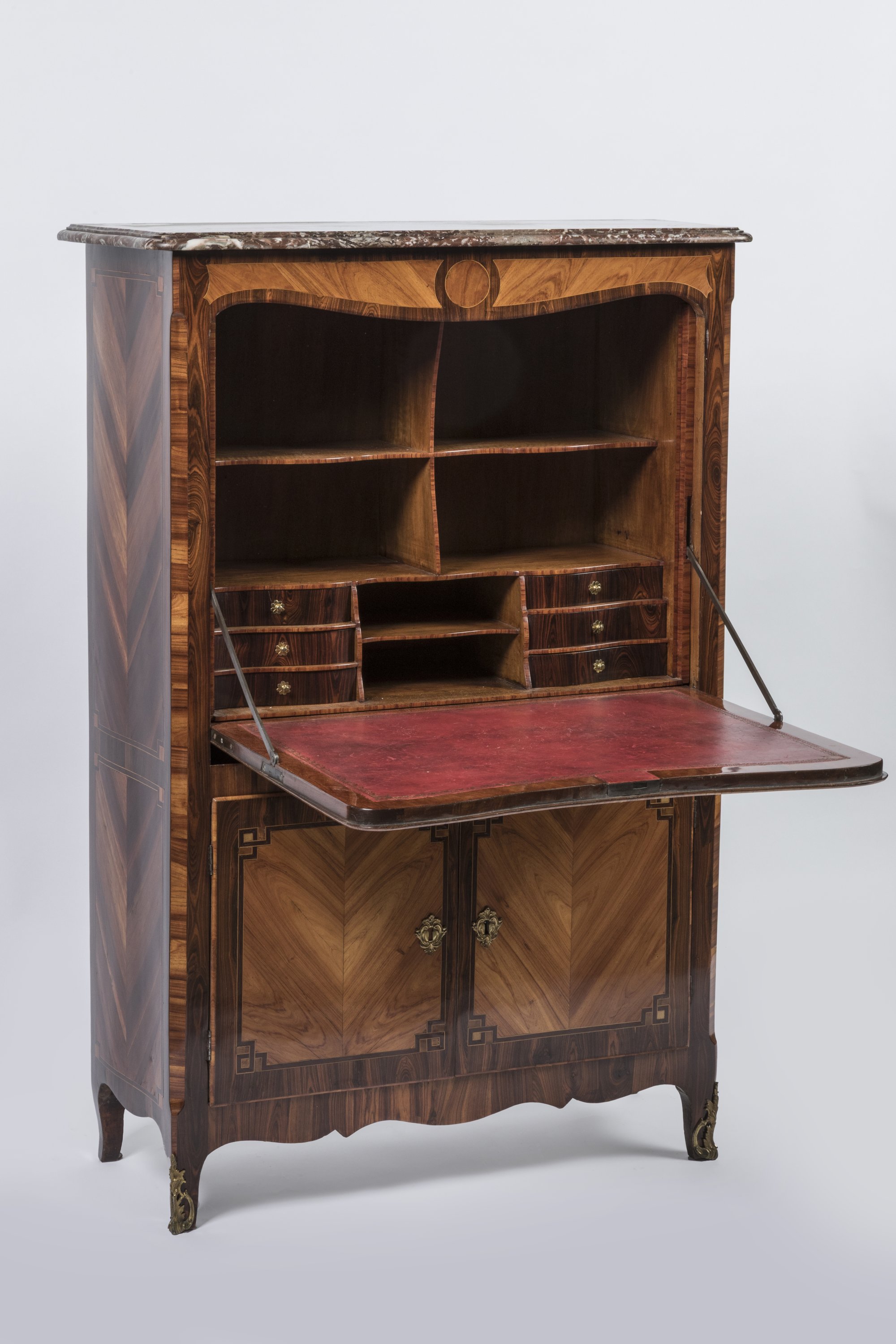 An ormolu mounted fall front desk made of wood veneer (lemontree, rosewood, mahogany and exotic woods) by Jacques van Oostenryk, aka Dautriche. Dark red marble top.
