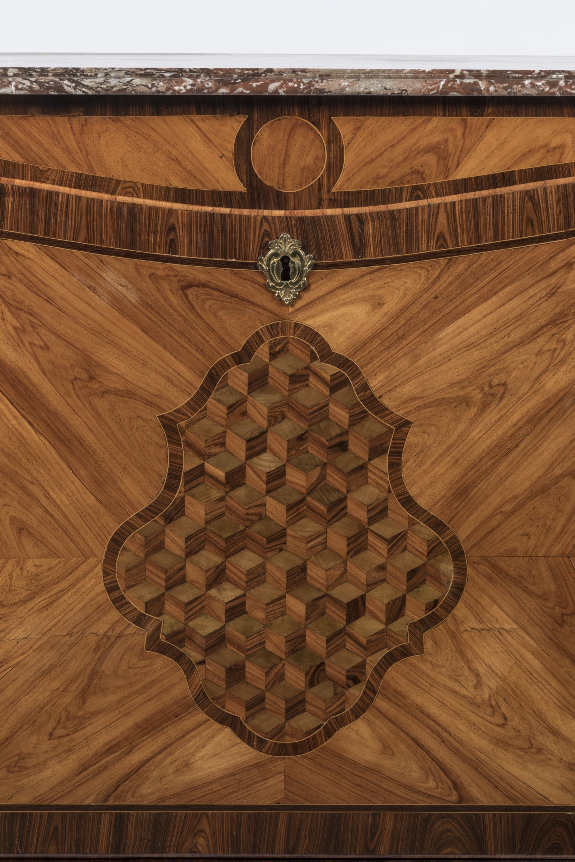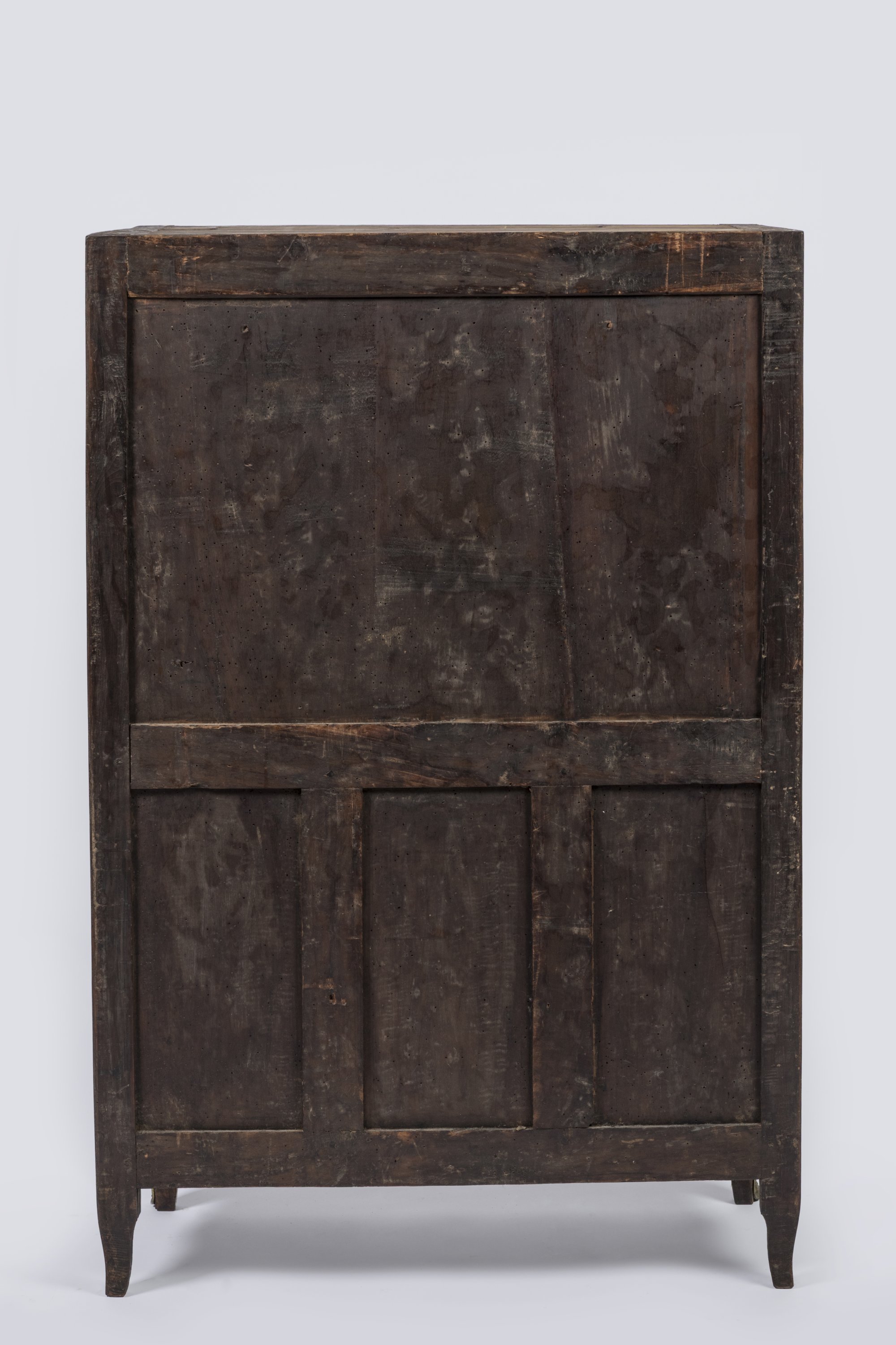 Décor d’un médaillon en marqueterie de cubes en réserve sur fond en ailes de papillon encadré de frises de grecques et de volutes et bordures de palissandre et amarante. En partie inférieure, deux vantaux décorés en "V" sont encadrés de filets et de grecques. L'intérieur est foncé d’un maroquin rouge doré aux petits fers dévoilant quatre niches en partie supérieure et deux en partie inférieure encadrées de six tiroirs. Deux étagères et un coffre amovible. Il repose sur quatre pieds galbés.