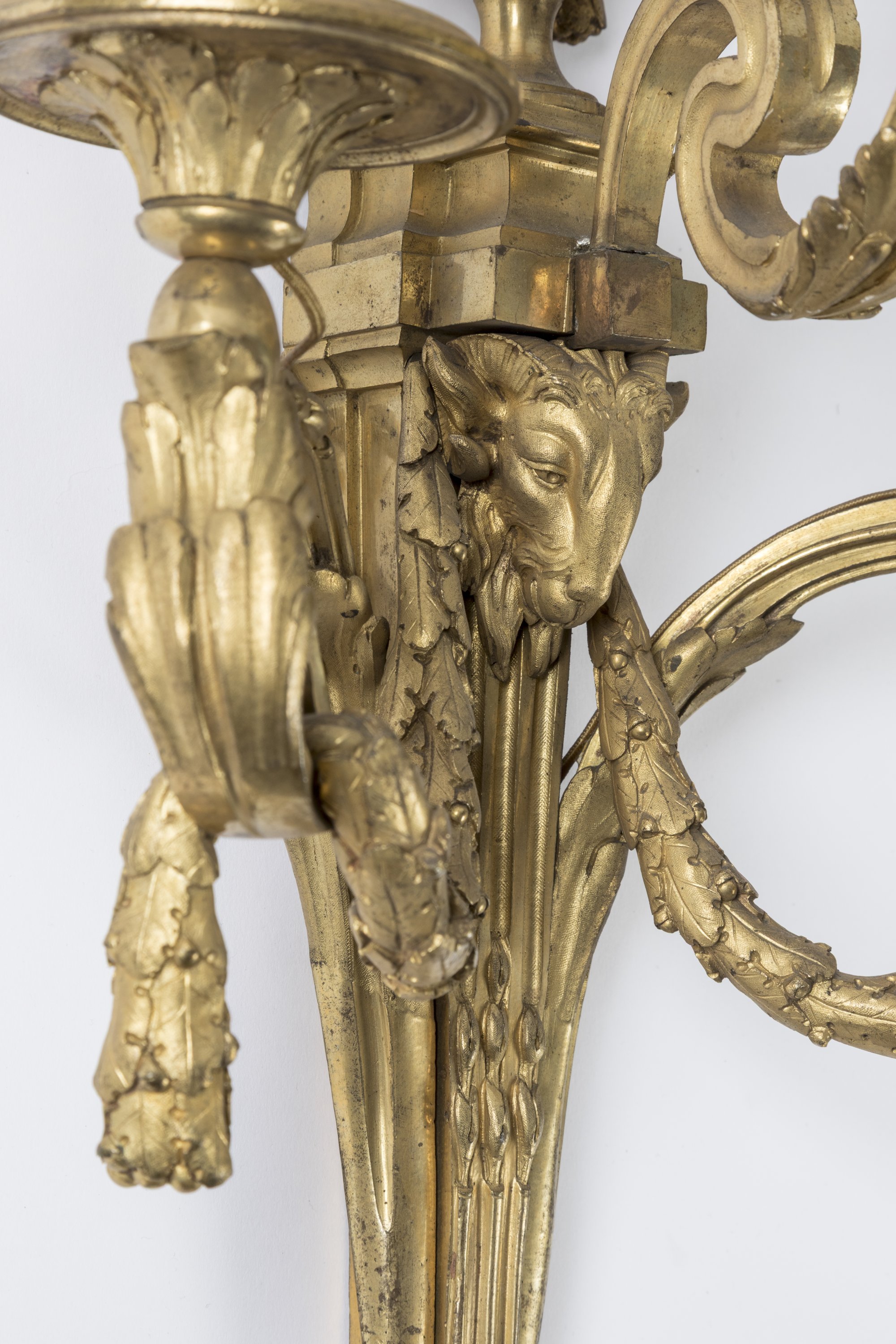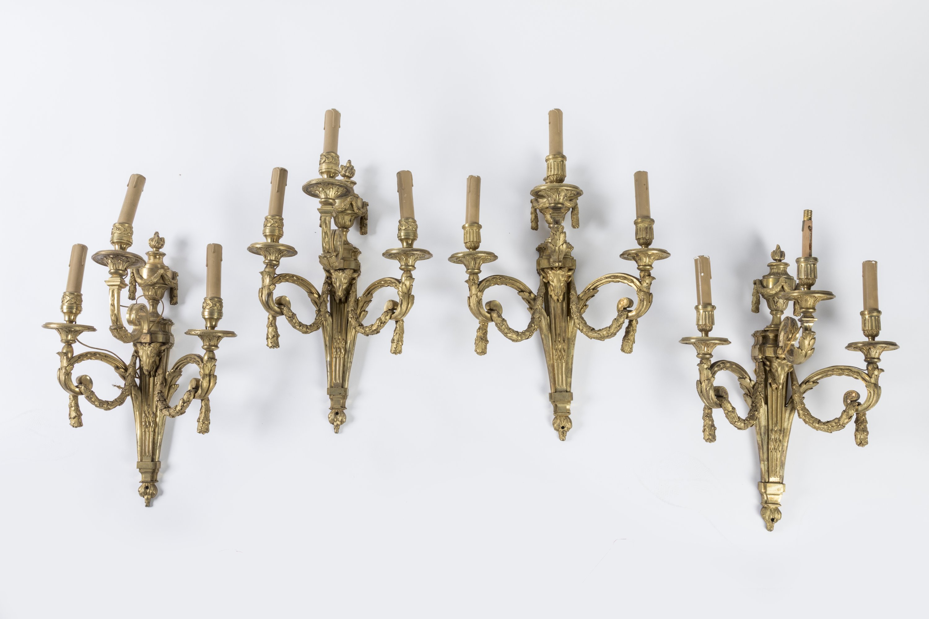 A set of four chiseled ormolu wall sconces decorated with ram heads, after a model from Jean-Charles Delafosse. Louis XVI Period.