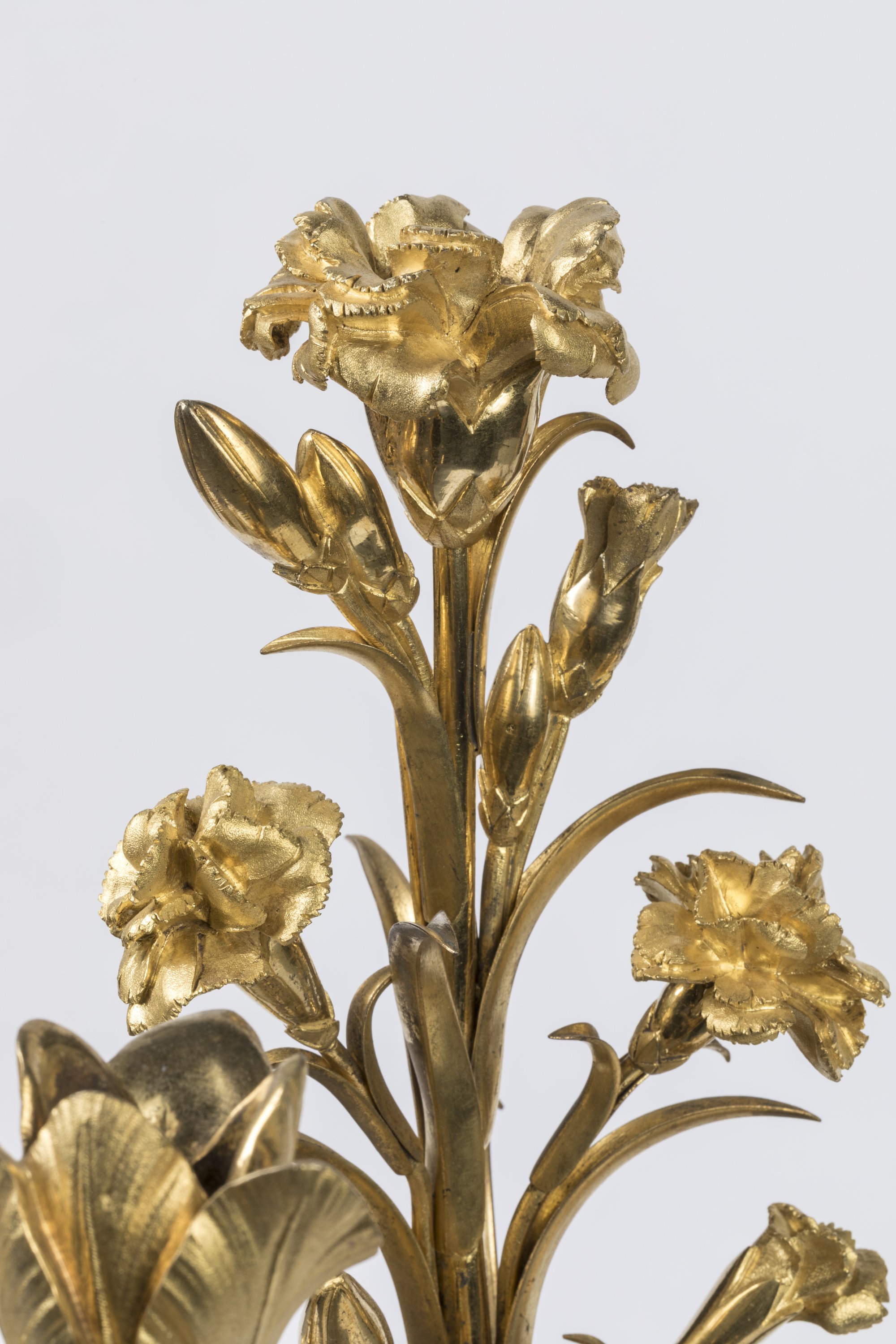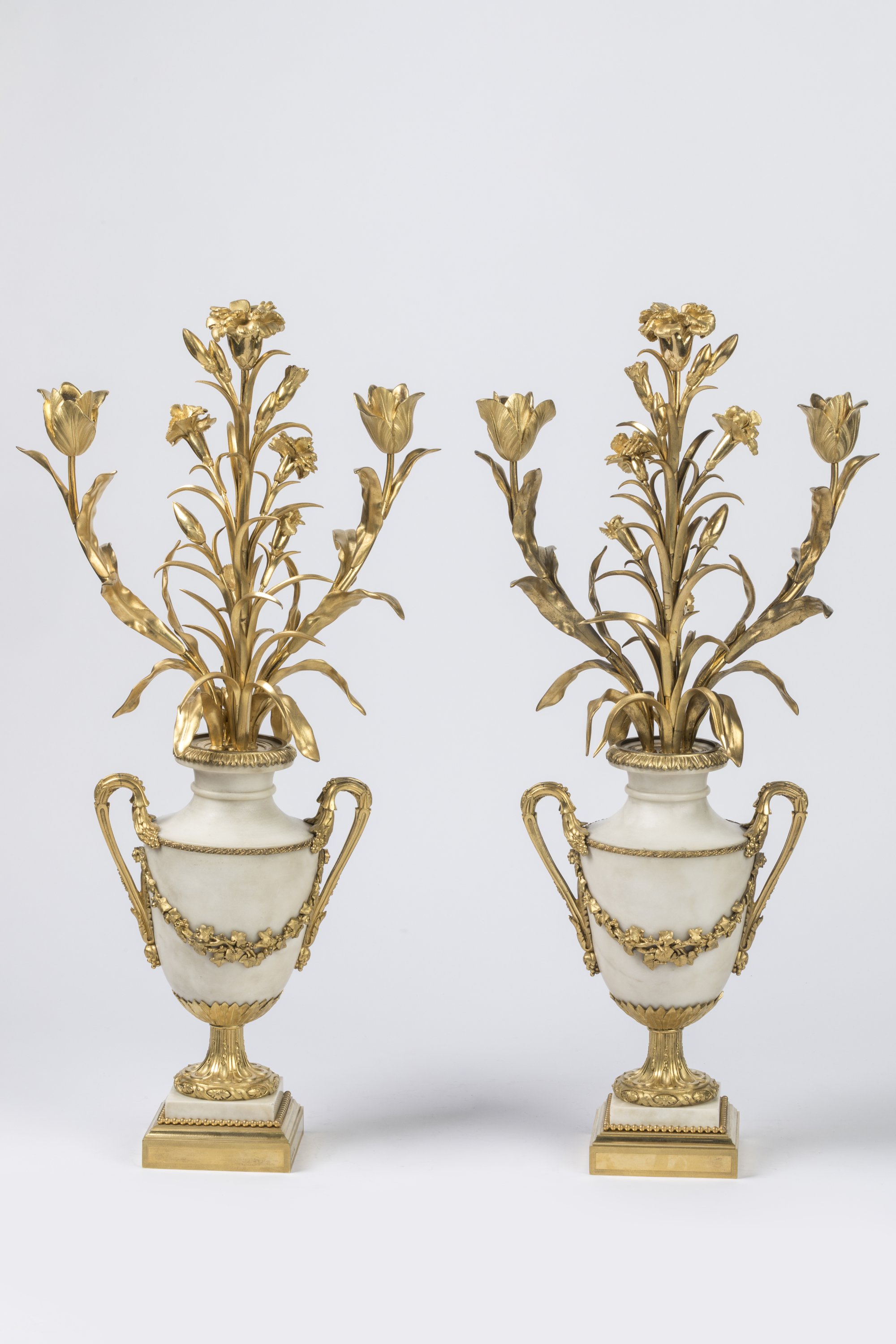 Deux vases urnes à l'antique reposant sur une base rectangulaire accueillent un bouquet de fleurs et tulipes. Trois lumières.