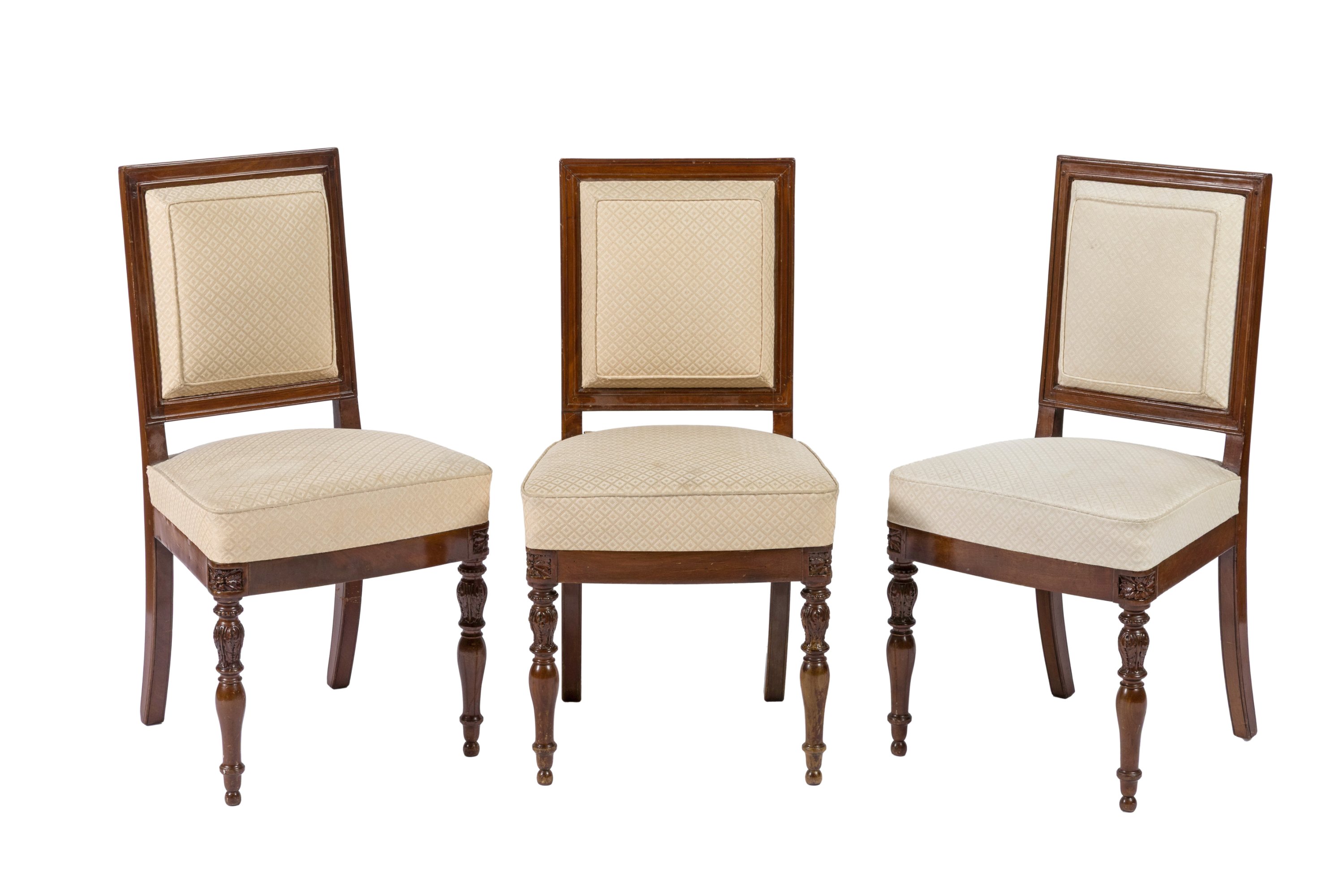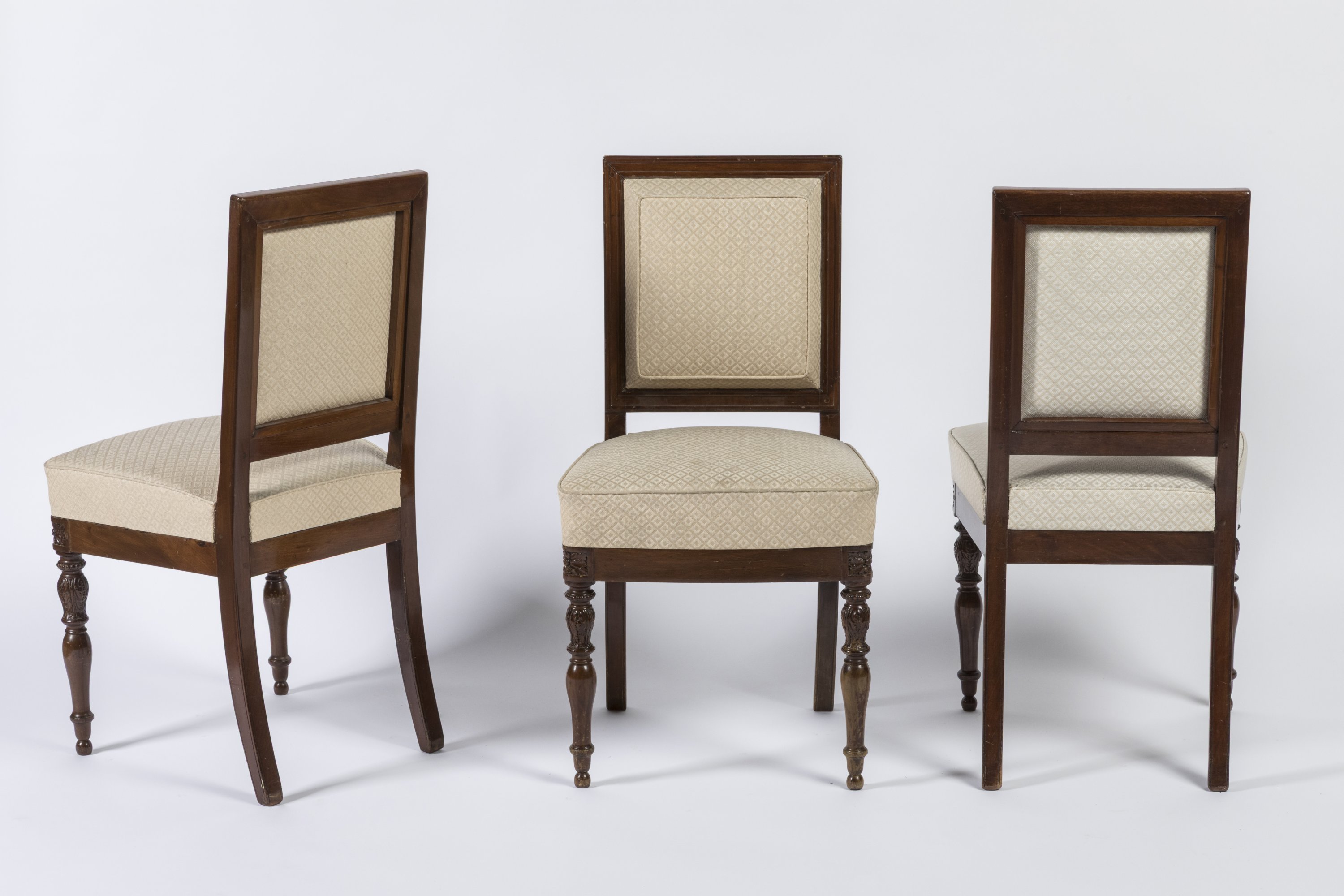 Three mahogany flat-back chairs. Ivory and white diamond upholstery. Georges Jacob stamp. Empire Period.