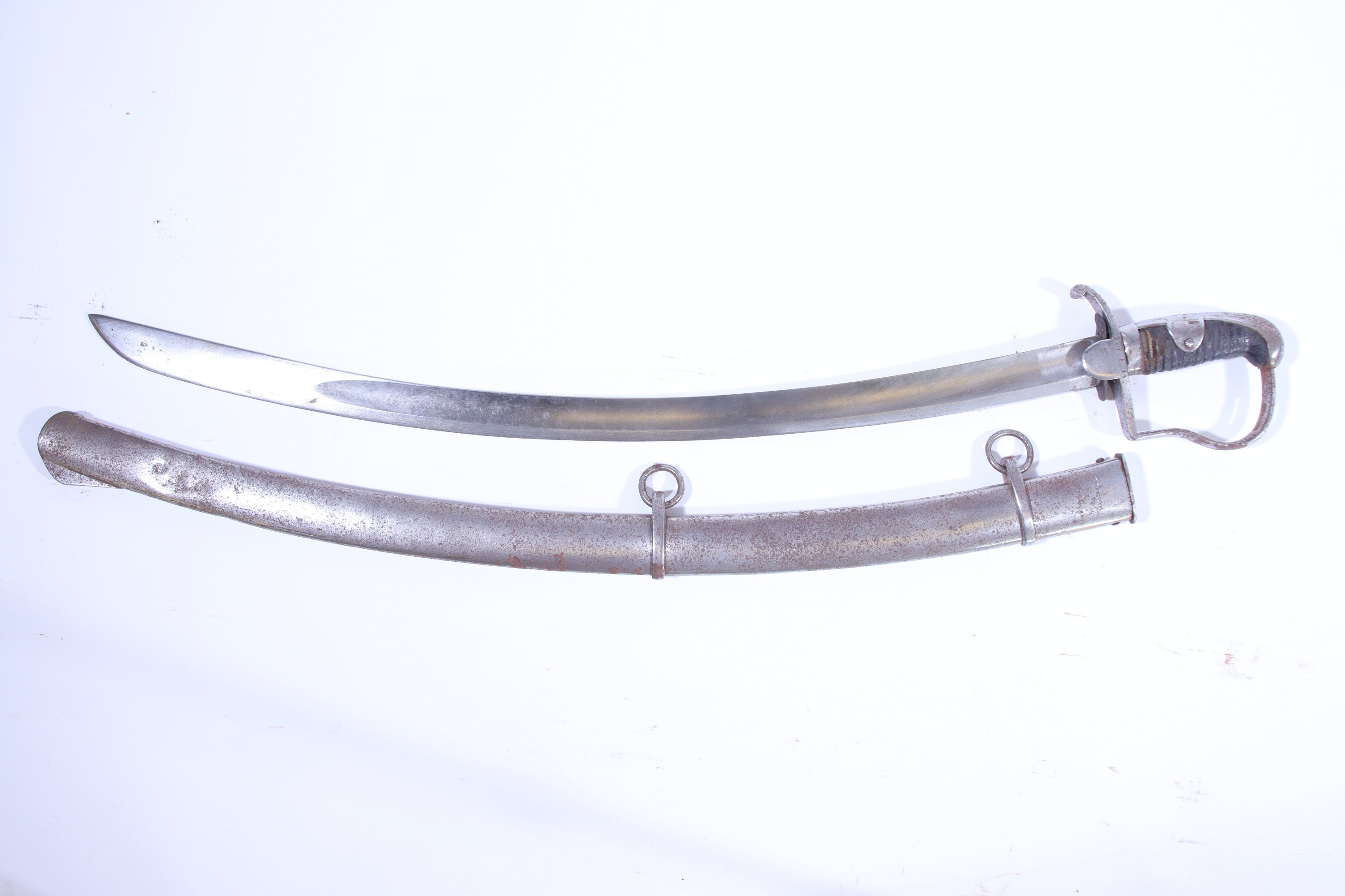 Poignée recouverte de cuir avec filigrane. Monture en fer, garde à la Blücher. Croisière et fourreau matriculés « 3.r.E.99 ».