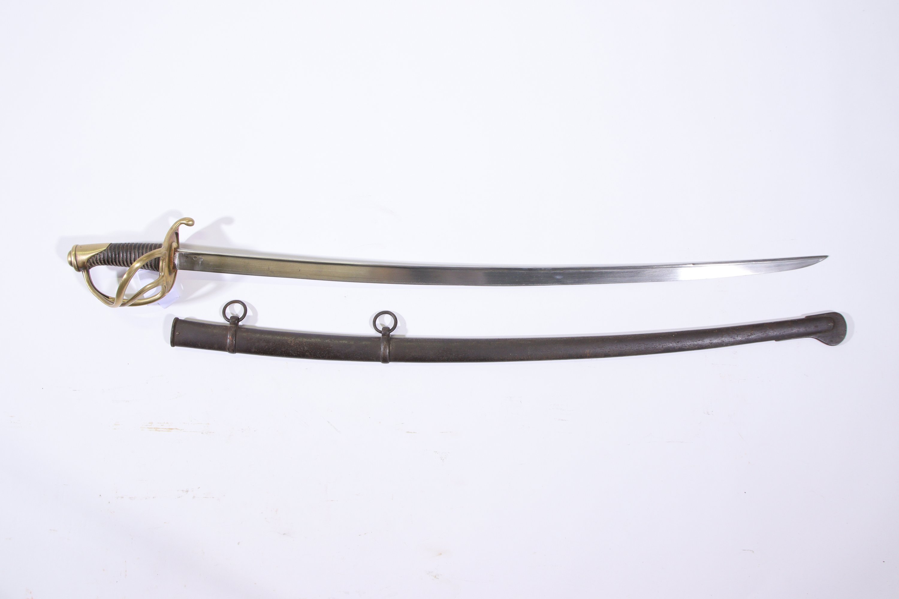 Poignée recouverte de cuir (manque le filigrane). Monture en laiton, garde à trois branches et quillon en goutte d’eau. Lame à dos rond de Klingenthal poinçonnée et datée « Mai 1821 ». Fourreau en tôle de fer à deux bracelets (piqûres).