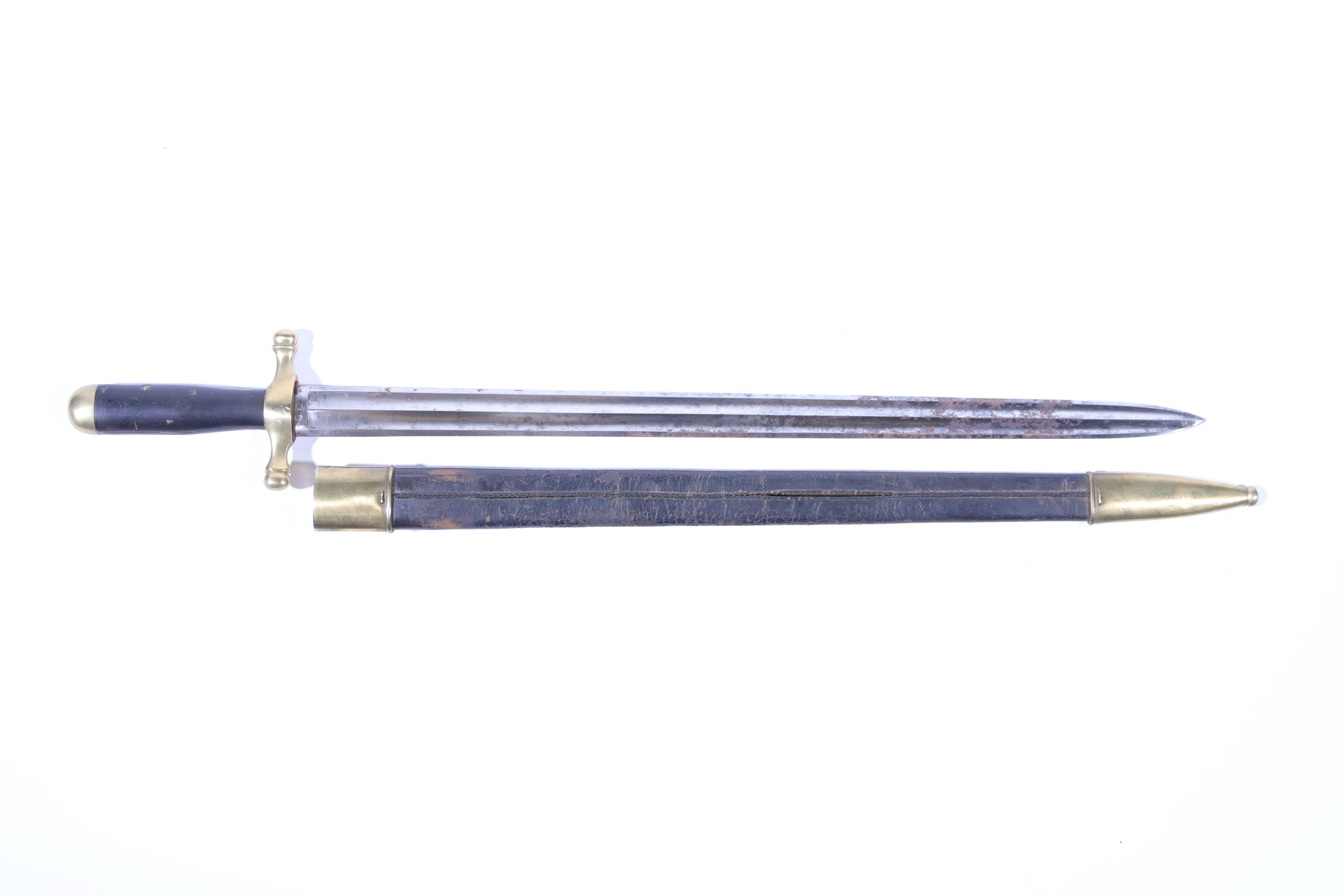 Poignée en ébène, monture en laiton, garde à deux quillons, lame à double pans creux.