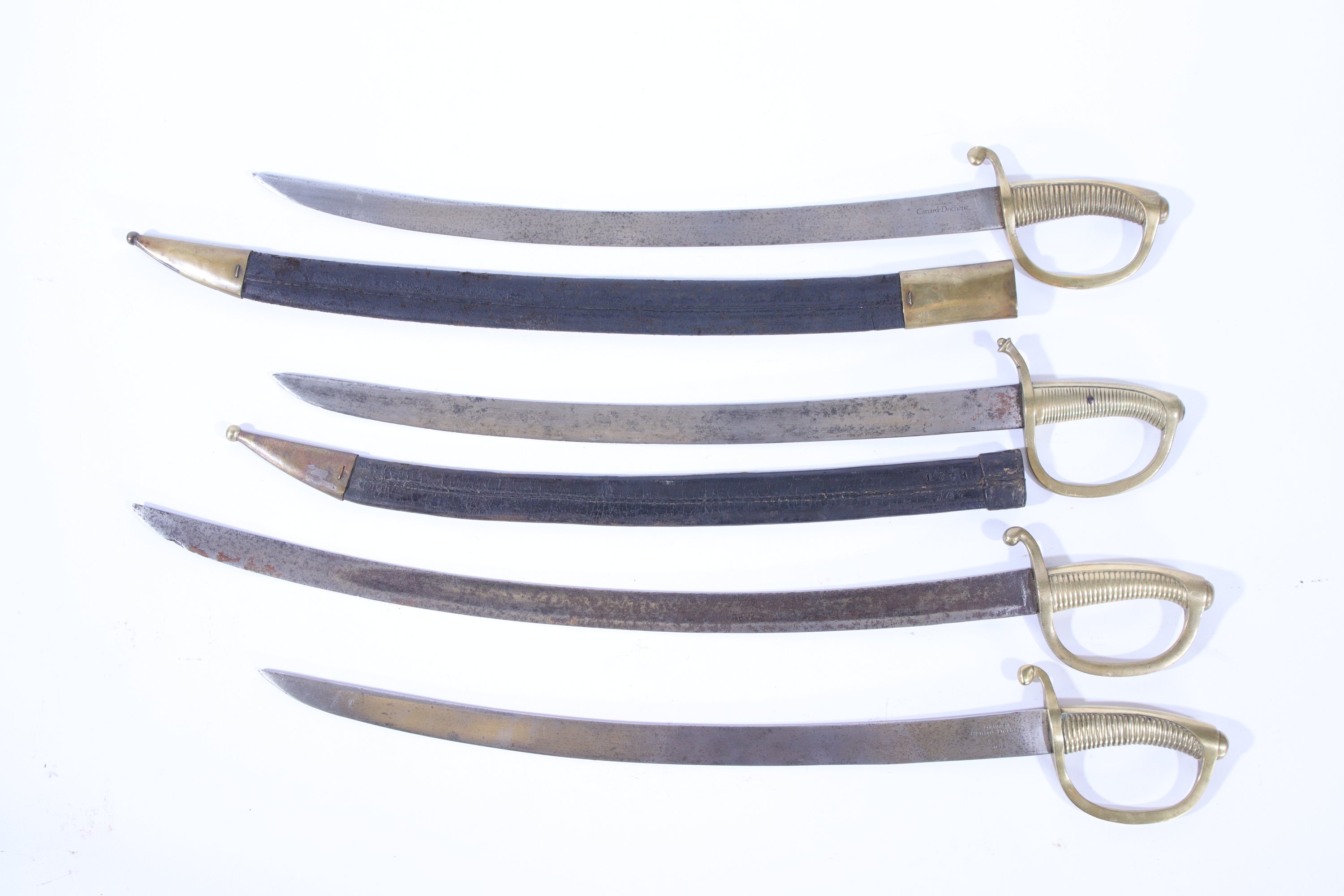 Ensemble de quatre sabres briquets, dont deux modèles pour sabrer le champagne et un modèle allemand à fourreau en cuir, daté 1831.