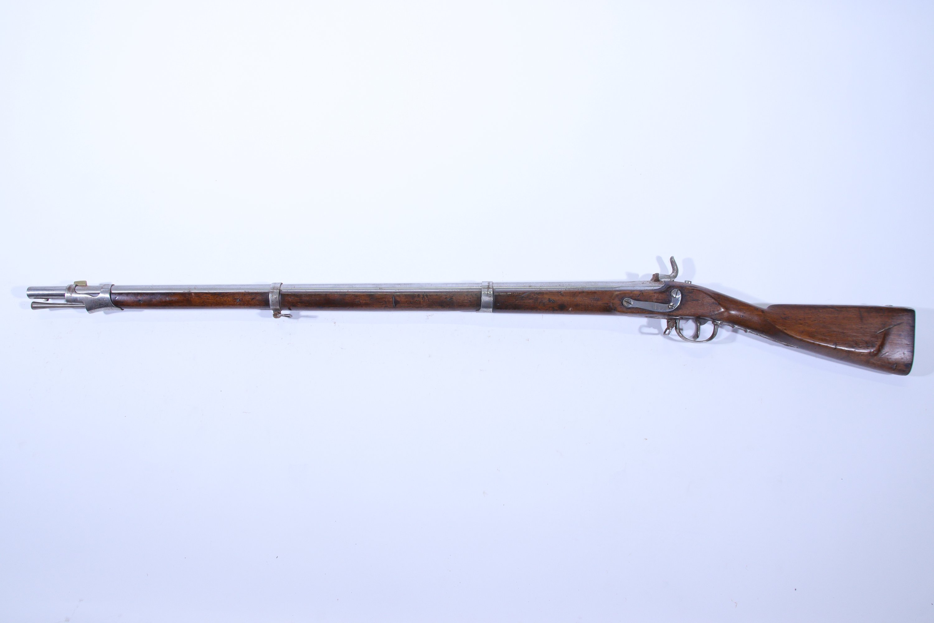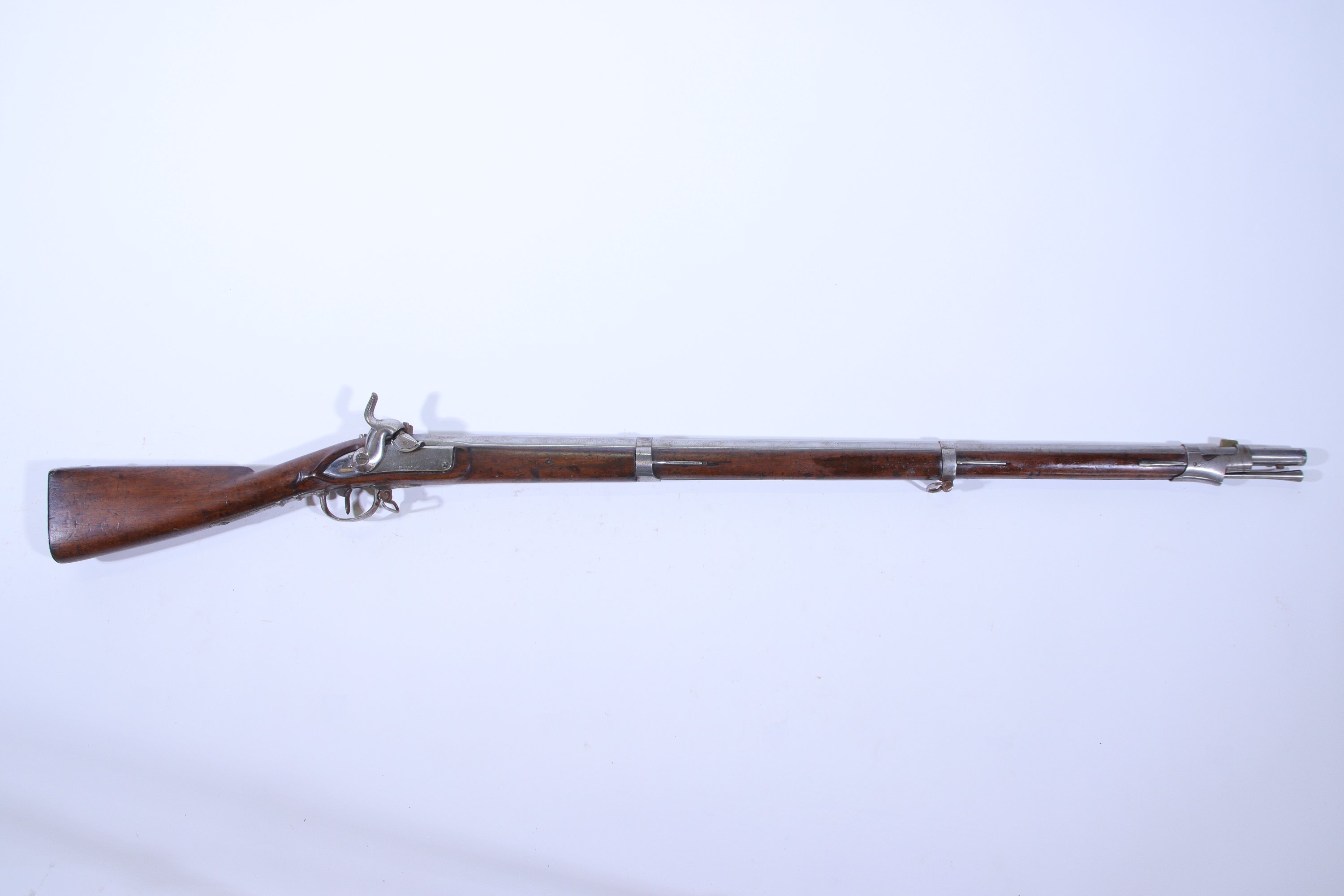 Canon rond à pans au tonnerre, avec cran de mire. Platine signée « P.J MALHERBE A LIEGE » et chien à corps rond (piqûres). Garnitures en fer poinçonné « D » sous couronne.