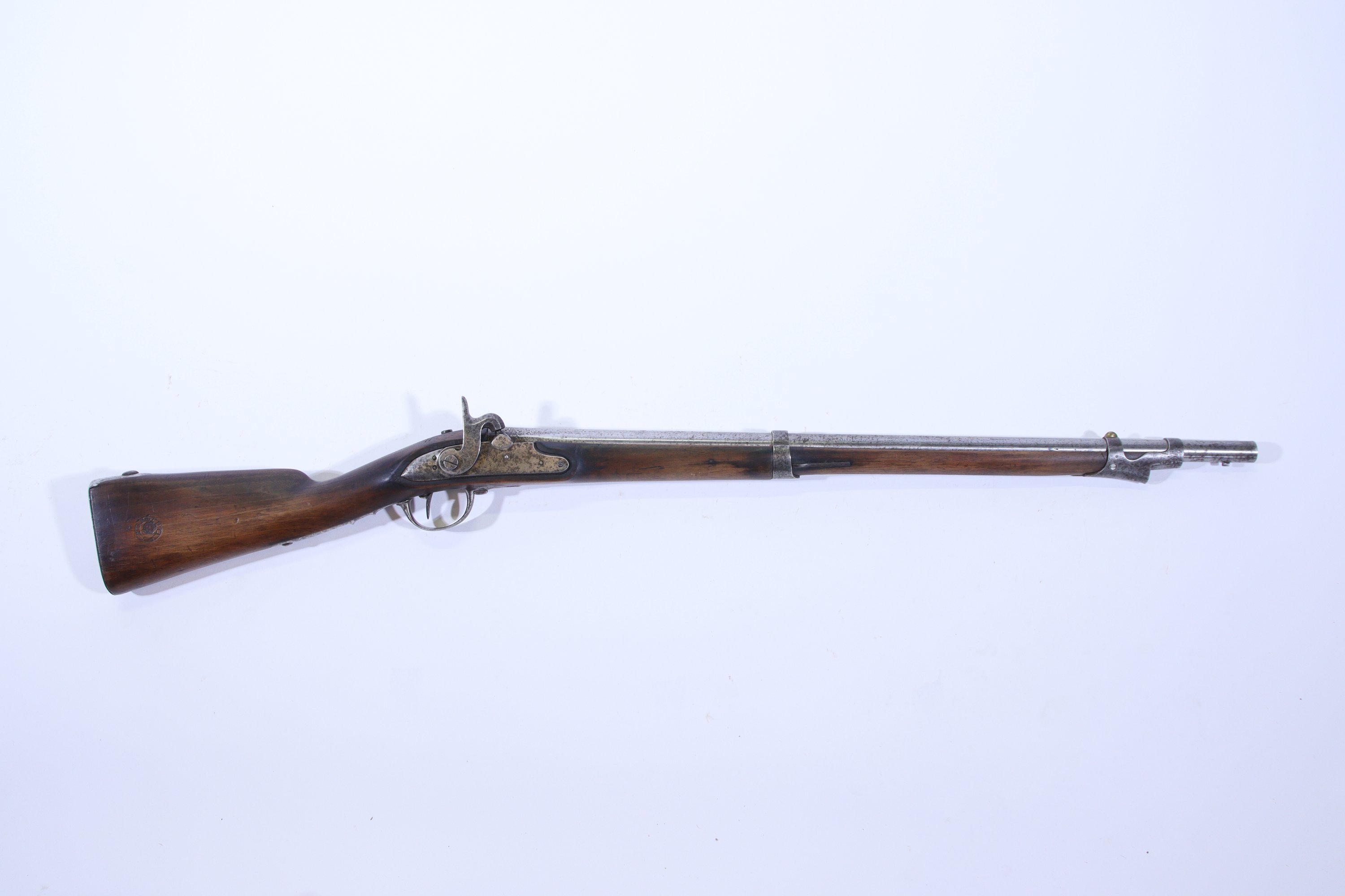 Canon rond à pans au tonnerre daté 1816, queue de culasse frappée M1777. Platine et chien à corps plat, garnitures en fer, crosse en noyer avec marquage PDL.