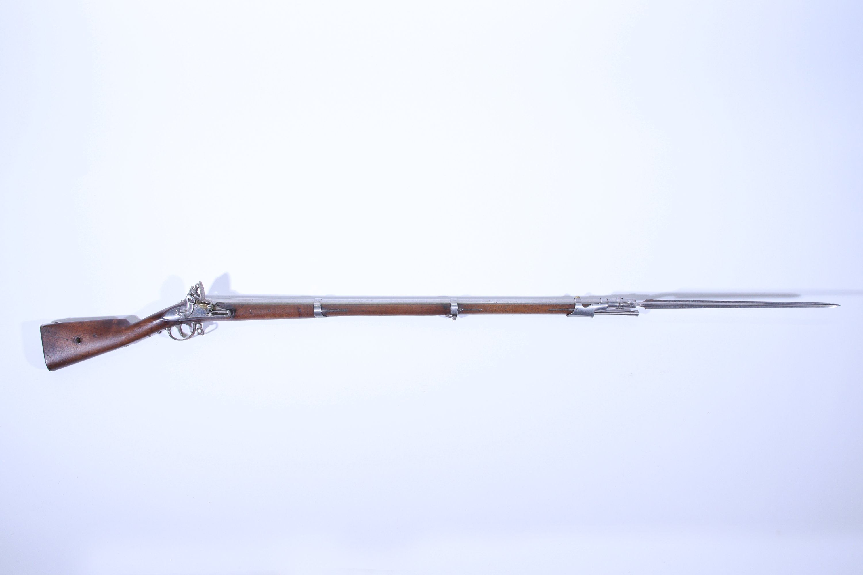 Platine « Mre Rle de Maubeuge » et chien à corps rond. Bassinet en laiton poinçonné. Garnitures en fer poinçonné.