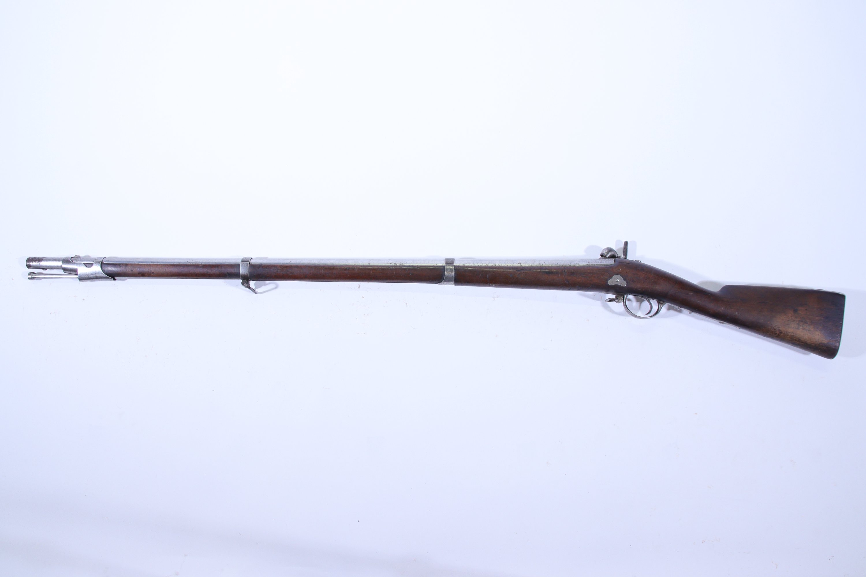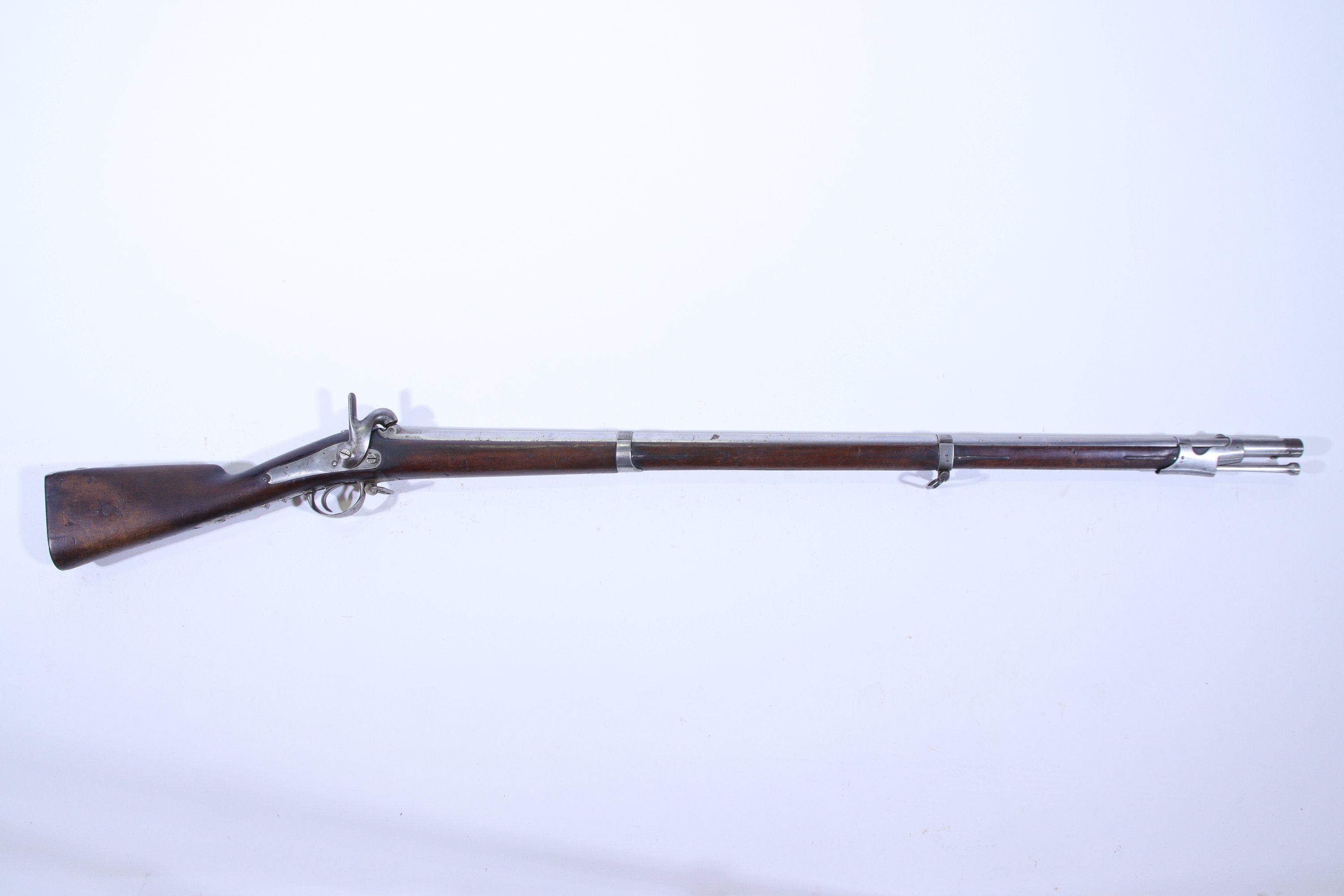 Canon rond à pans au tonnerre, poinçonné. Queue de culasse avec marquages « Mle 1842 T ». Platine arrière marquée « Mre Nle de Tulle » et chien à corps rond. Garnitures en fer poinçonné. Crosse en noyer avec cachet. Baguette en fer.