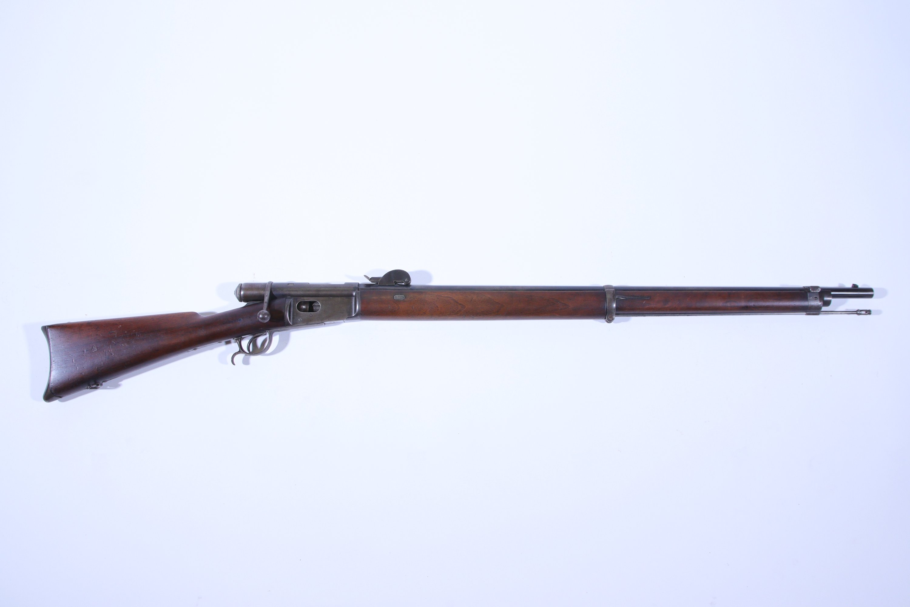 Boîtier de culasse marqué de la Waffenfabrik de Bern. Garnitures en fer poinçonné. Crosse en noyer avec marquages.
