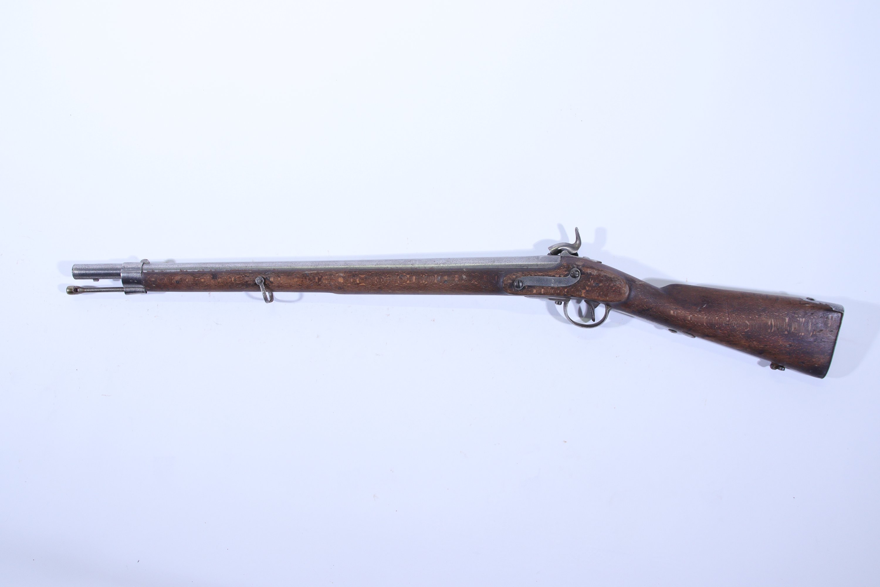 Canon rond, à pans au tonnerre. Platine corps plat, chien à corps rond, avec sécurité à l’avant. Garnitures en fer.