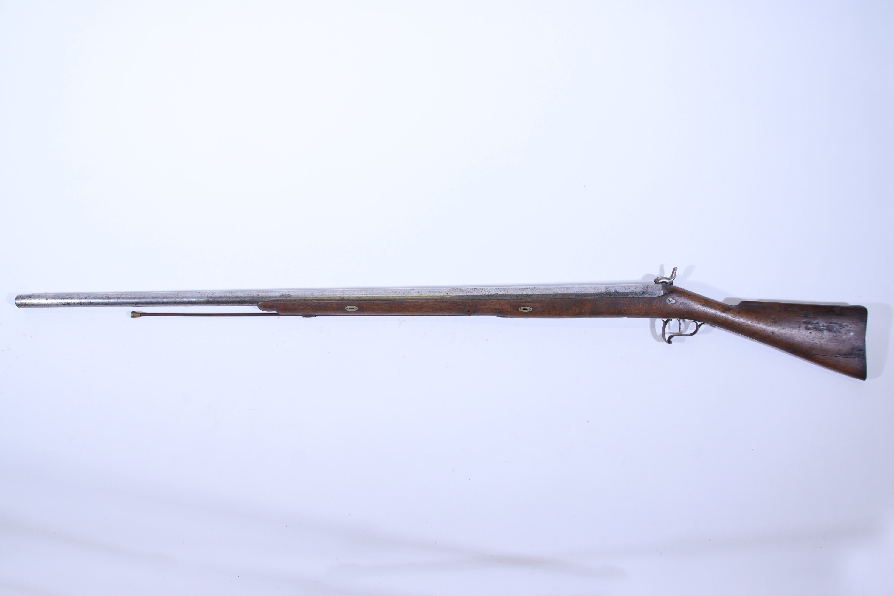 Garniture en fer, crosse en noyer (petites entures et usures), baguette en bois à embout laiton.
