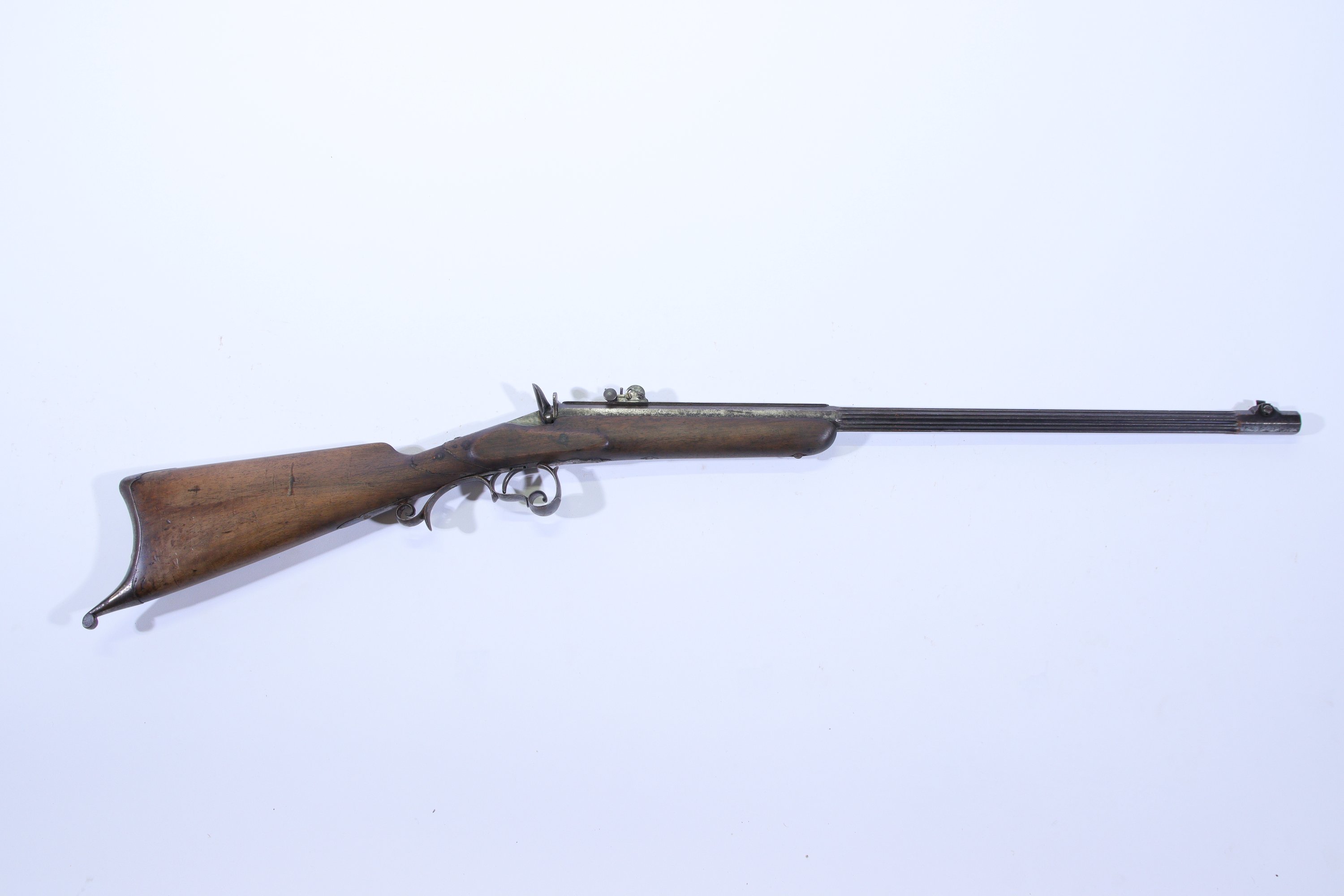 Canon cannelé puis à pans, avec hausse, gradué à l’or au tonnerre. Extracteur à deux oreilles. Garnitures et plaque de couche à croc en fer. Crosse en noyer (cassure au col).