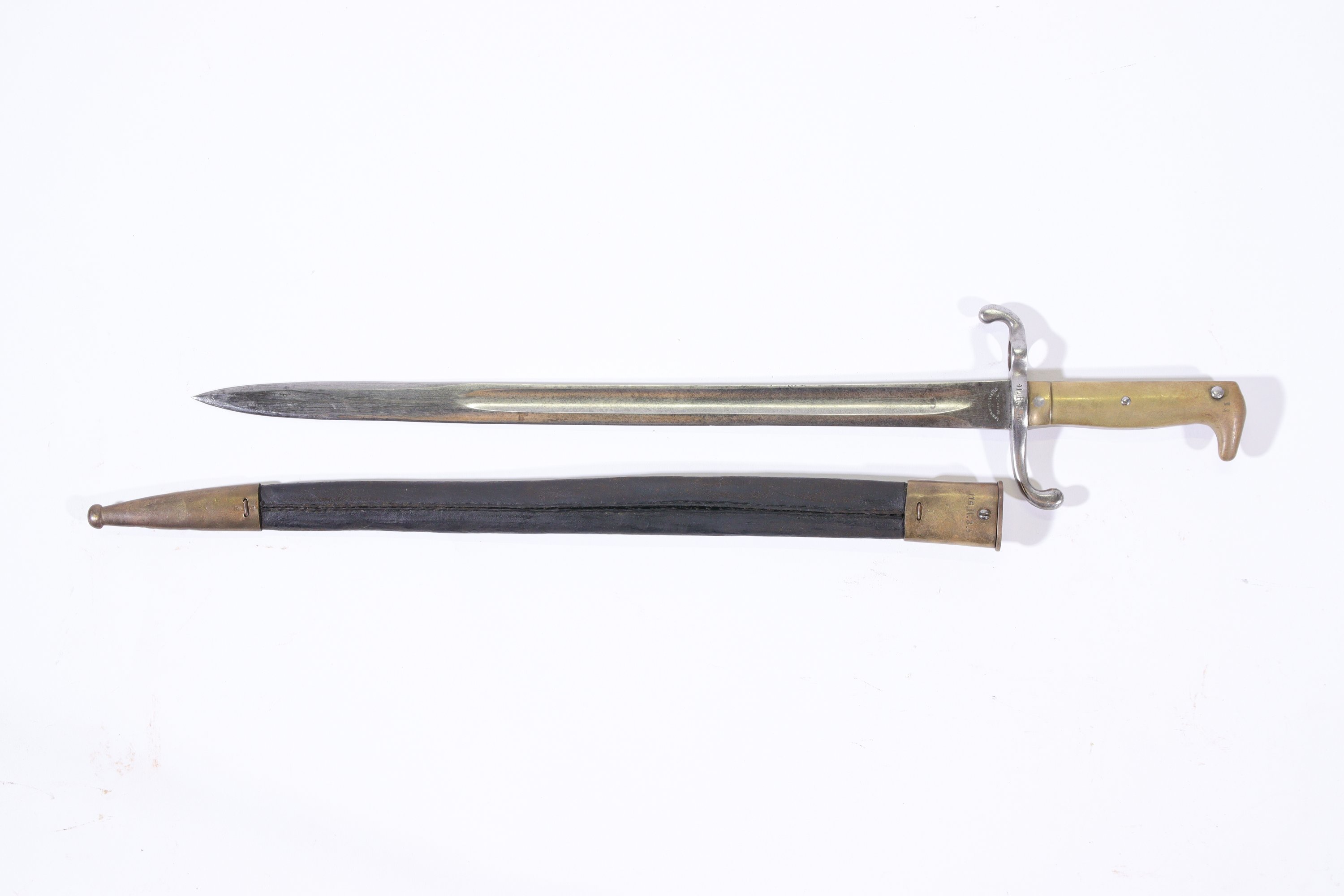 Poignée en laiton, lame signée Weyersberg, fourreau en cuir noir à deux garnitures en laiton.