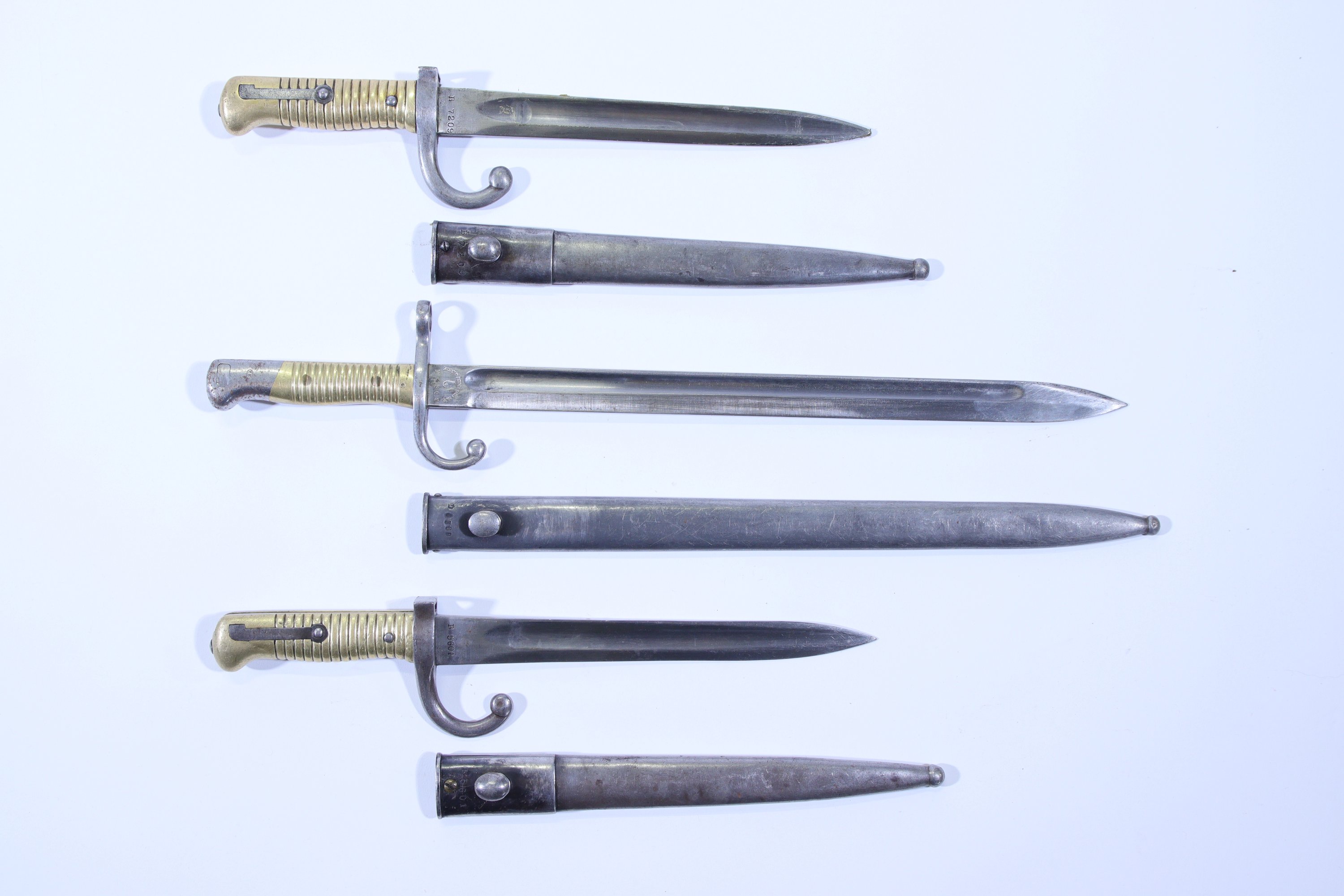 - Deux couteaux baïonnettes modèle 1879-09. Fourreaux en tôle de fer.