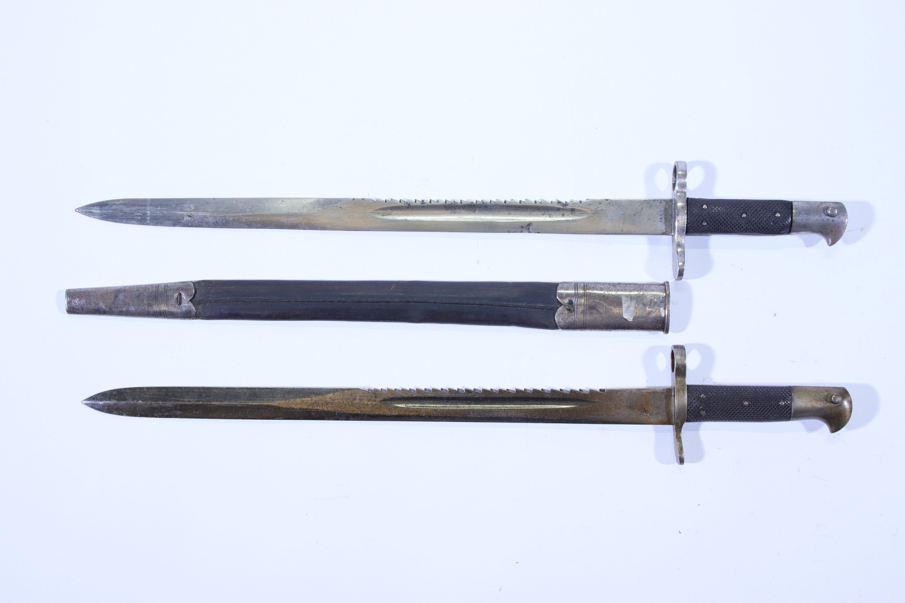 Lames à dos scie, une avec fourreau en cuir et deux garnitures en fer.