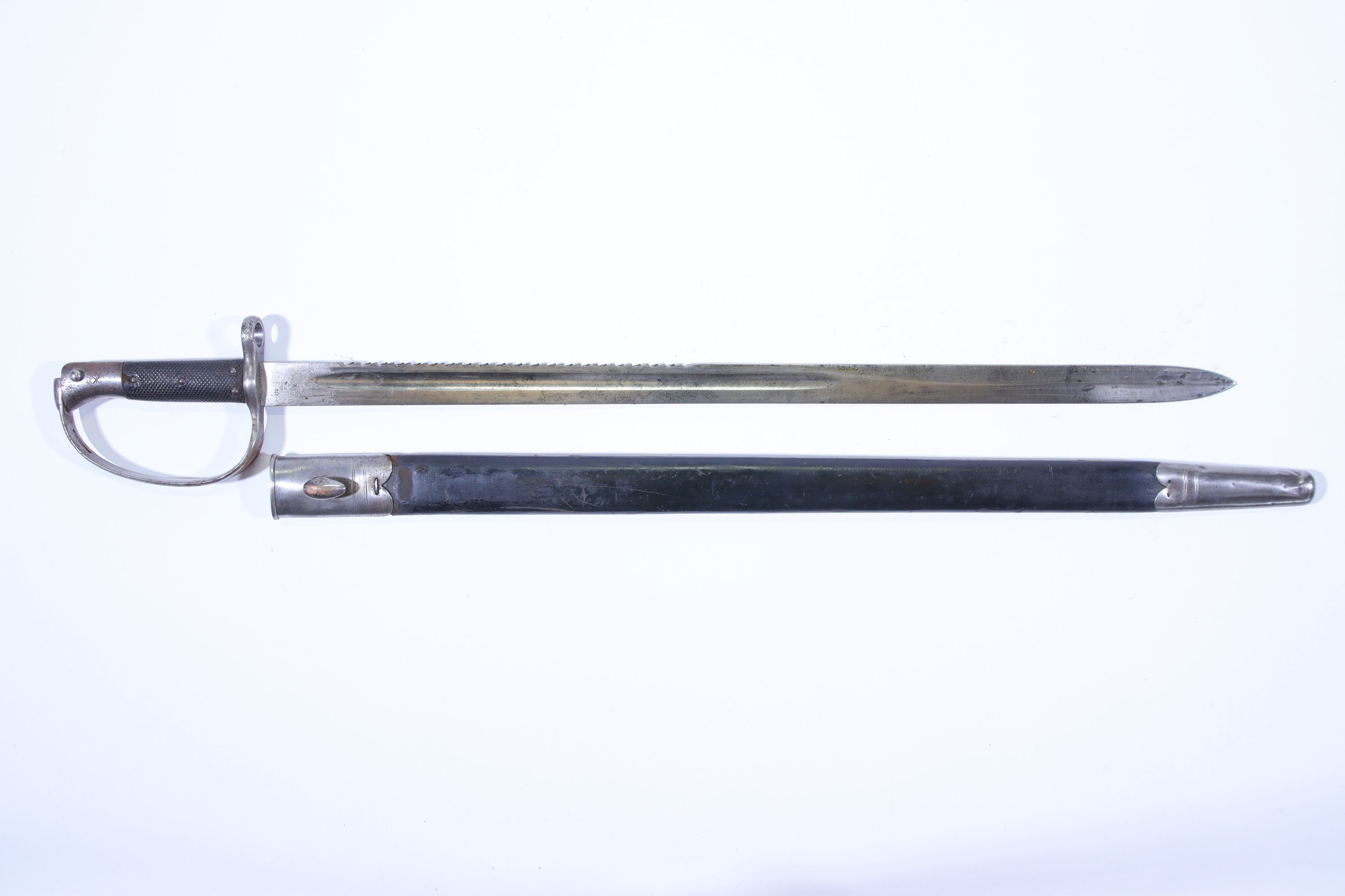 Poignée à plaquettes de caoutchouc, monture en fer lame à dos scie poinçonnée, fourreau en cuir à deux garnitures en fer.