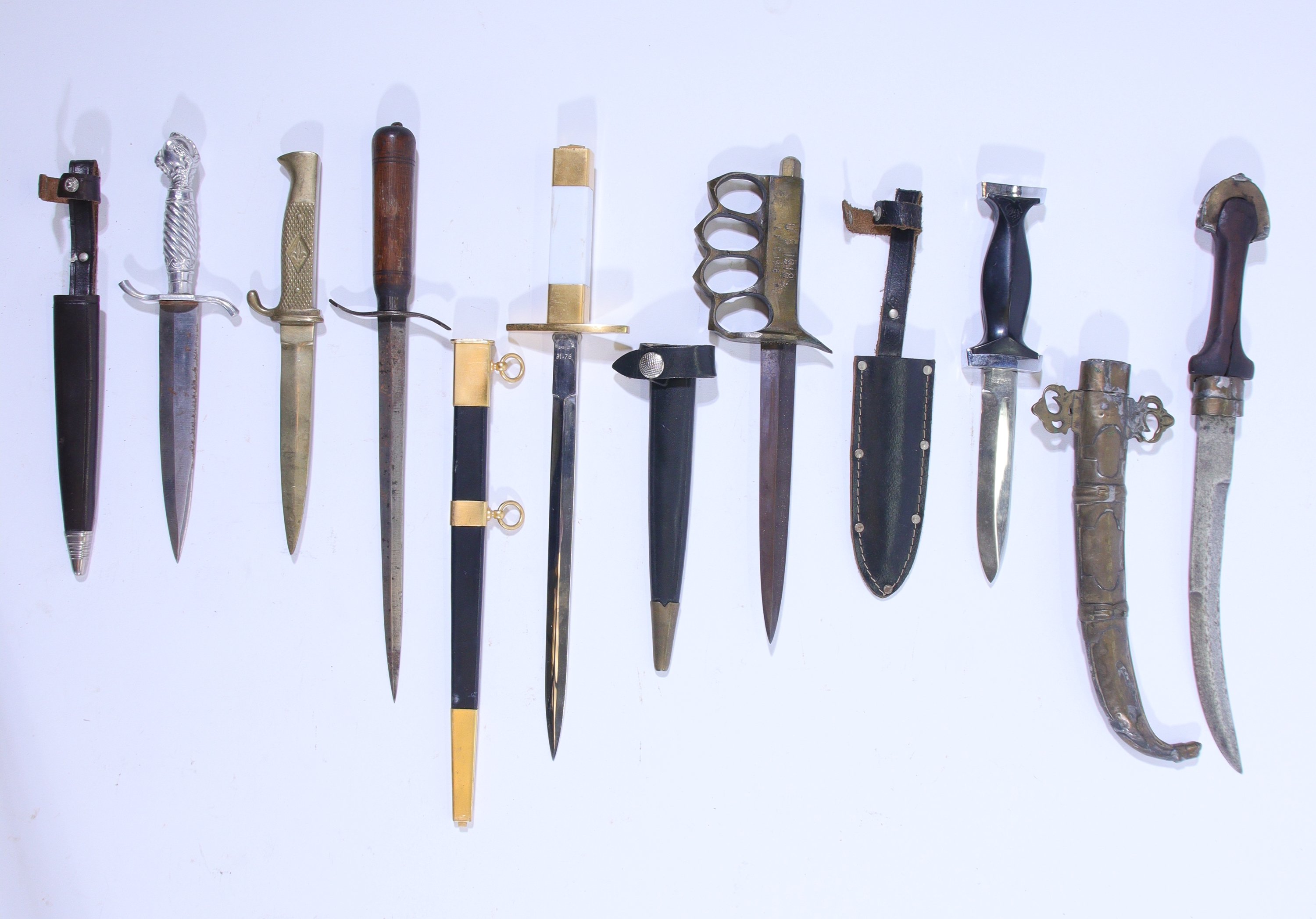 comprenant une copie de couteau de tranchée modèle 1918, quatre poignards et dagues, un poignard Koumia et une dague d’officier d’armée de l’air modèle 1934, fusée blanche et lame Ambert 91-76.