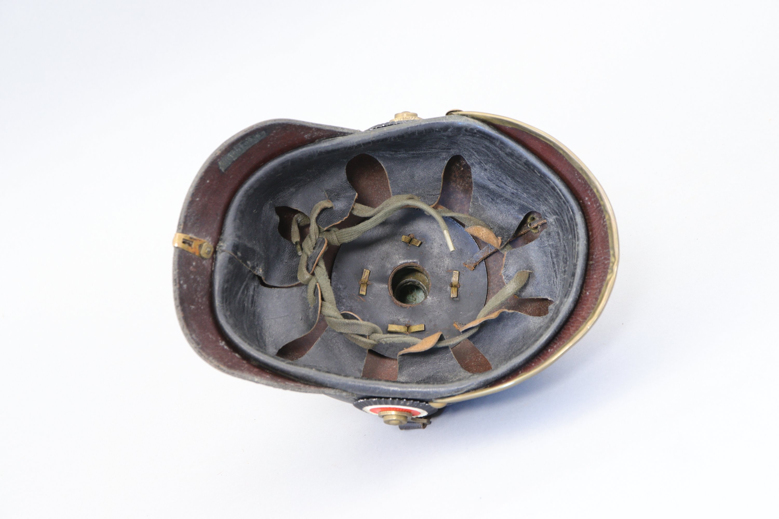 en cuir, plaque à l’aigle, cocardes et jugulaire postérieures, coiffe intérieure en cuir.