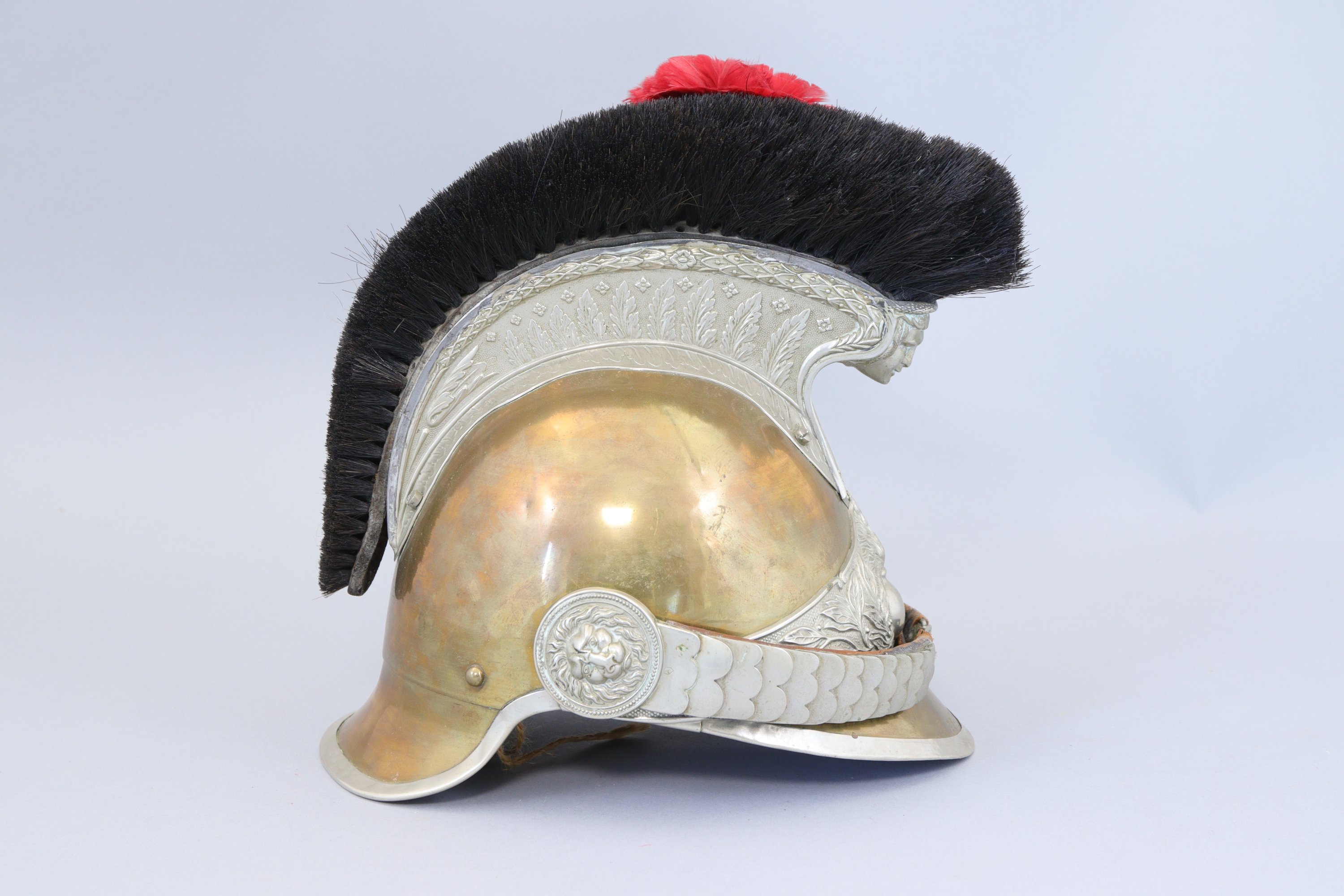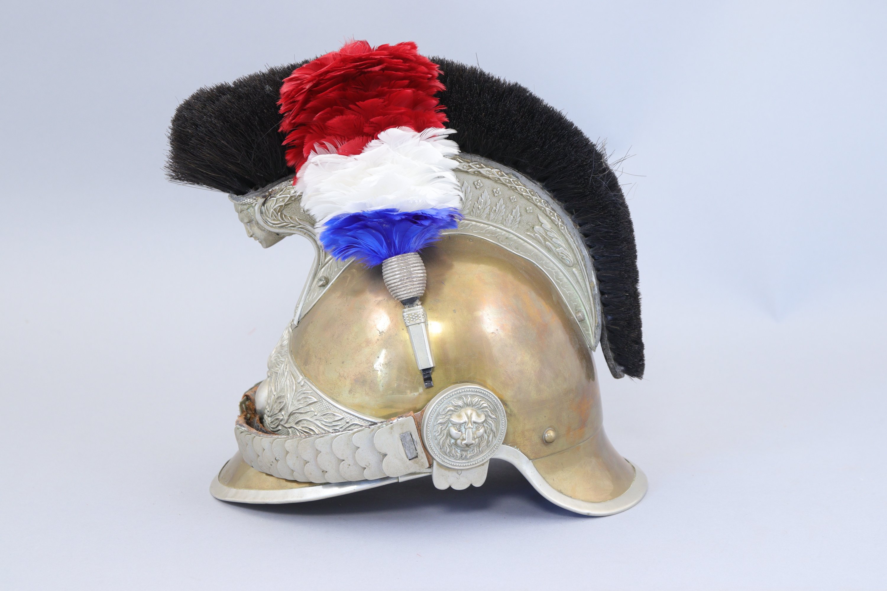 Cimier, bandeau à la grenade, jugulaires à écailles gainées de cuir et jonc en métal blanc. Brosse en crin noir, coiffe intérieure en cuir noir. Plumet tricolore.