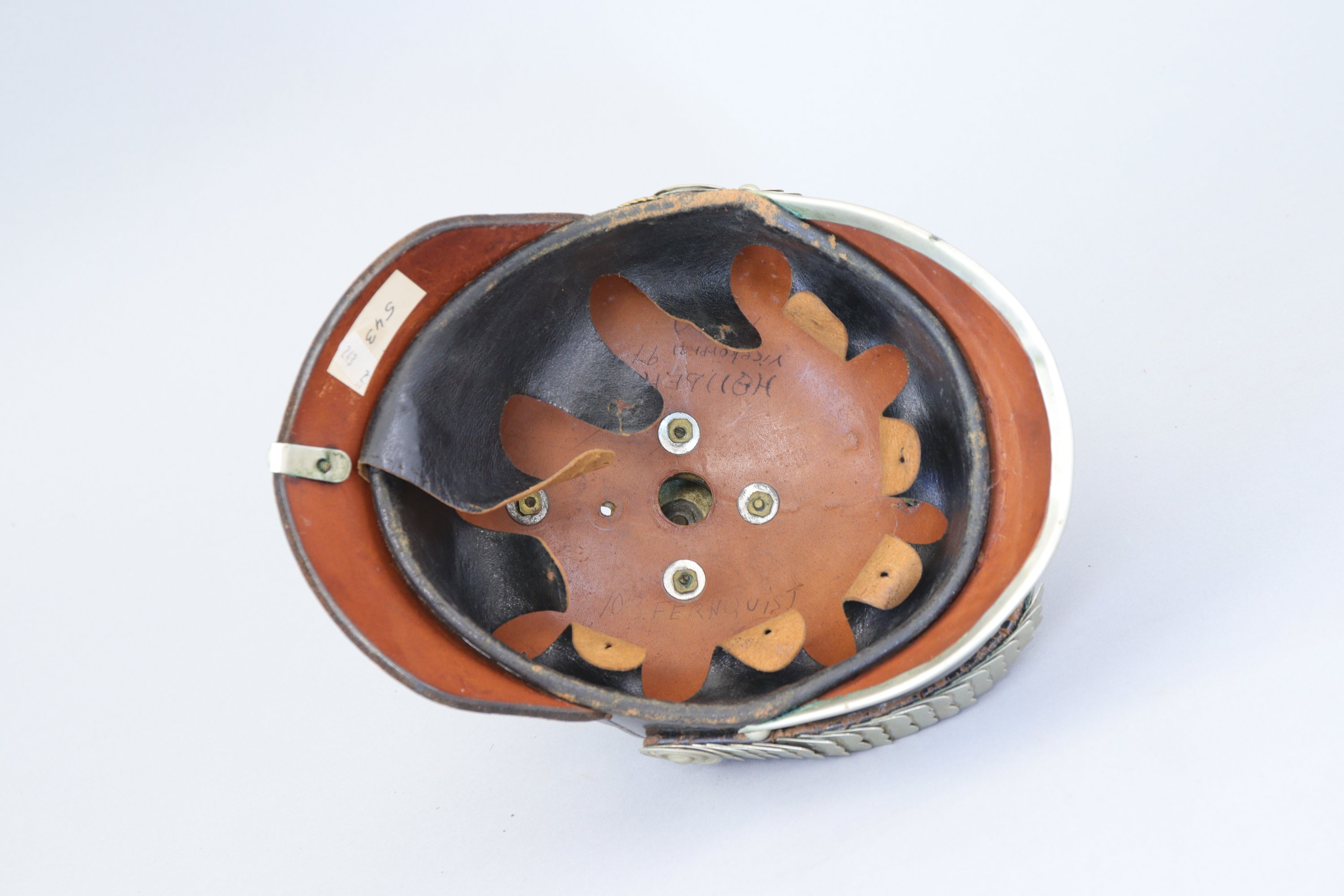 Bombe en cuir verni à motif au chiffre « 3 » doré sur le côté droit. Garnitures en cuivre argenté et laiton, coiffe intérieure en cuir noir, nominatif daté 1930. Cocarde en laiton.
