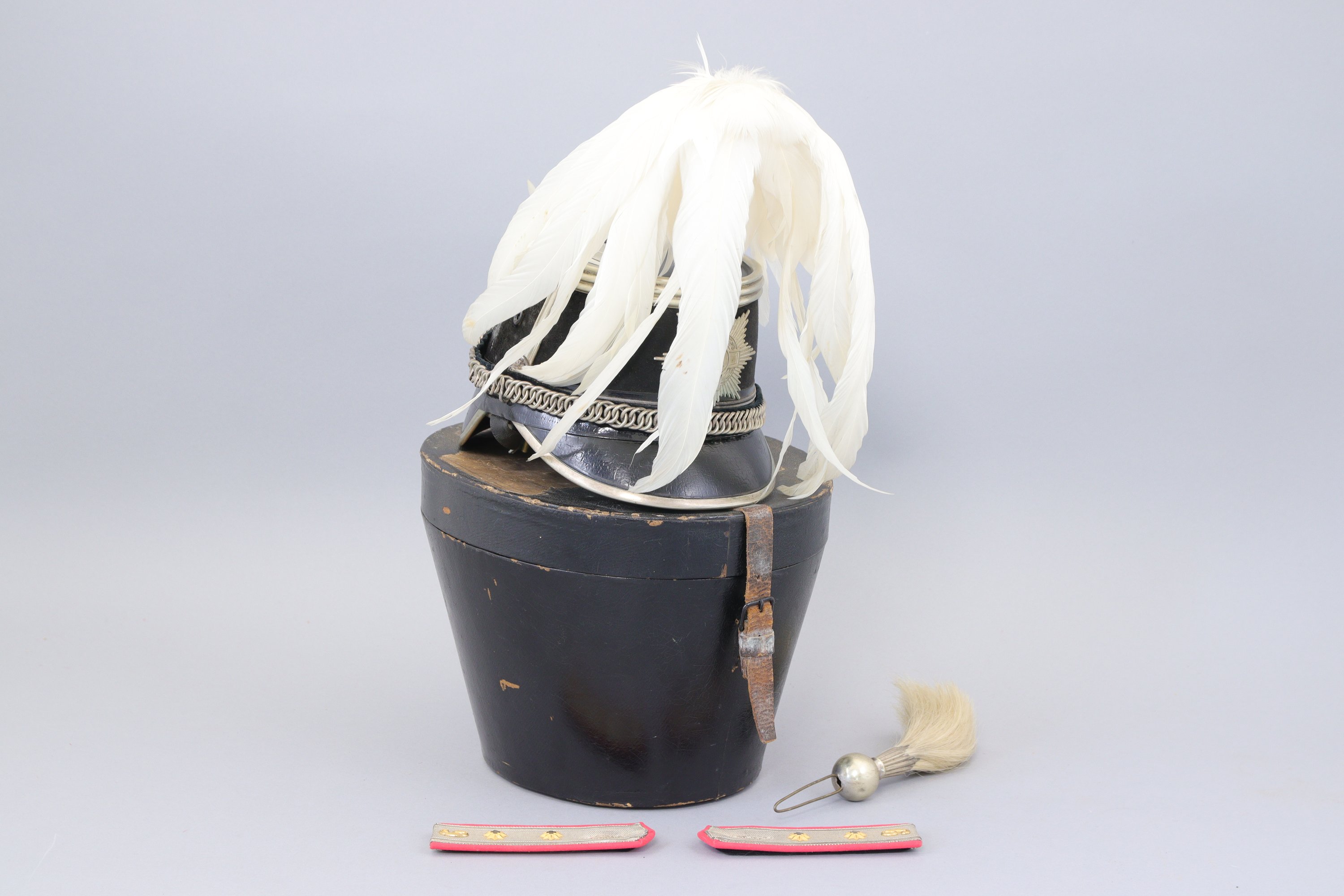 Dans sa boite de transport avec pattes d’épaules à deux étoiles. Plumet en plume blanche et aigrette en crin blanc.