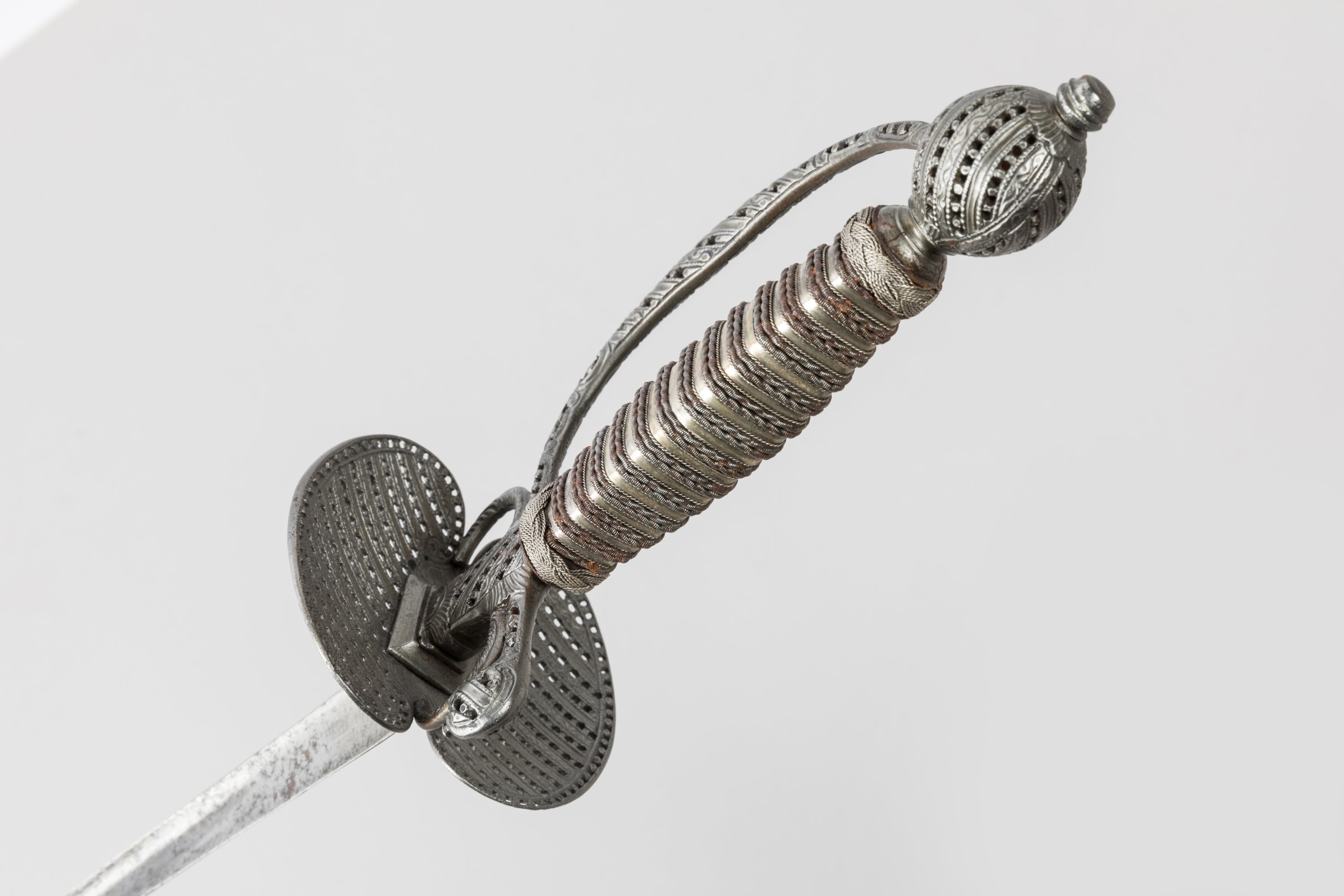 Monture en fer ciselé repercé. Garde à une branche, pas d’âne et coquille. Fusée filigranée de fer et lamée de cuivre. Lame triangulaire.
