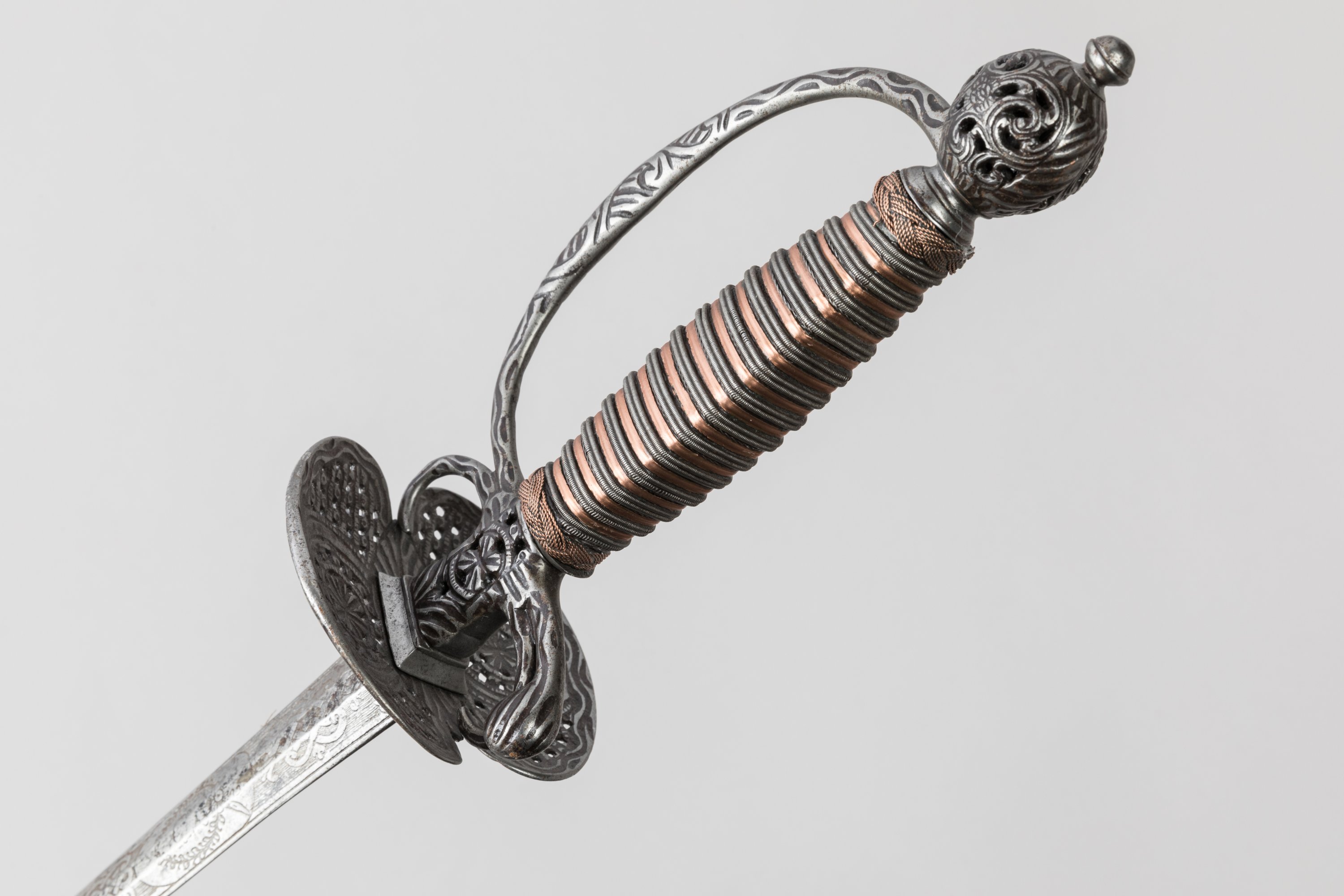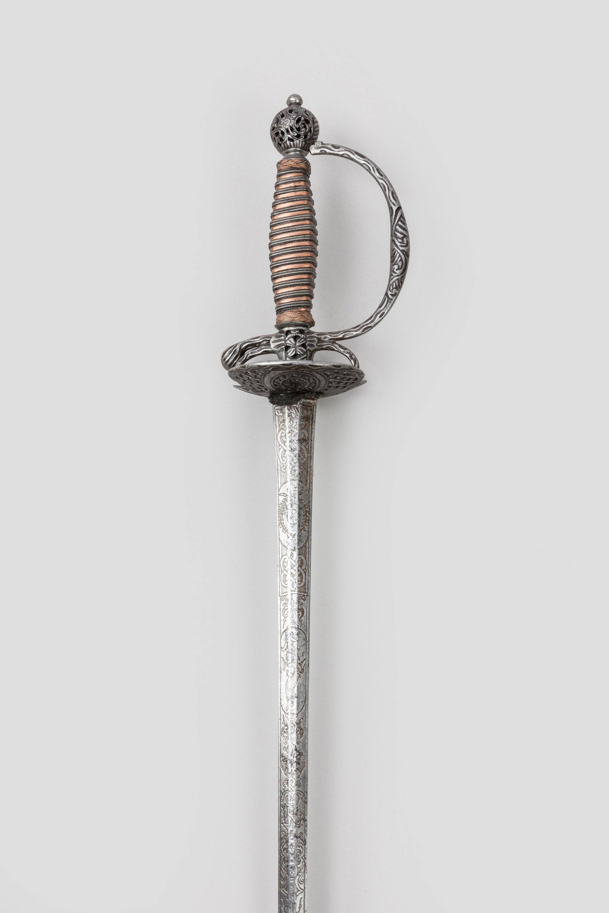 Fusée filigranée de fer et de cuivre. Monture en fer ciselé, garde à une branche, pas d’âne et coquille à jours à décor de fleurs. Lame à méplat médian entièrement gravée de médaillons, rinceaux et trophées avec restes de gravure « Soli deo ».
