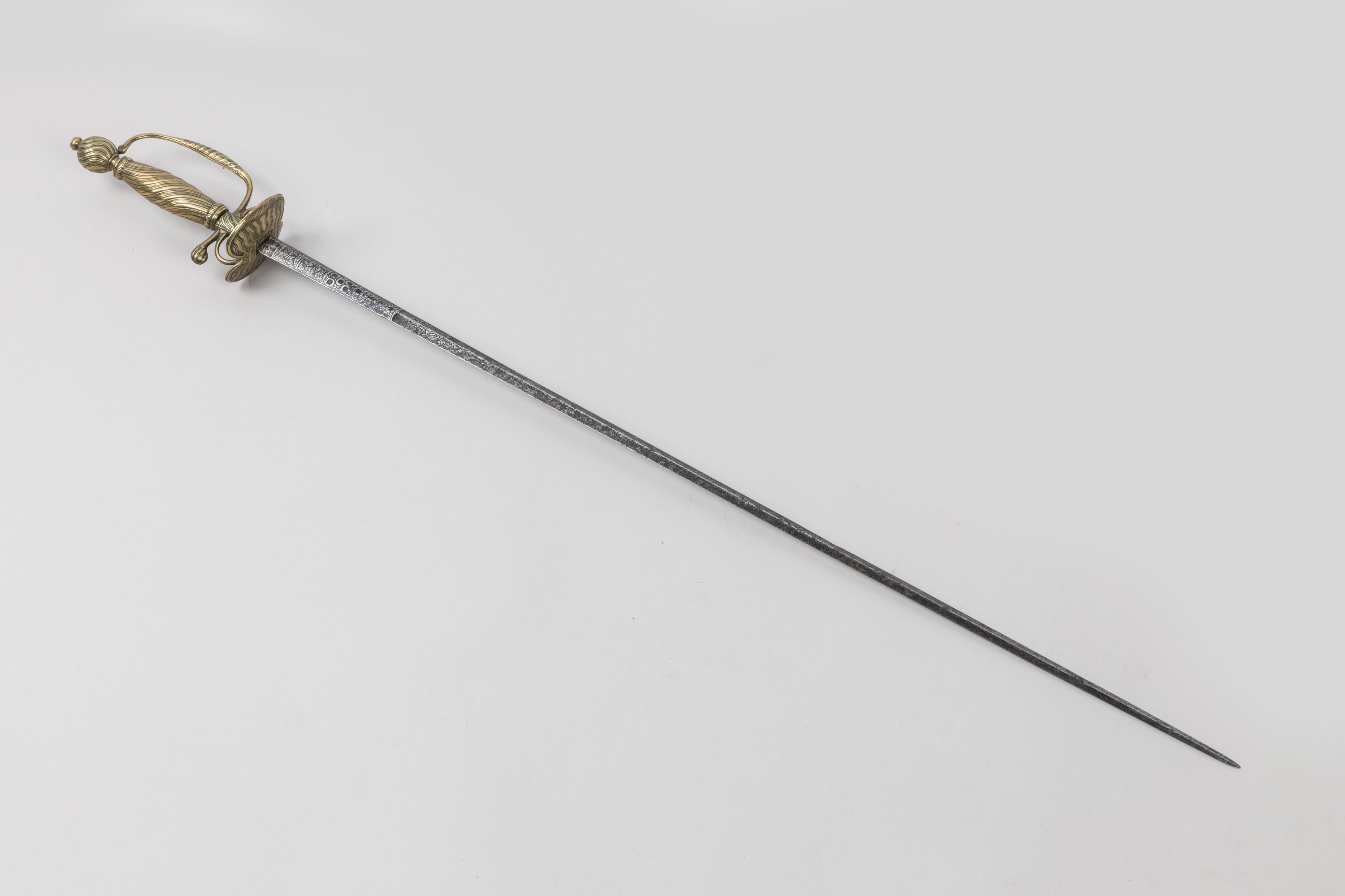 Monture en laiton ciselé. Pommeau rond, fusée, branche de garde, pas d’âne, coquille à décor rainuré. Lame arrondie au talon, gravée au tiers et à arête médiane.