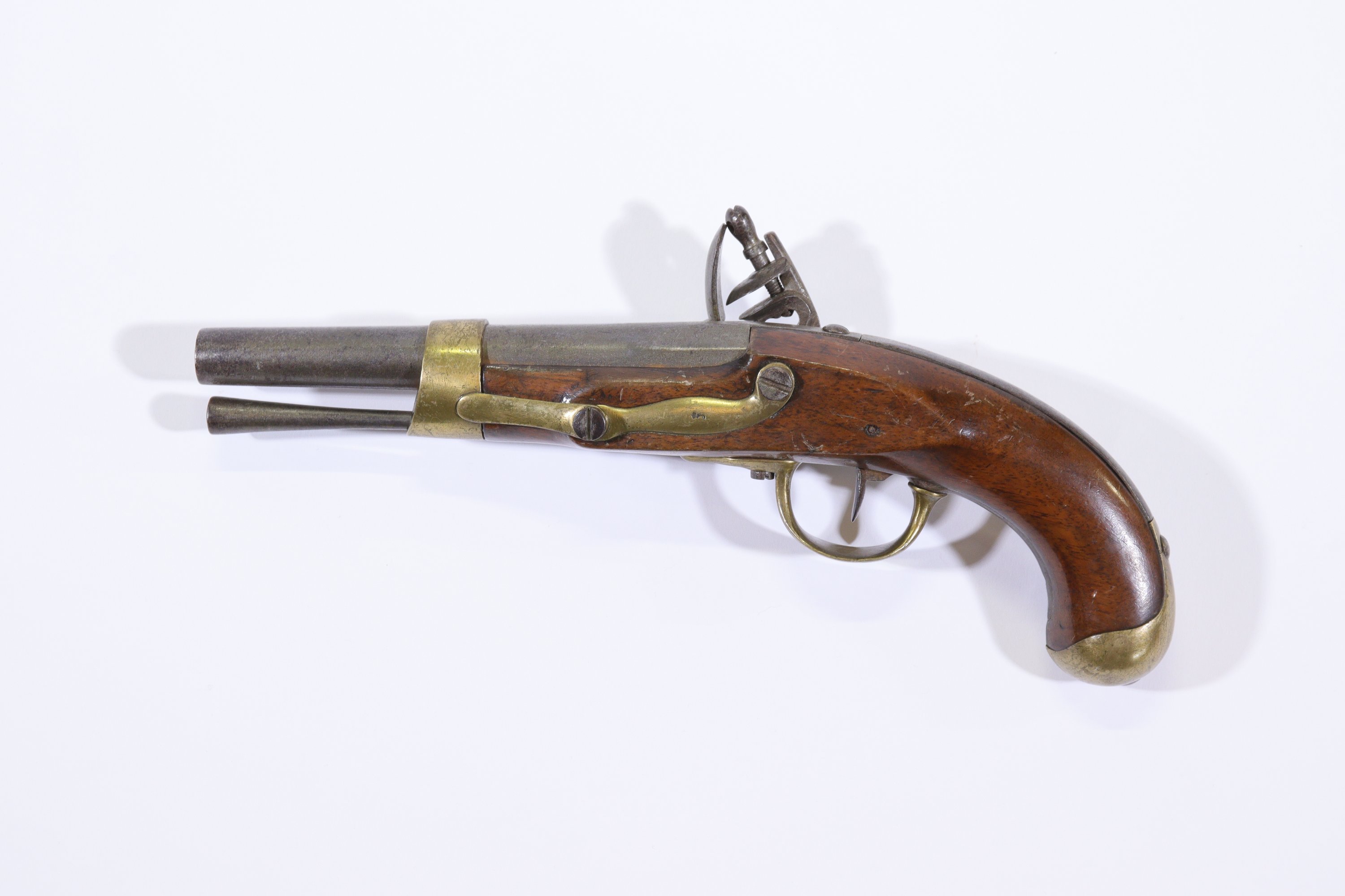 Canon rond à pans au tonnerre, non marqué. Platine avec traces de marquage, chien à corps rond. Garnitures en laiton poinçonné.