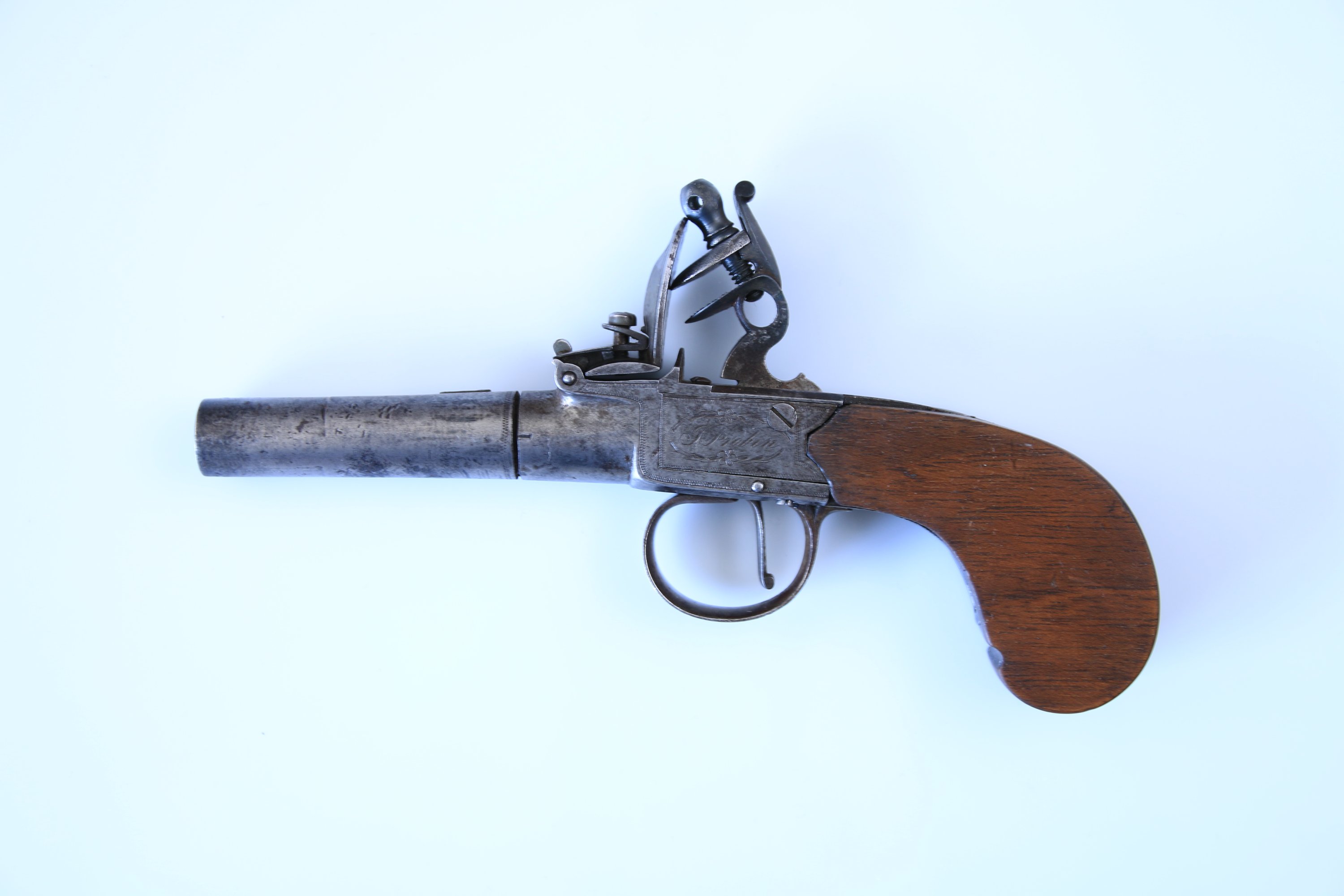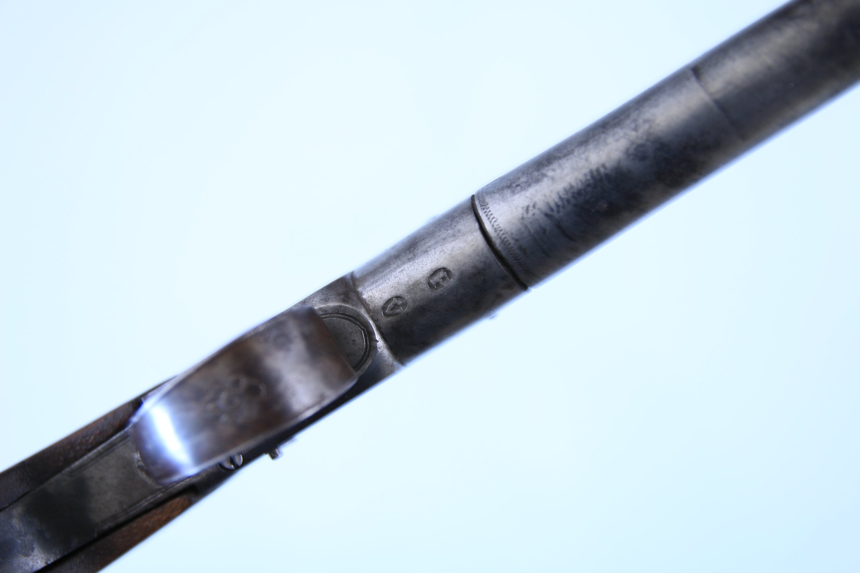 Canon rond à balle forcée et coffre signé « Probin », en fer. Poinçons d’épreuve anglais. Détente sous pontet. Crosse en noyer.